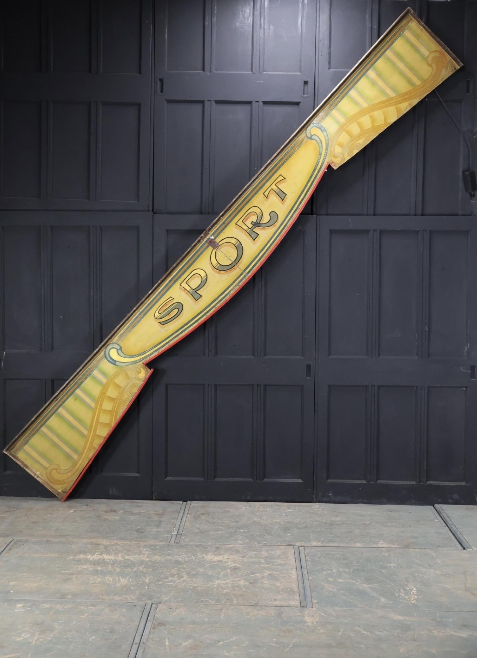 A huge, hand painted wooden fairground sign, dating from the 1920s with the central word SPORT.