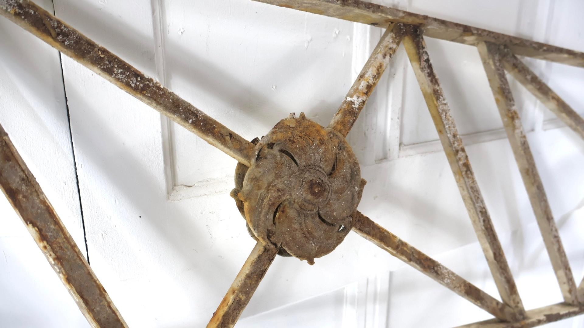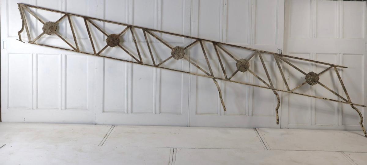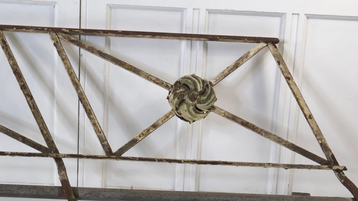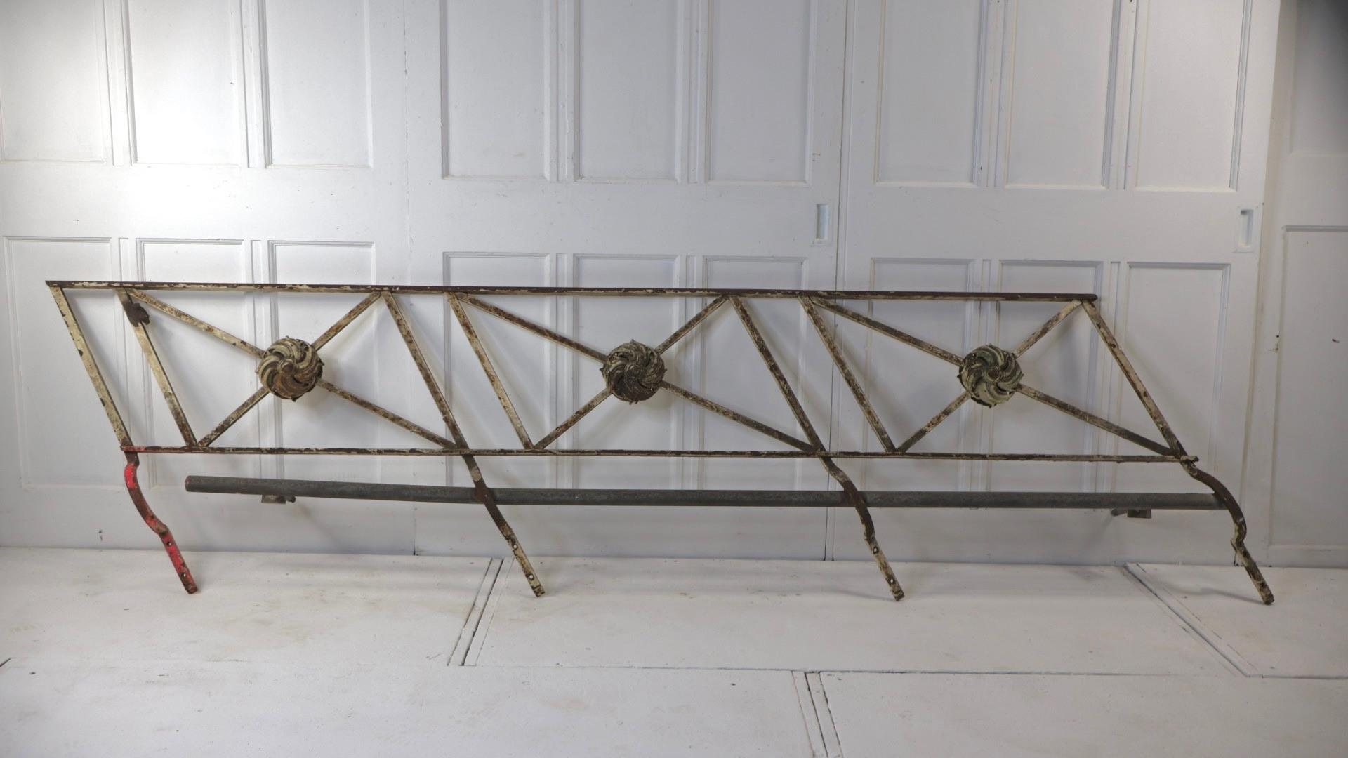 A pair of mid 19thc decorative hand/ balcony rails, constructed from a solid metal frame creating a cross pattern in each panel, decorated with a central motif.
