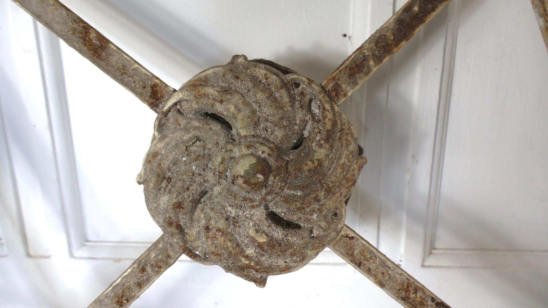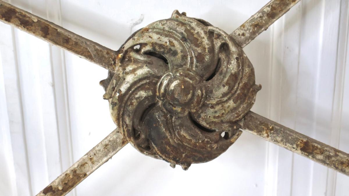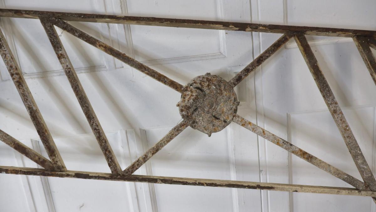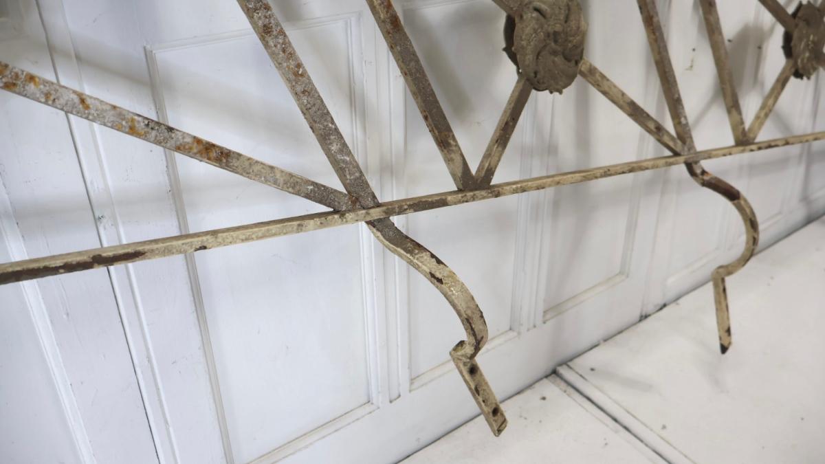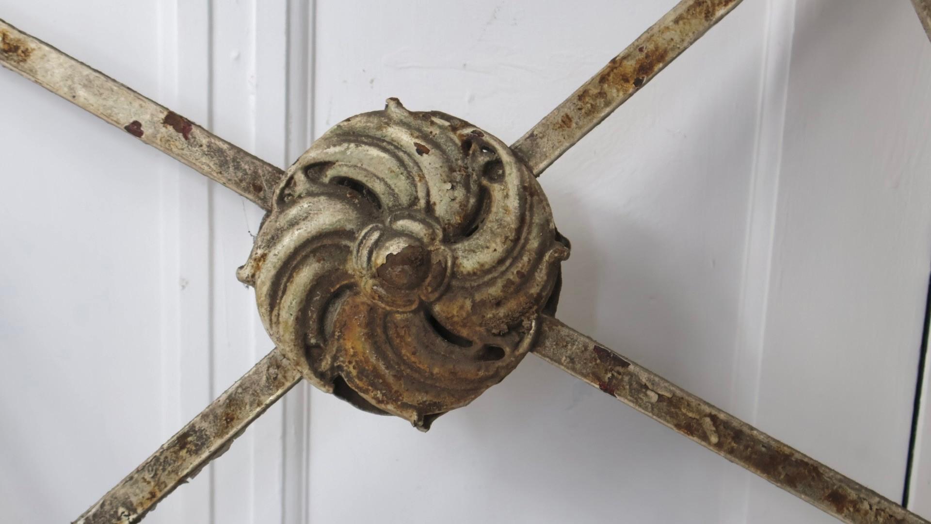 A pair of mid 19thc decorative hand/ balcony rails, constructed from a solid metal frame creating a cross pattern in each panel, decorated with a central motif.