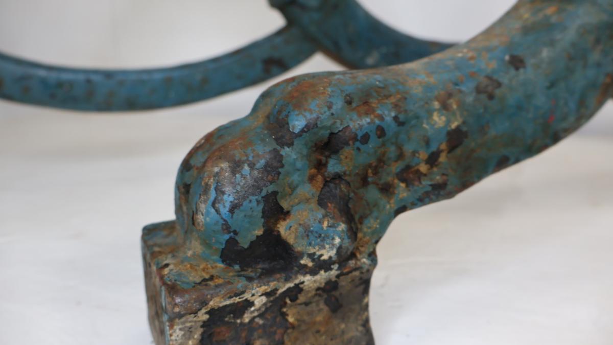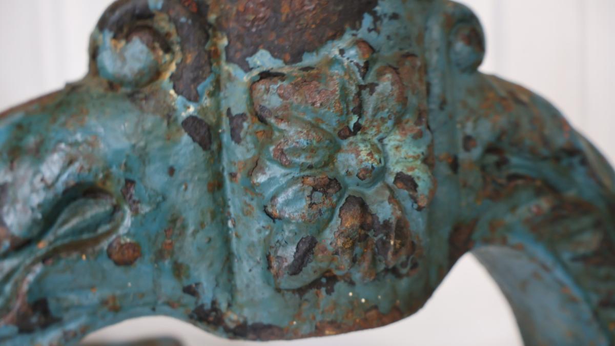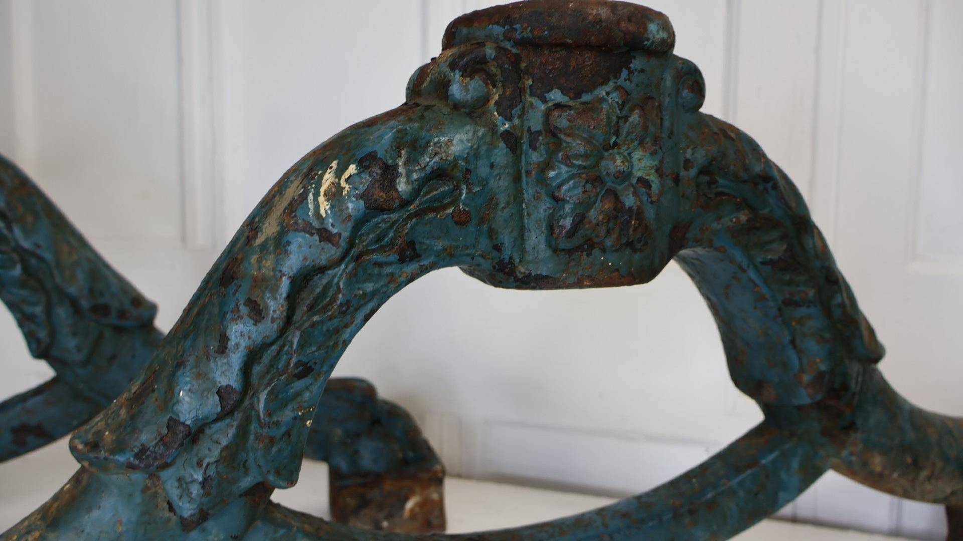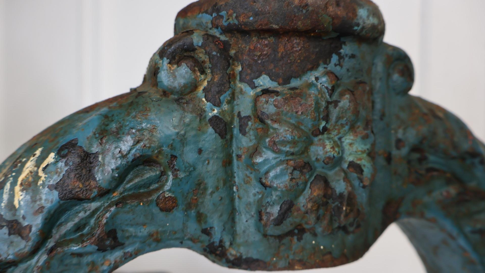 Retaining the original blue paint, with decorative embossed detail and claw feet.