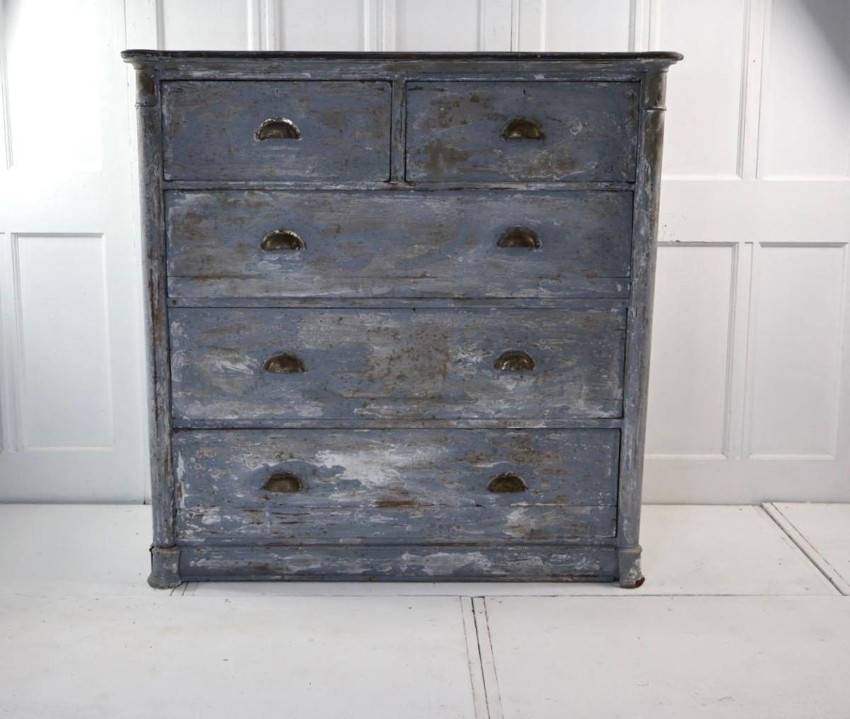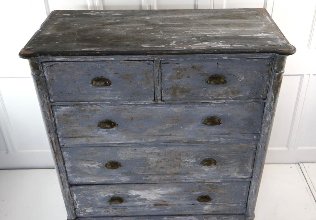 A 19thc tall pine chest of drawers, with a decorative crackled grey paint finish and an ebonised top.