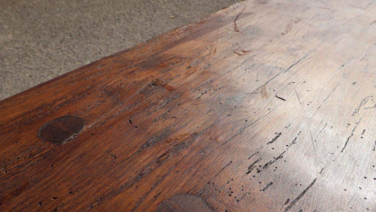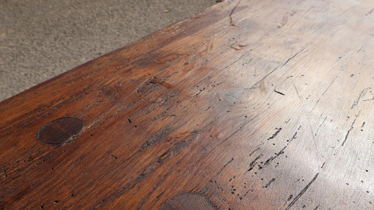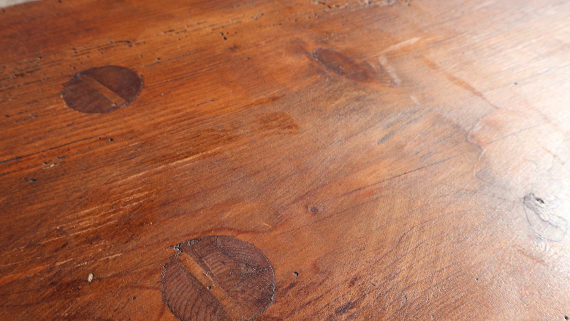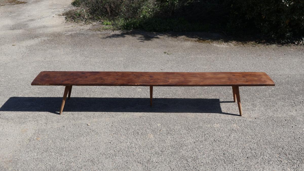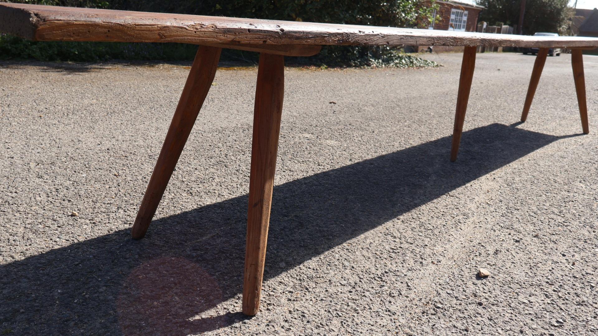 A huge, just under 11 ft long, 19thc pine bench sitting on 5 original tapered legs hand pegged into the single plank top.