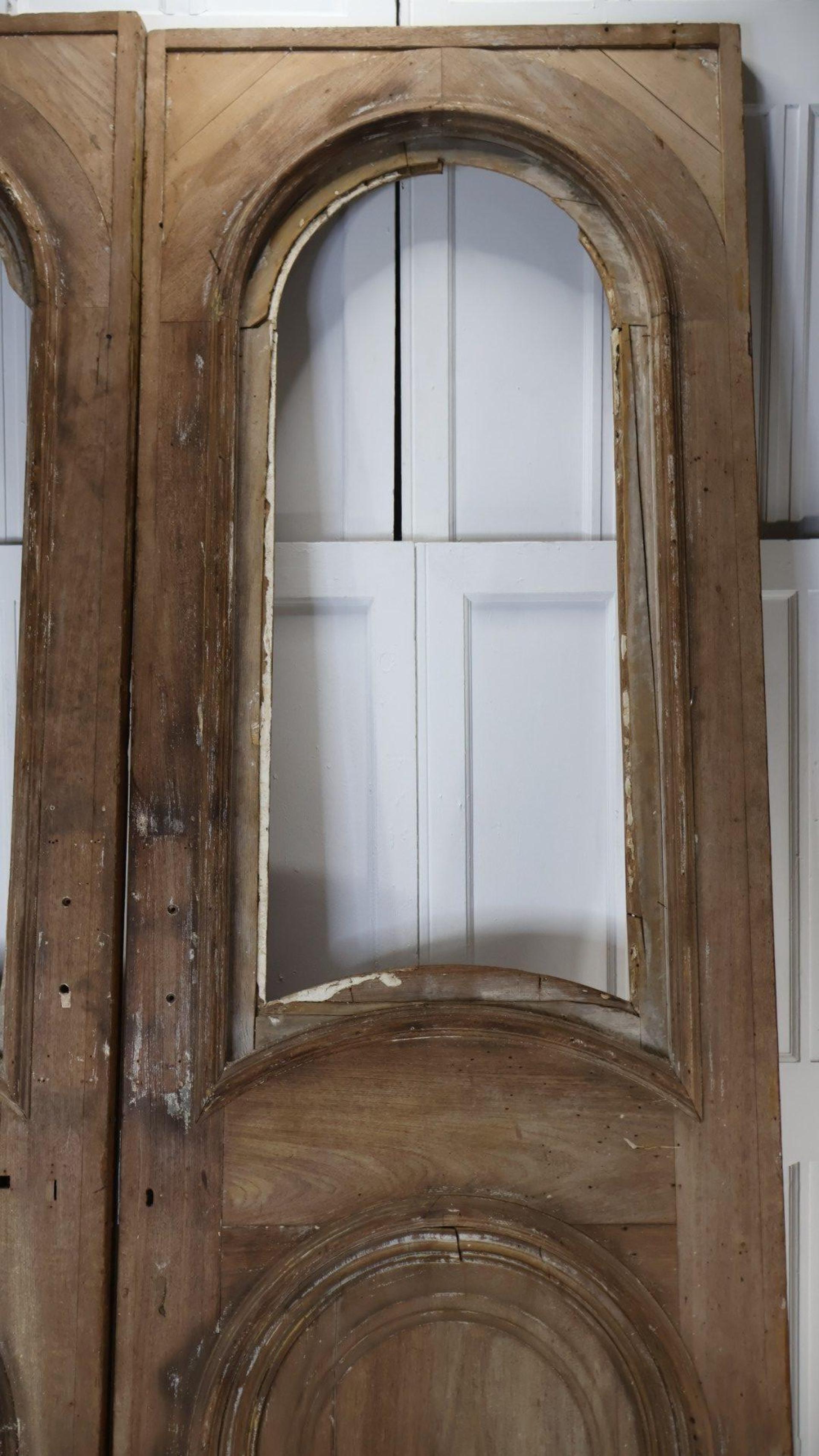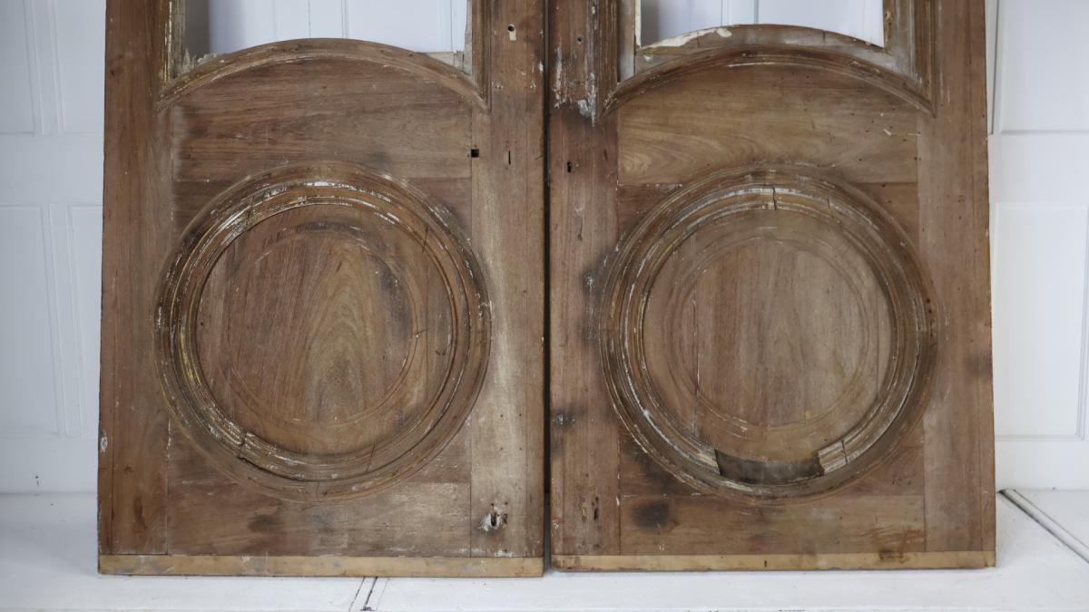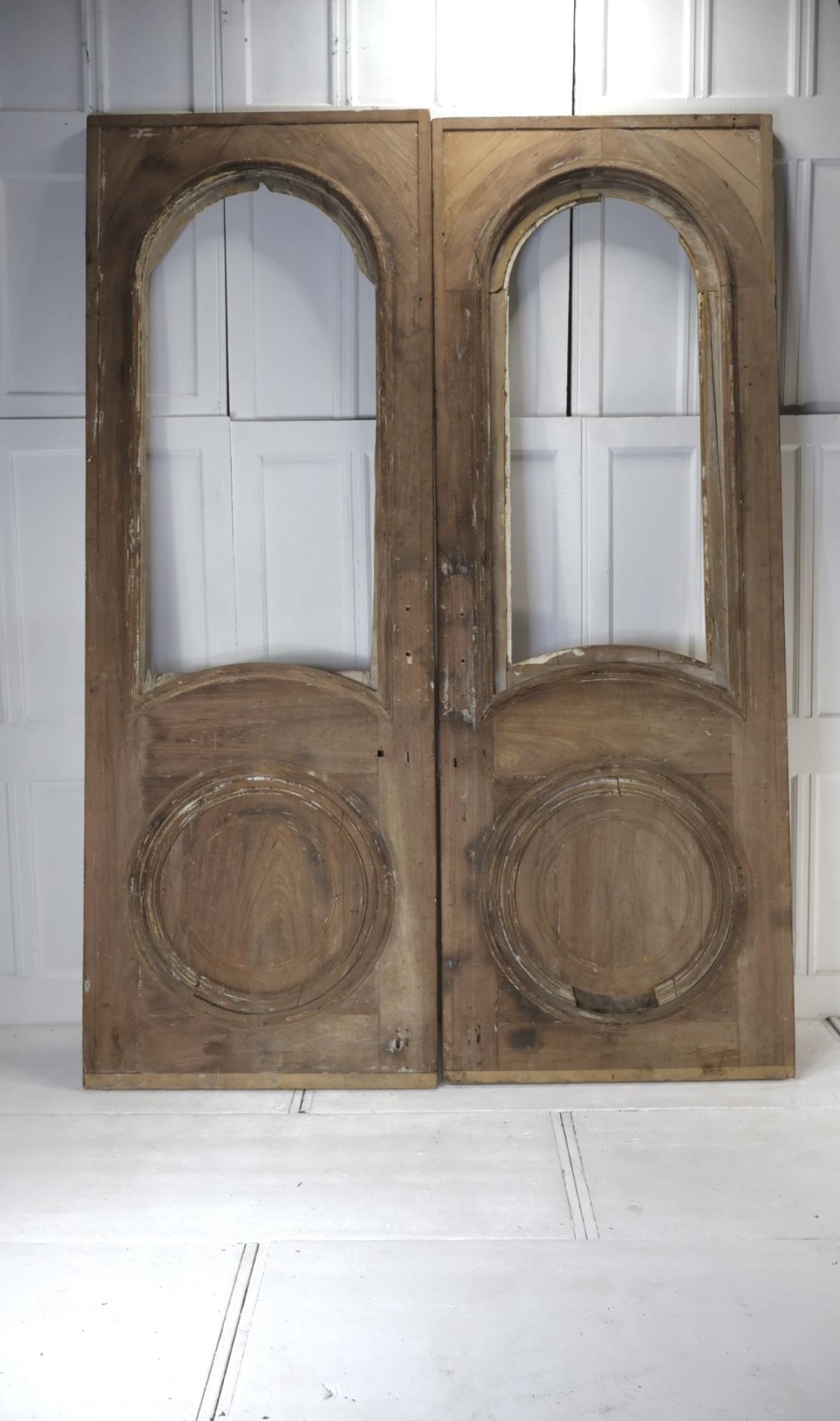 English, 19thc incredibly well made double doors, comprising of an arched glazed top (currently unglazed) with a decorative circular bottom panel.