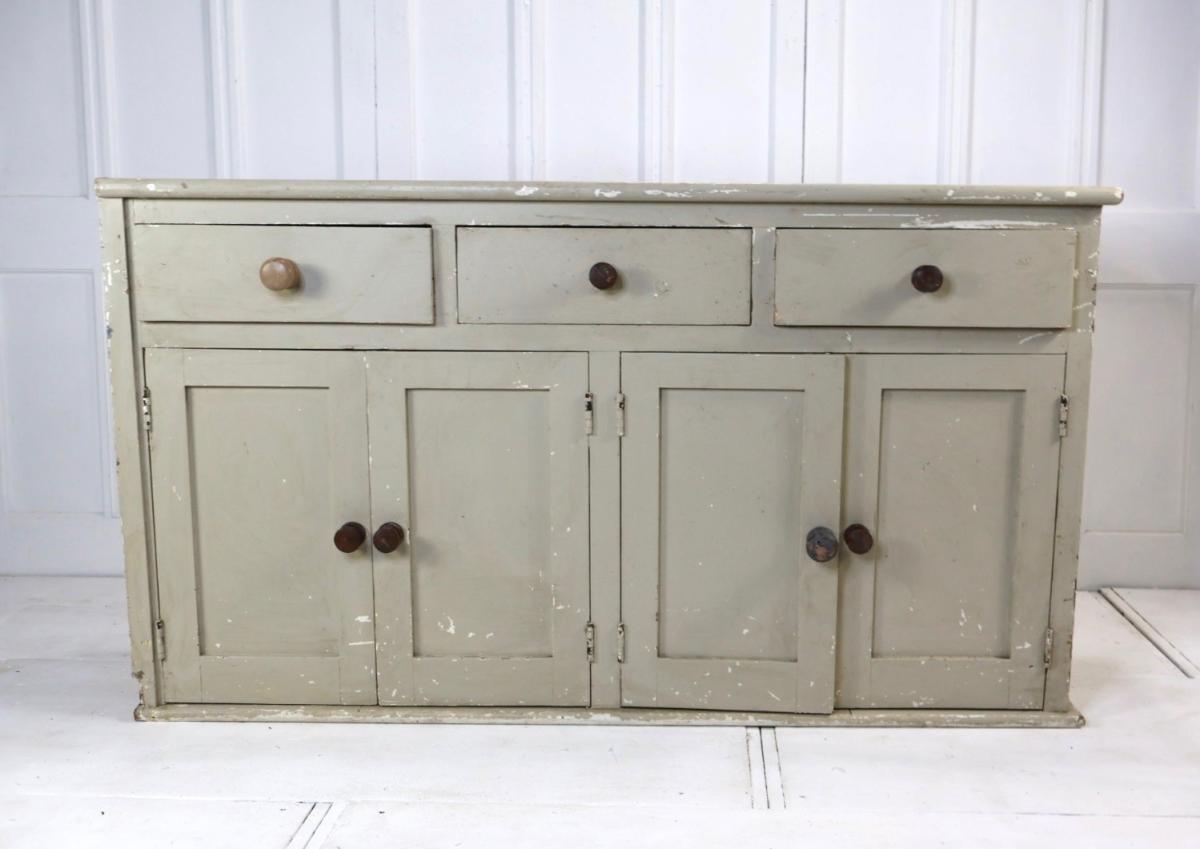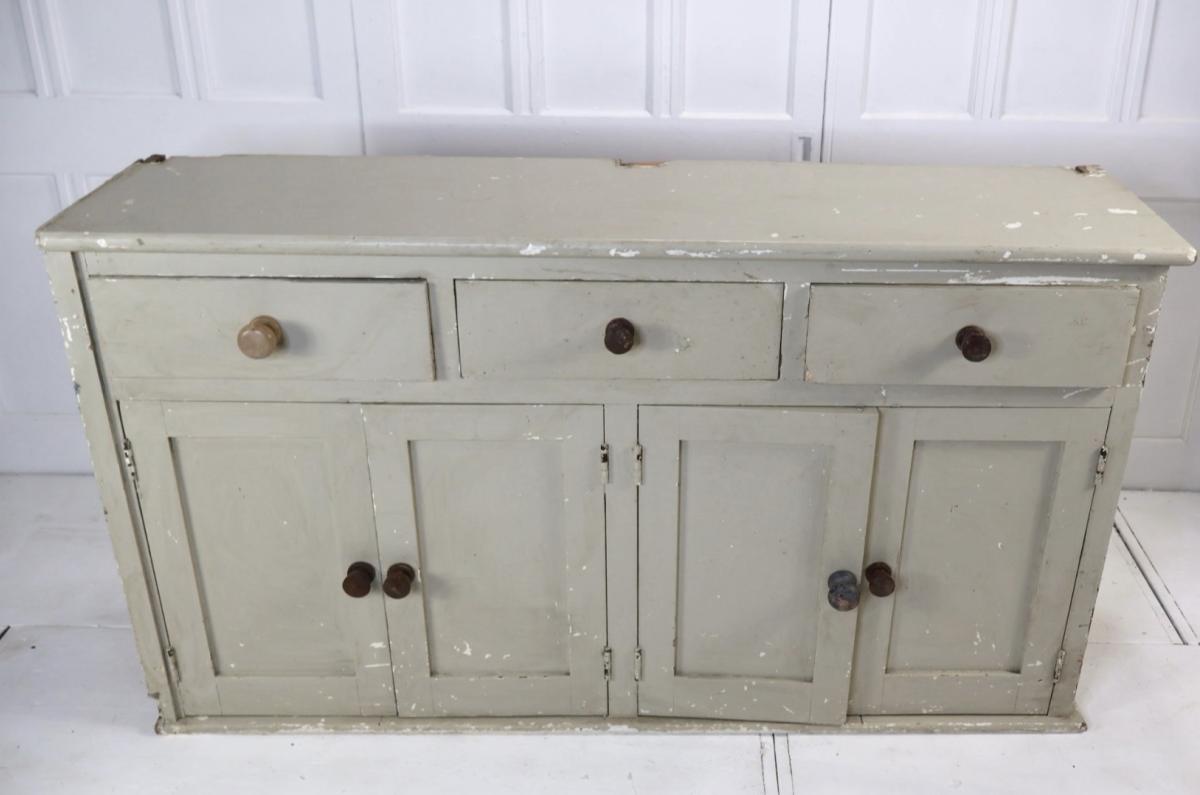 A solid heavy pine country house dresser base, with layers of old paint and a mismatch of wooden knobs.