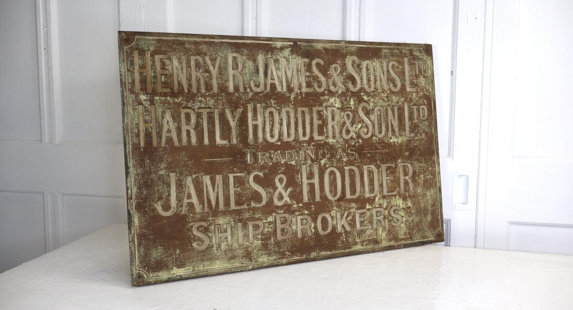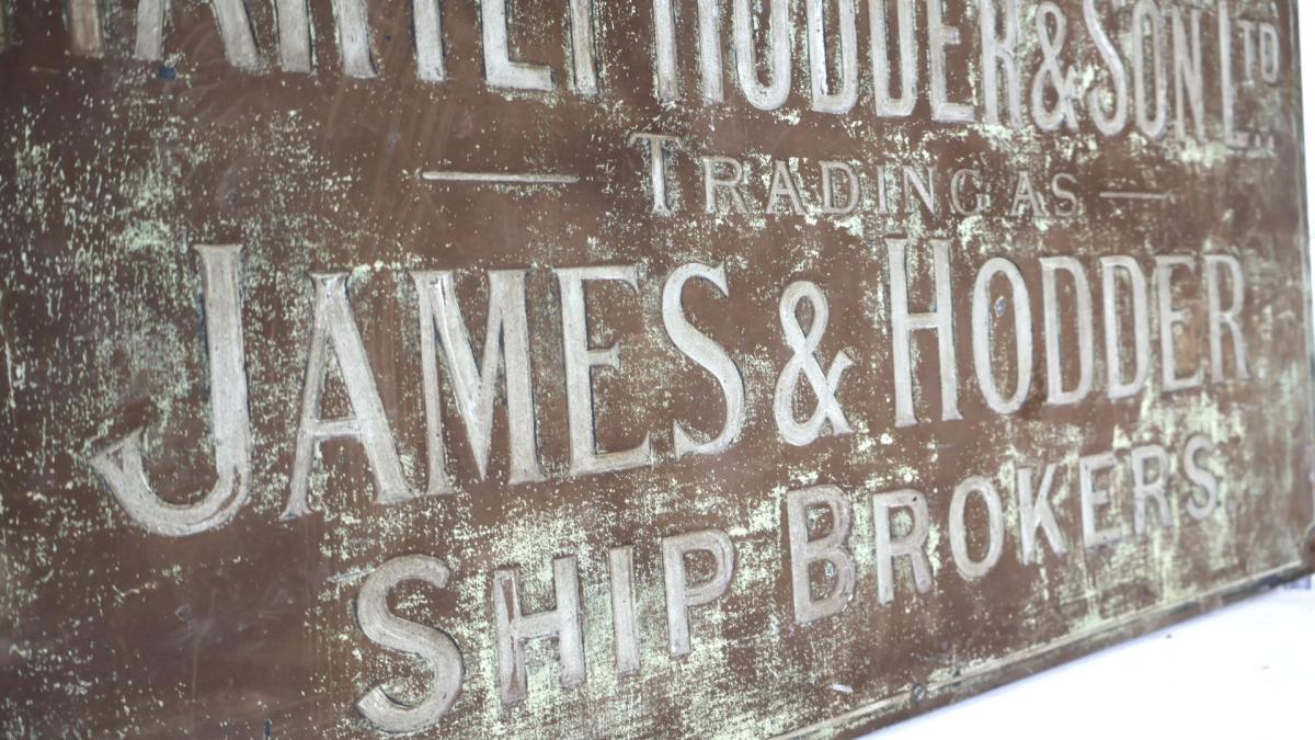 A decorative piece of social history, solid brass advertising sign offering the service of James & Hodder, trading as ship brokers in the 19thc.
