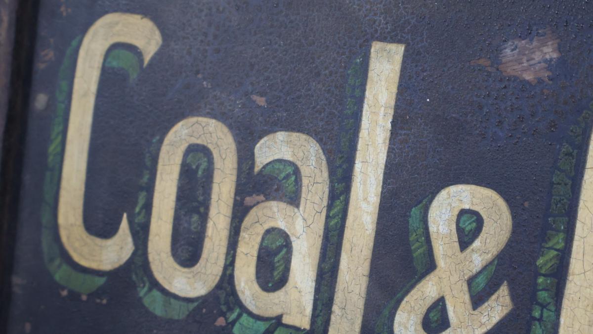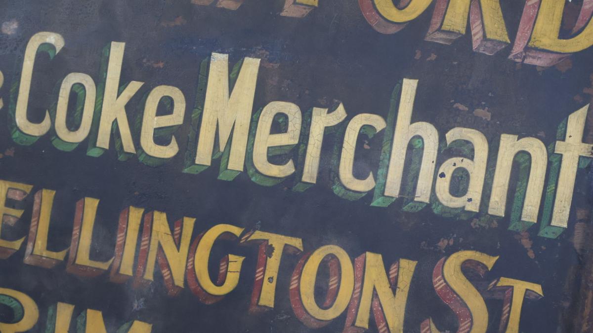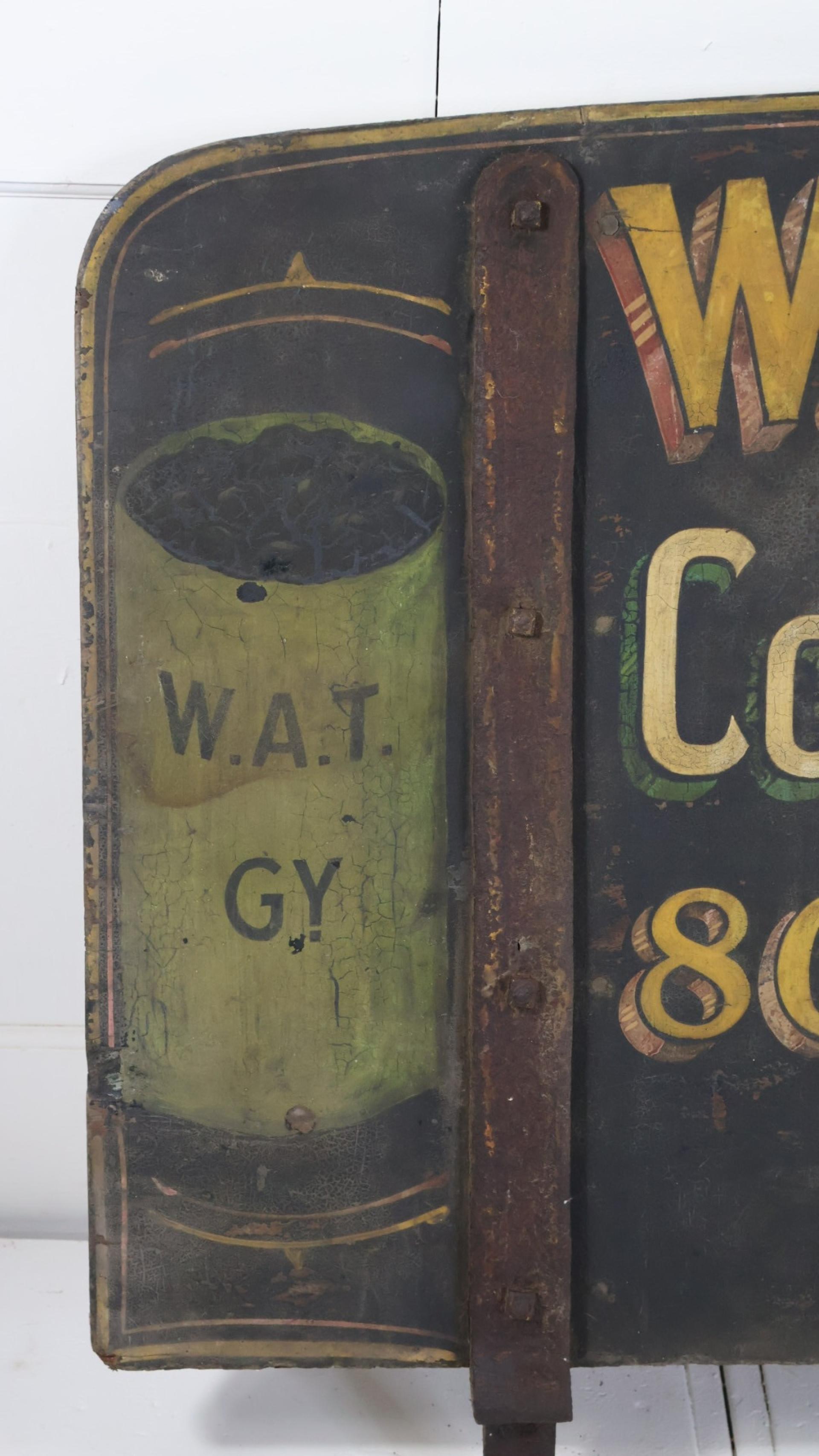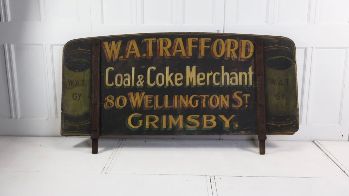 A 19thc original, hand painted trade sign from a horse drawn cart, advertising W.A. Trafford, a coal and coke merchant from Grimsby, North England.