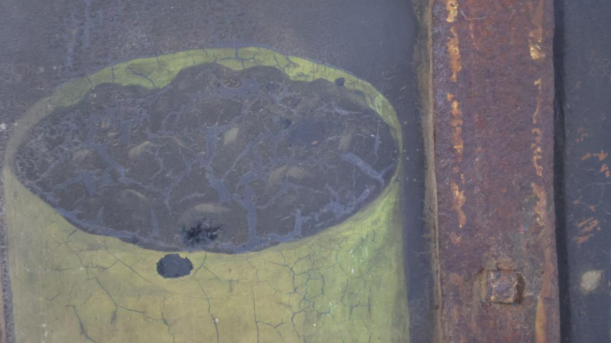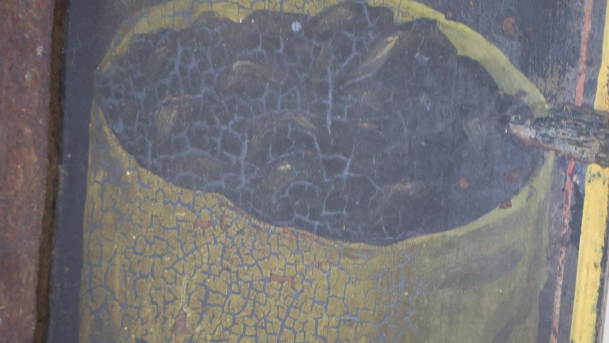Decorative shadow font, still retaining vibrant colour and images, with a decorative crazed staged finish to the old paint.