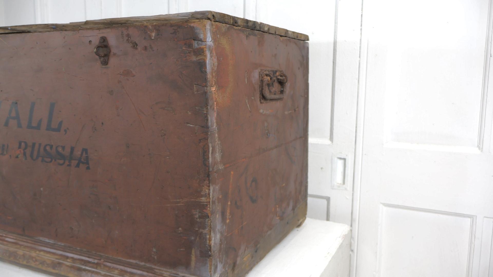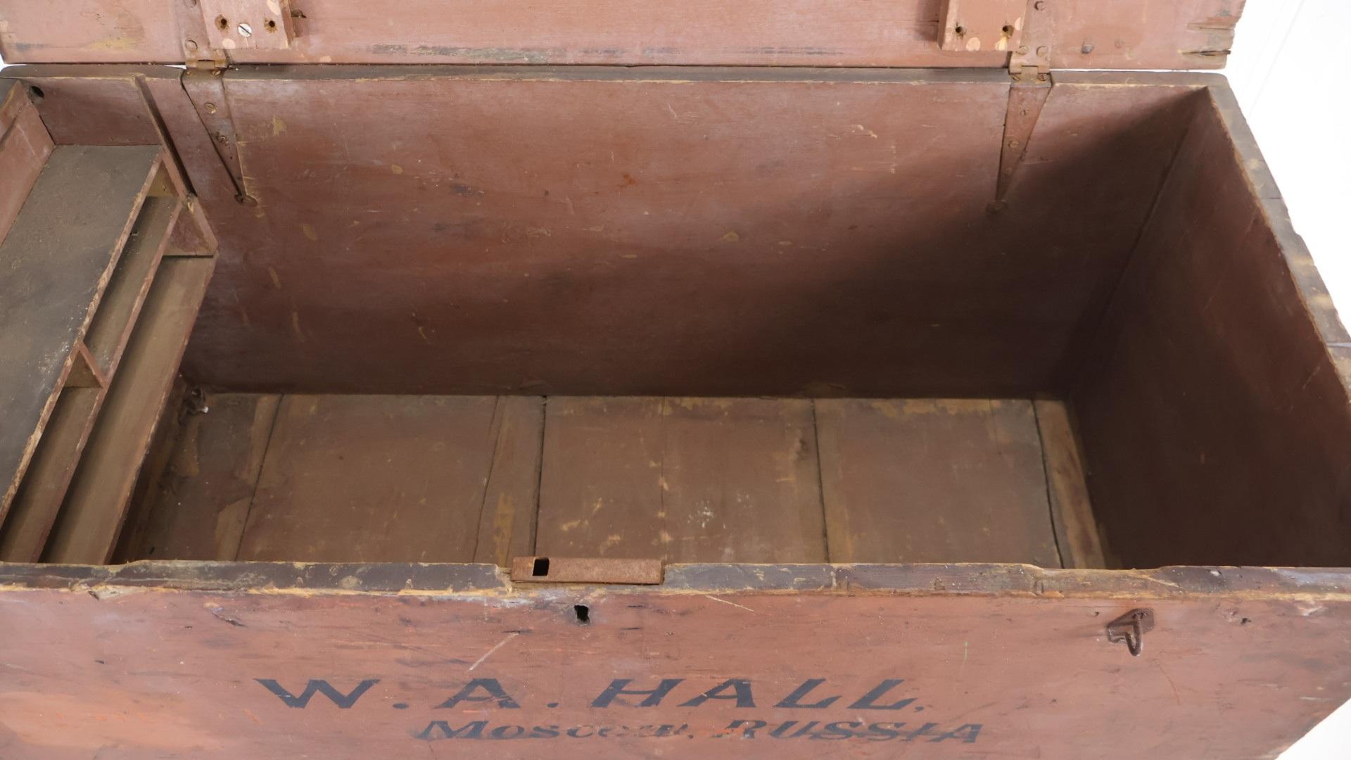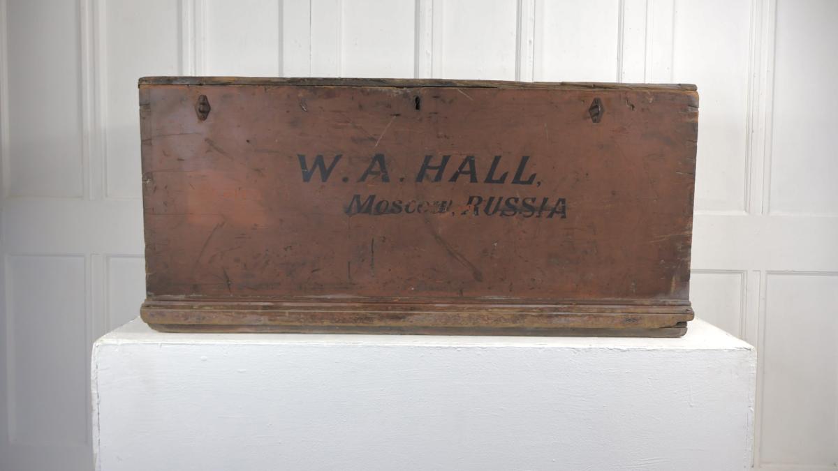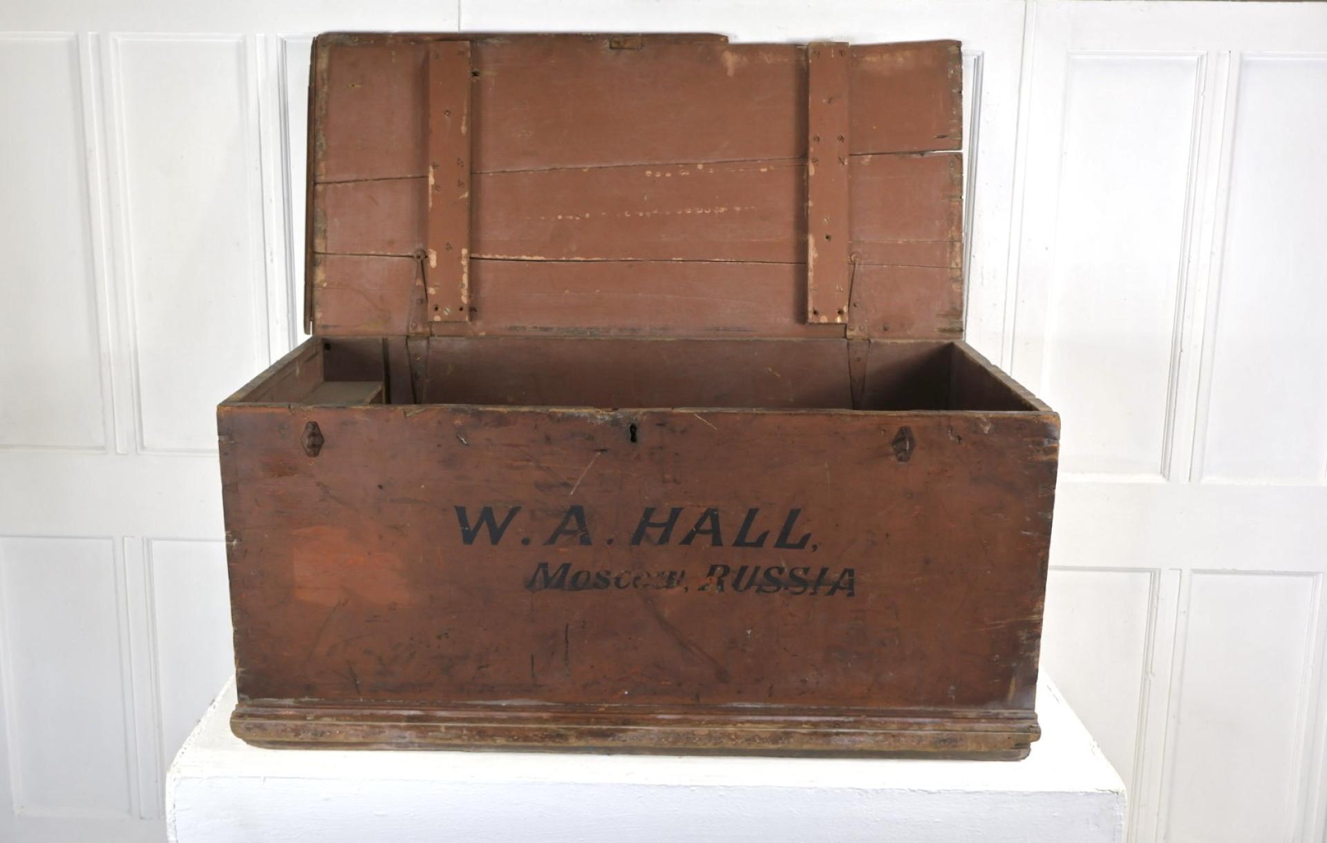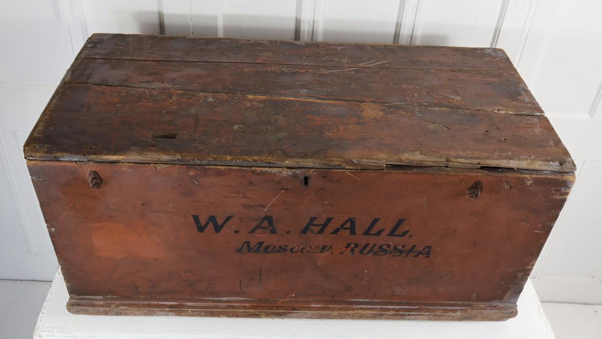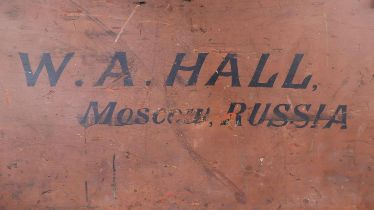 With the unusual wording of “Moscow Russia” and the travellers name WA Hall hand painted on the front.