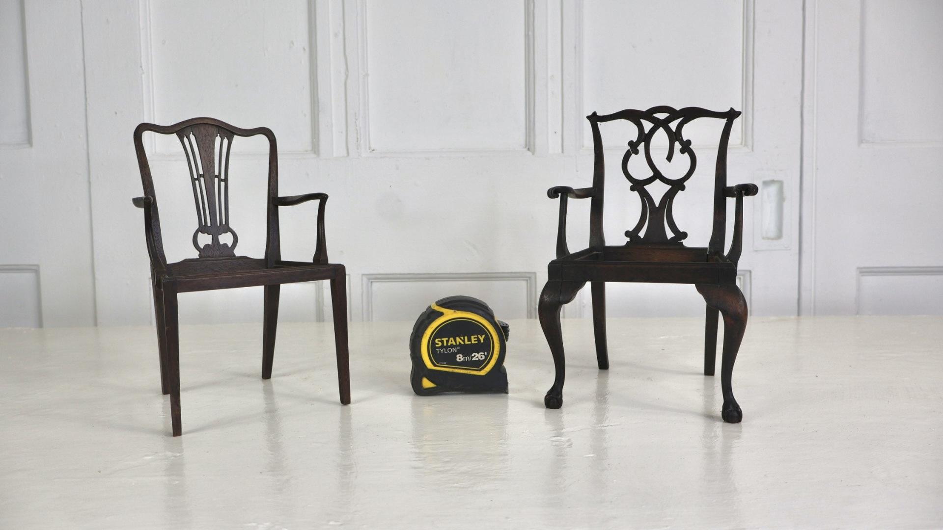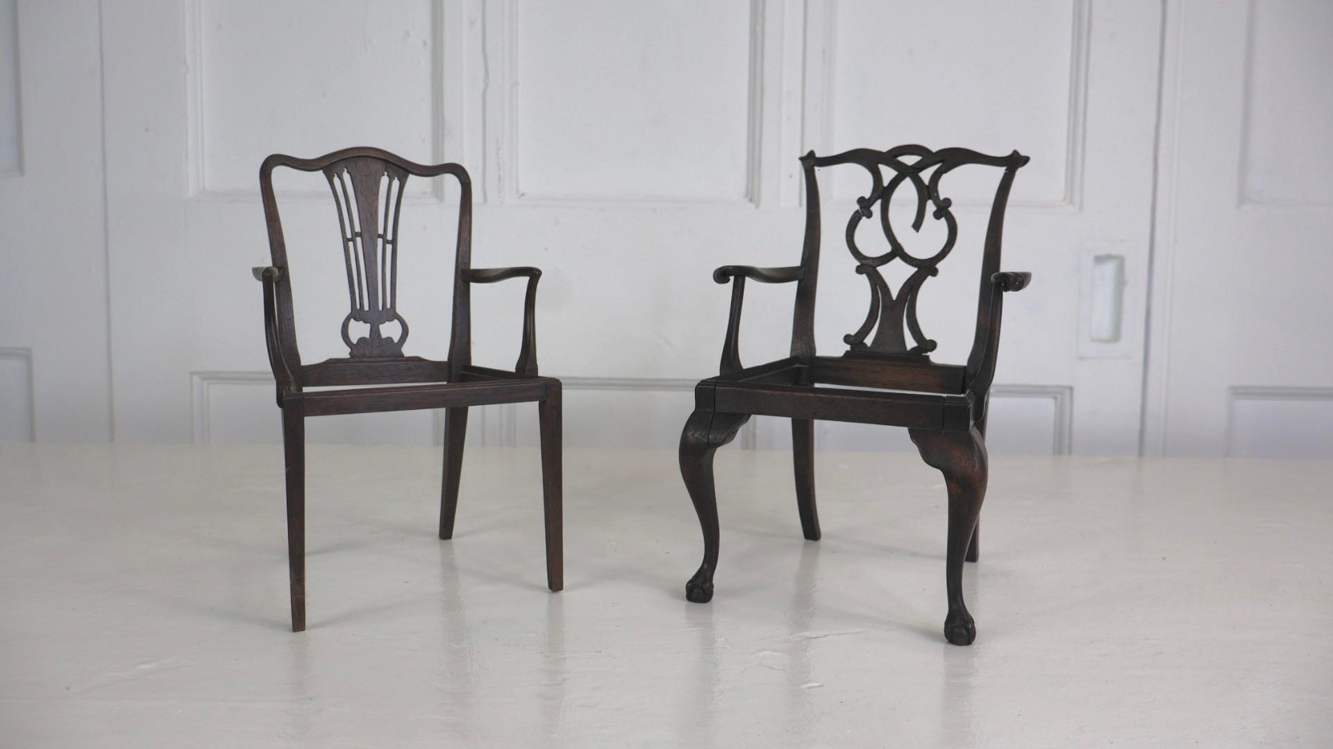 Incredible quality exact scale models of the full size chairs, depicting a Chippendale and a Hepplewhite chair.