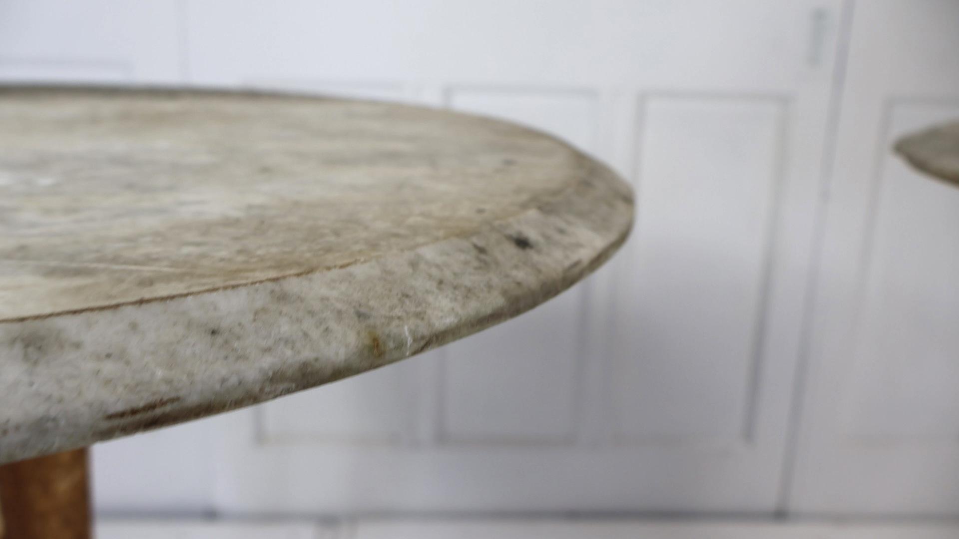 Each table has a solid and nicely weathered Carrera marble top, and both are in good solid condition, with some signs of age appropriate wear.