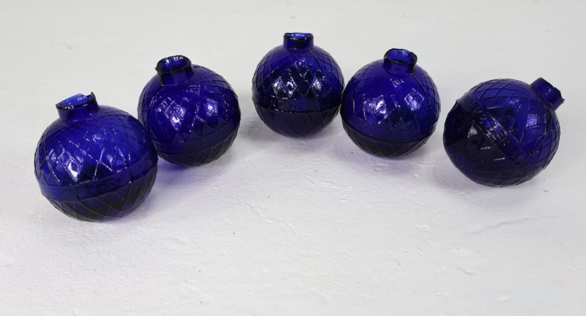 A run of 5 glass target balls, dating from the mid 19thc, predecessors for clay pigeons.