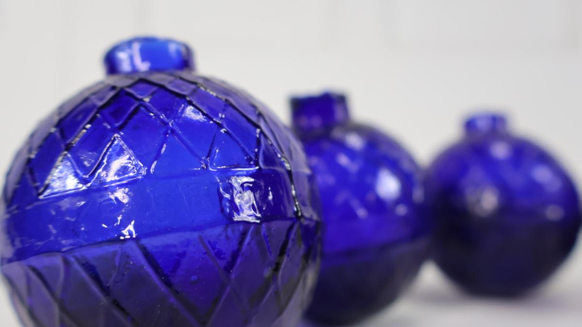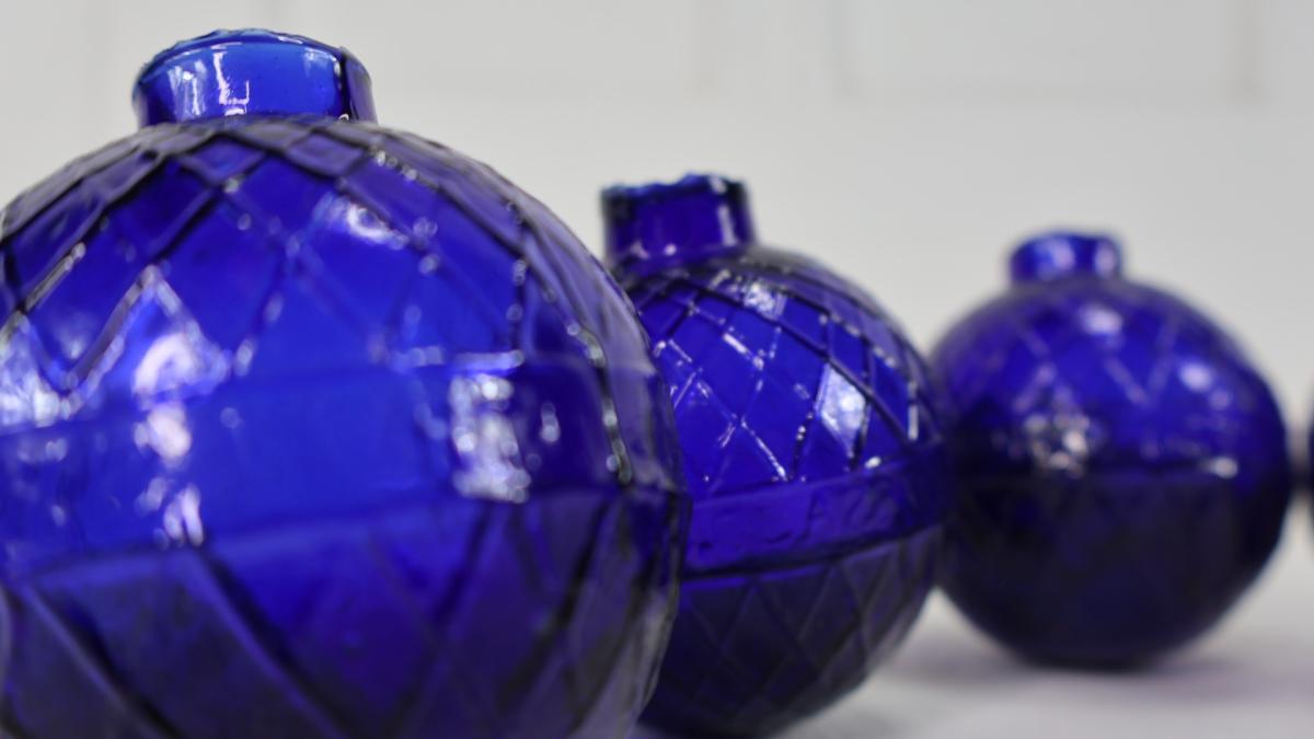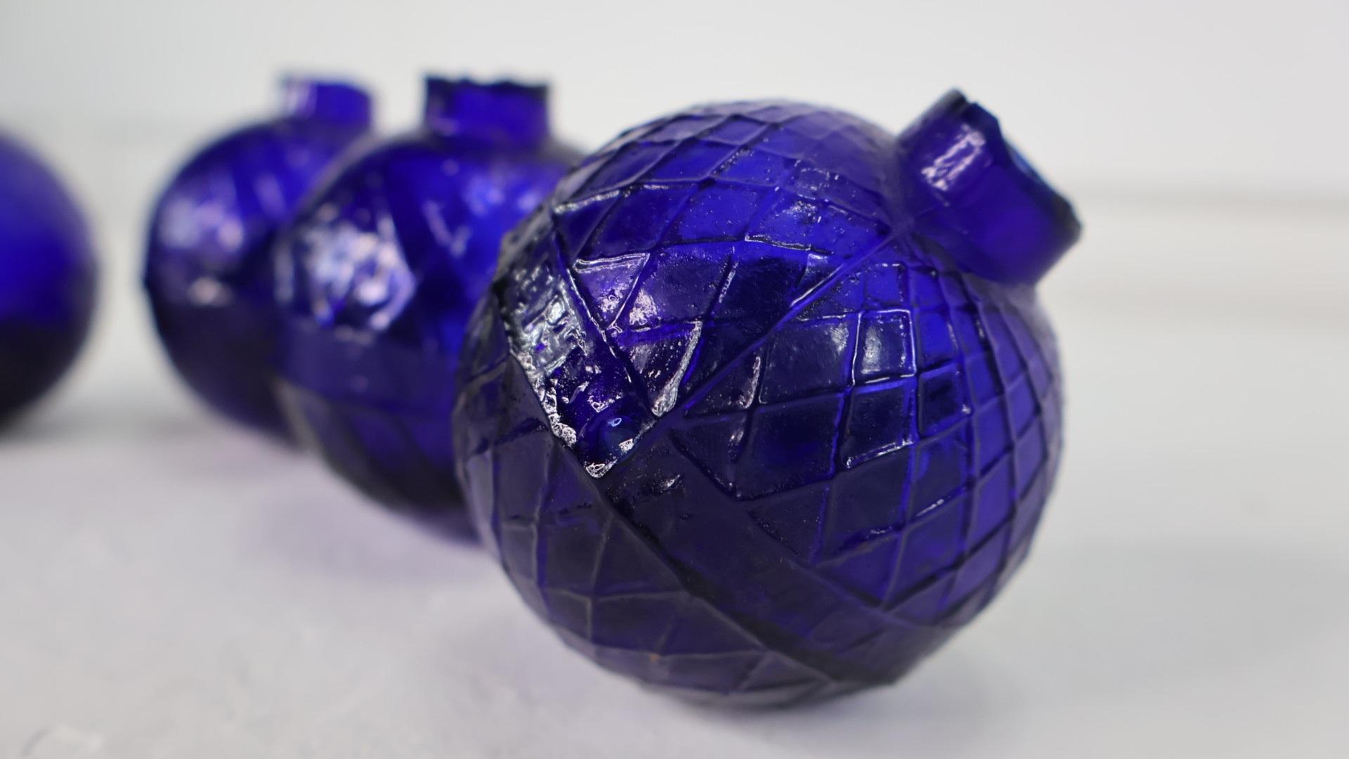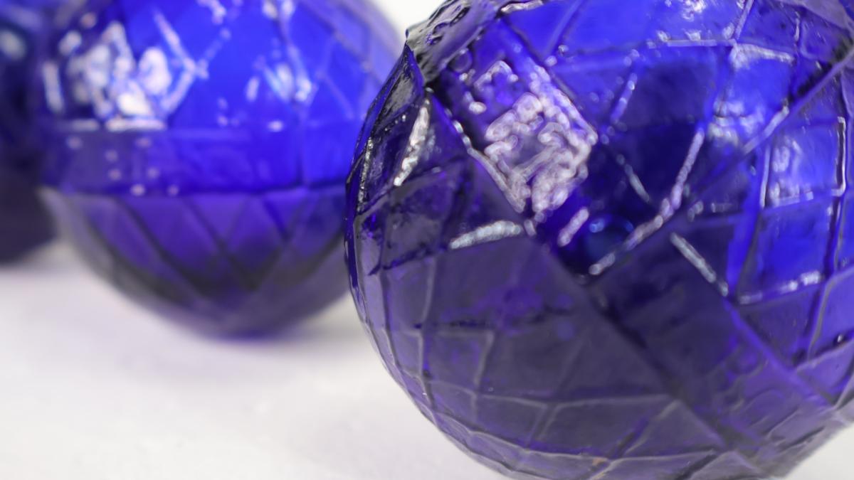 Each hand blown cobalt glass ball was filled with feathers and sealed with a cork stopper, they were then launched into the air by a machine called the ball chuck.