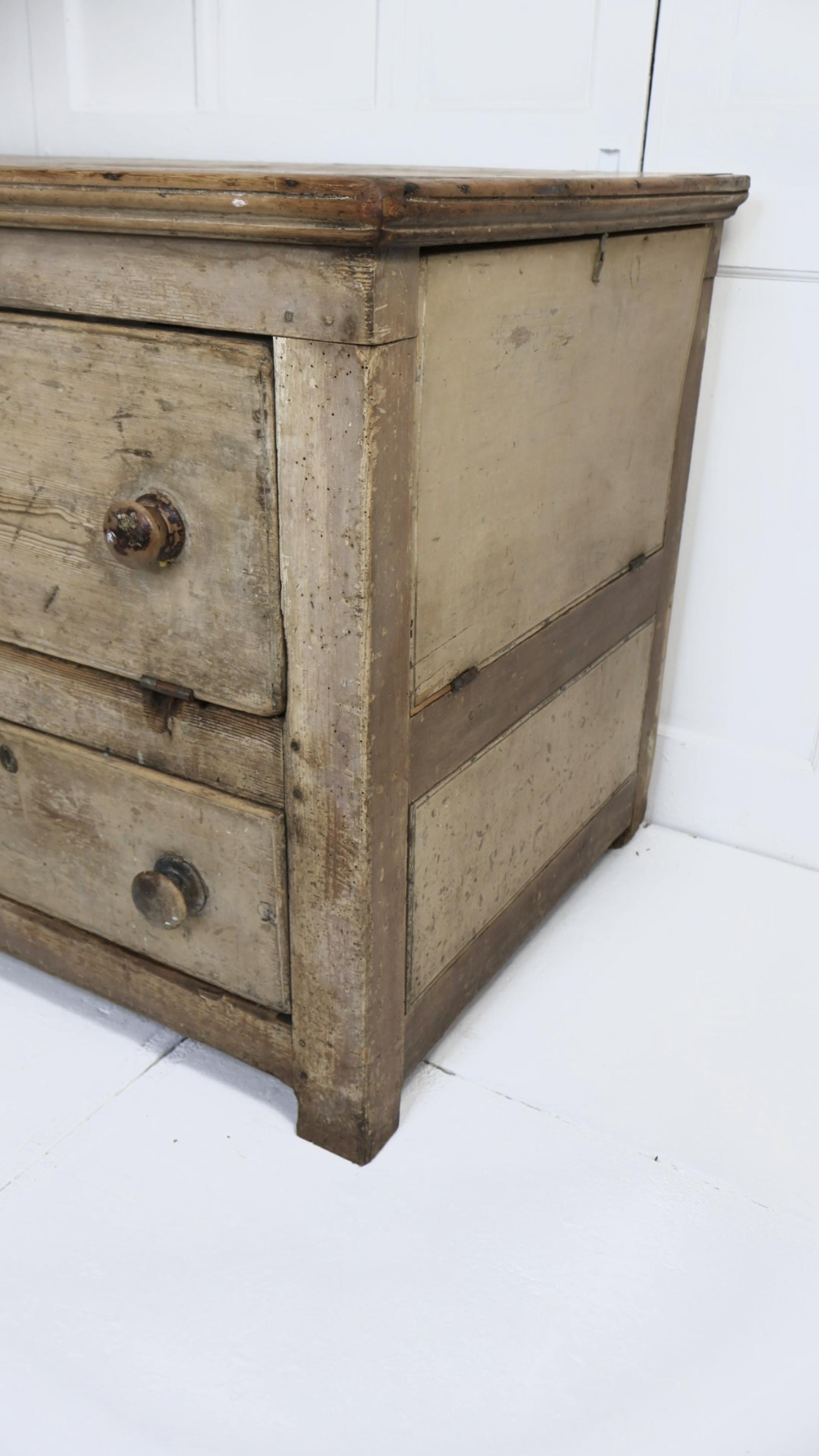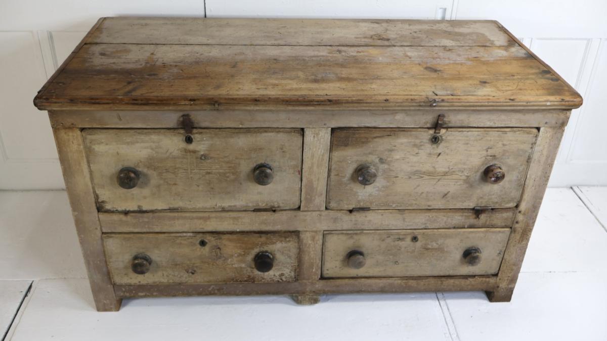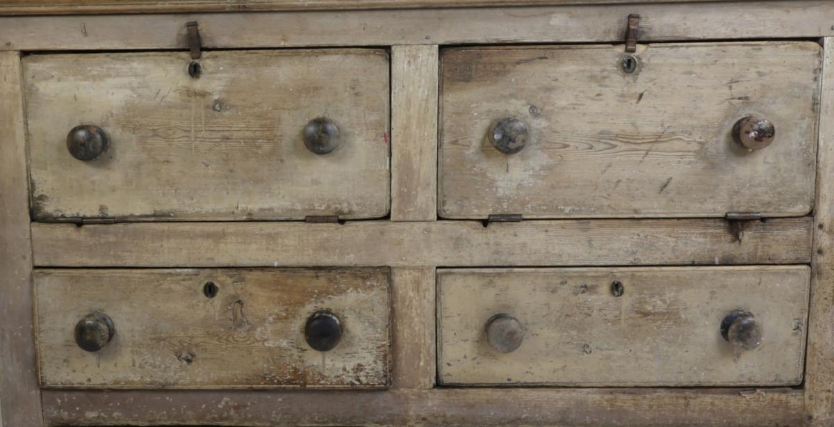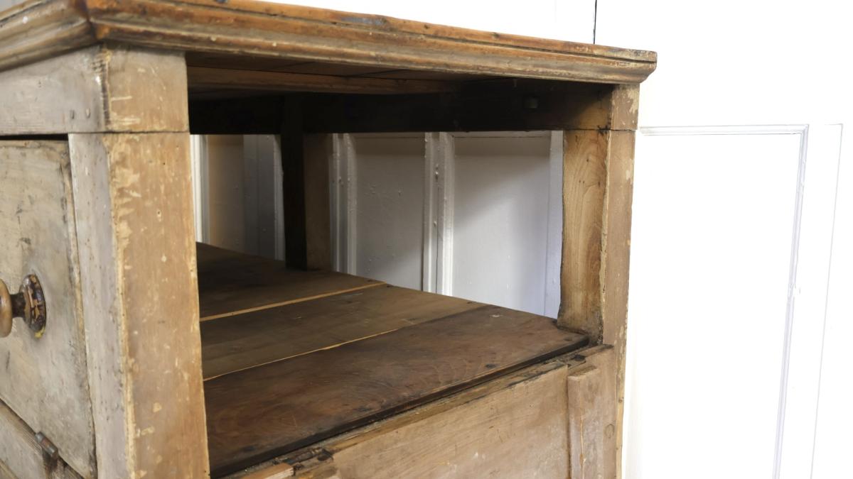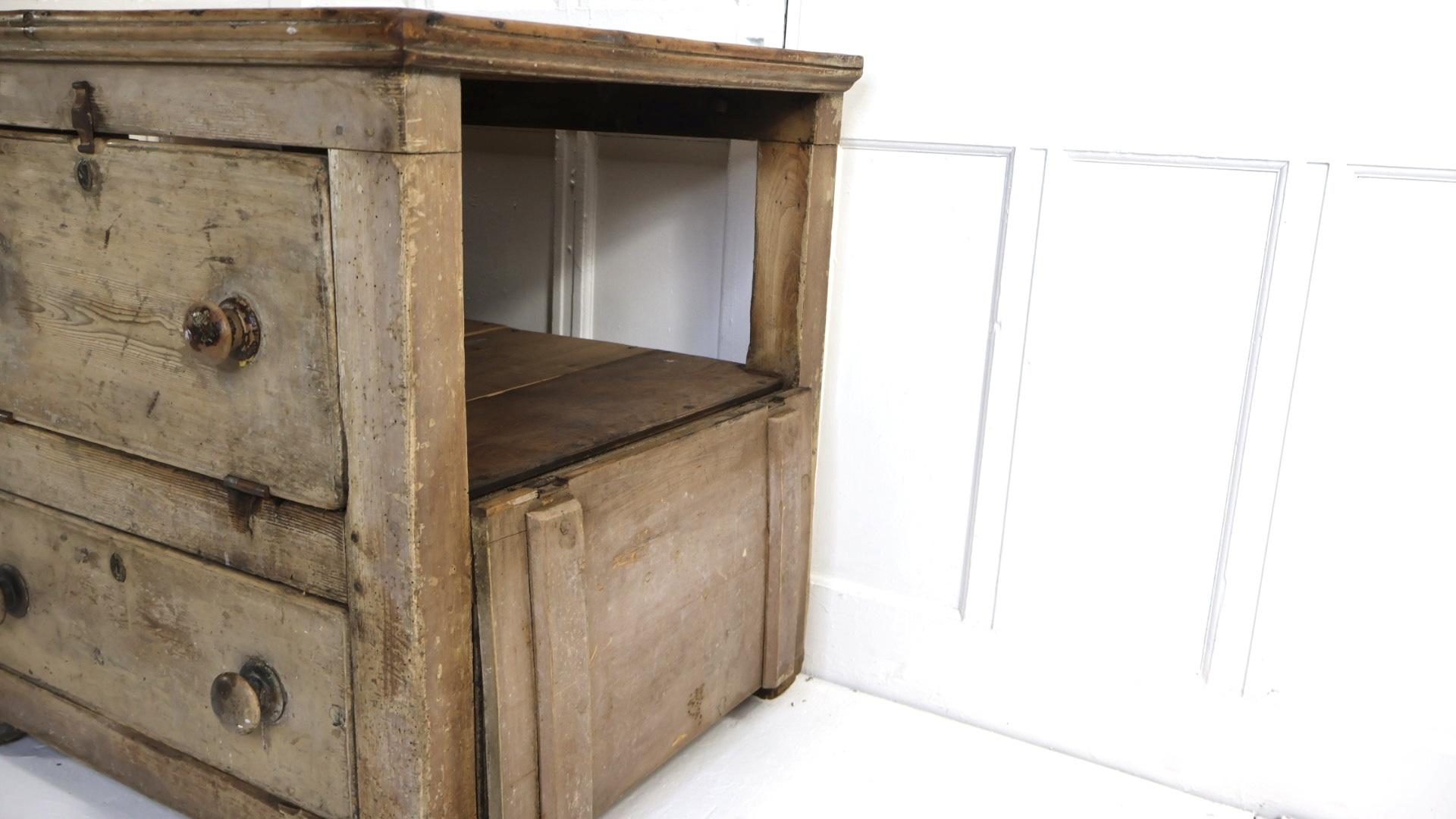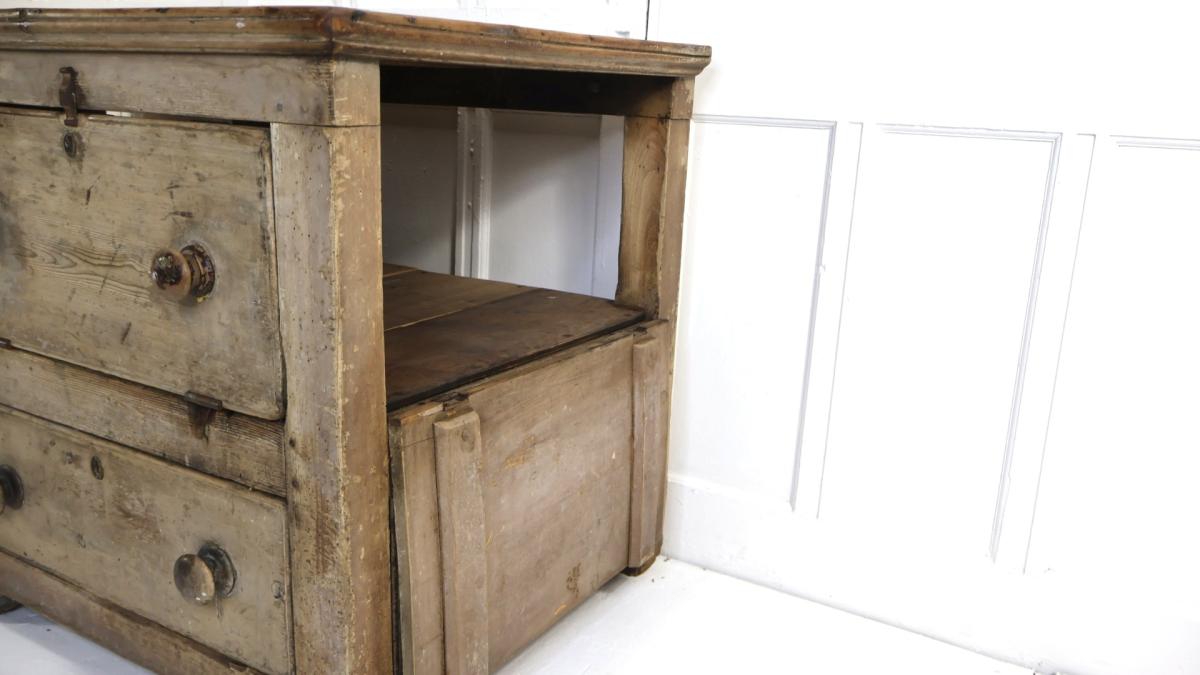 Comprising of 2 drop down drawer fronts revealing access to the shelved interior, and 2 pull out drawers at the bottom, all retaining the original wooden knobs.