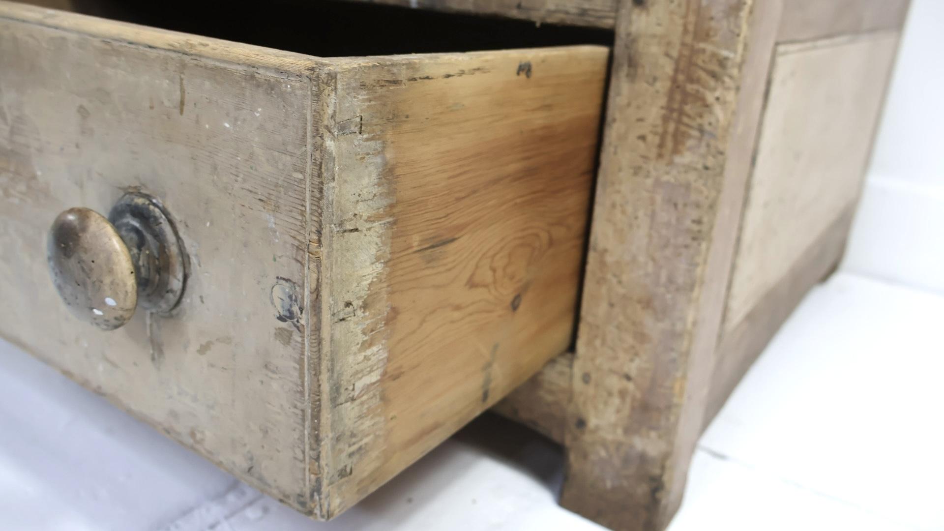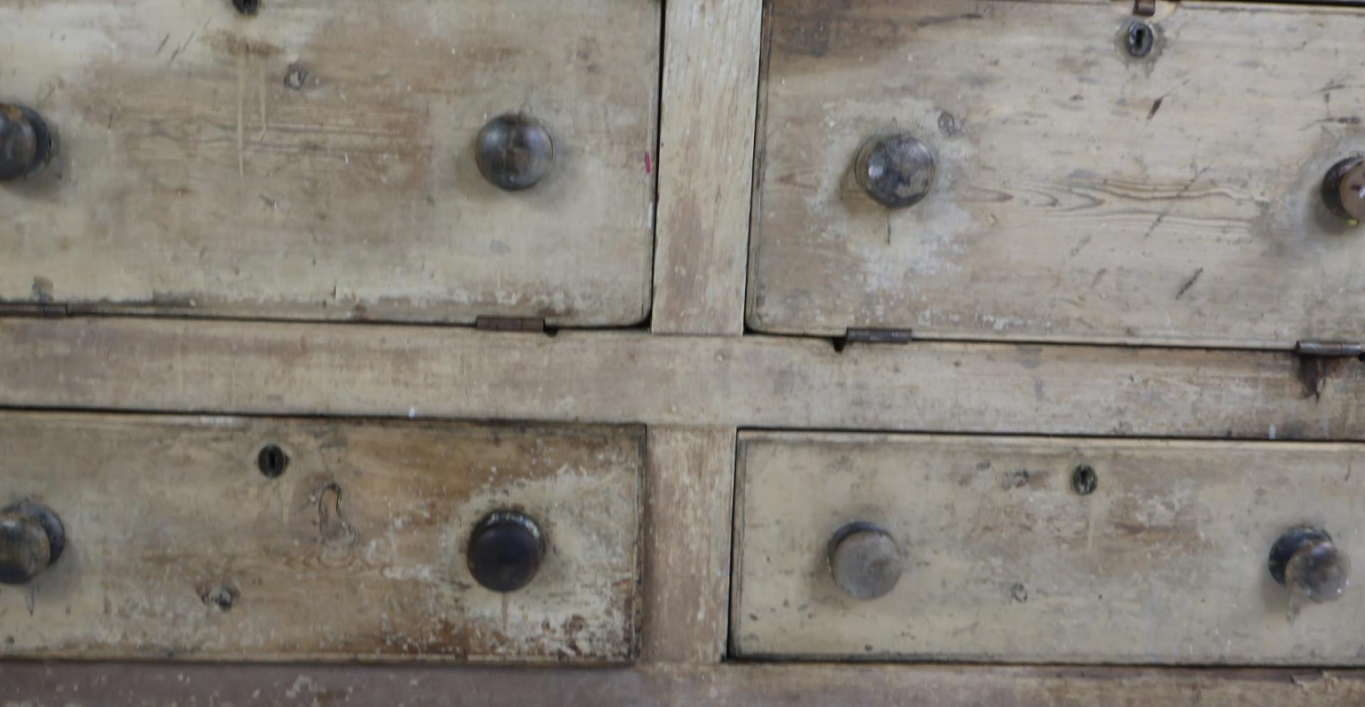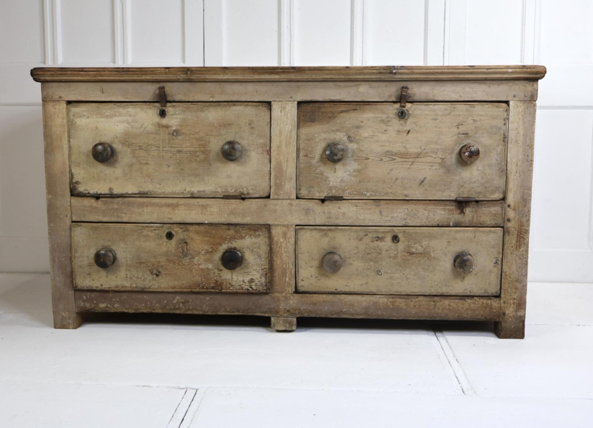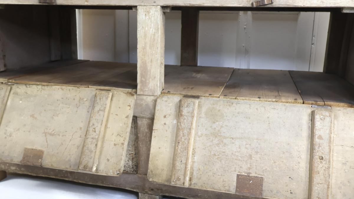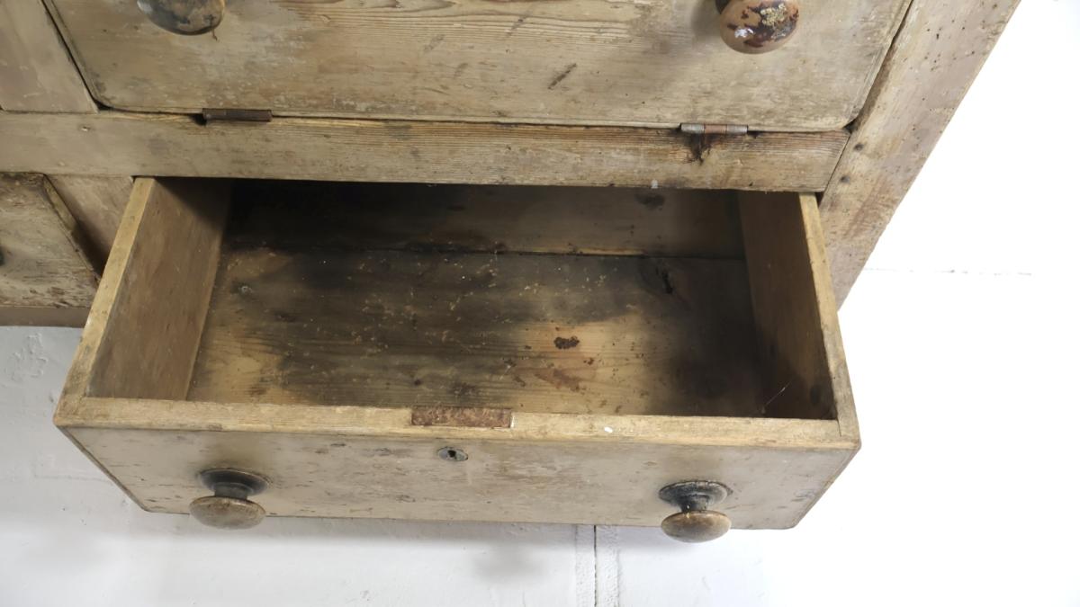 Comprising of 2 drop down drawer fronts revealing access to the shelved interior, and 2 pull out drawers at the bottom, all retaining the original wooden knobs.