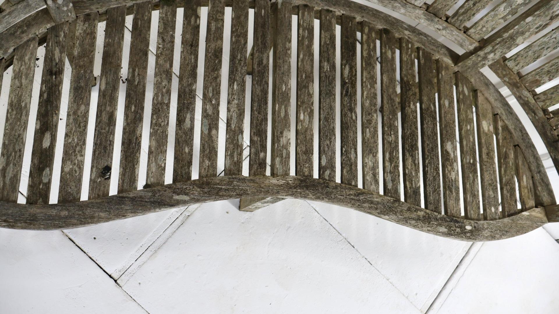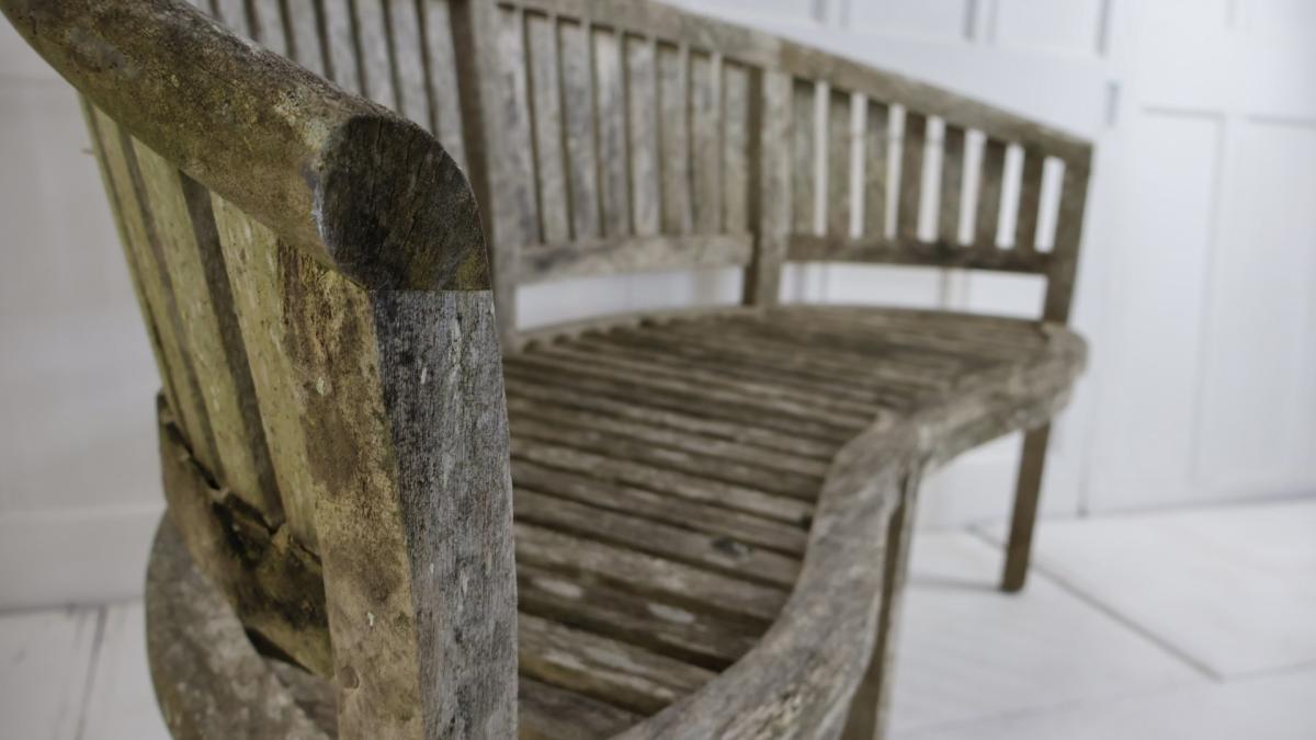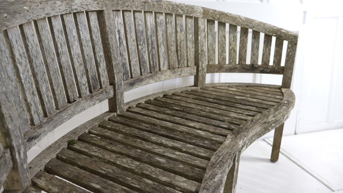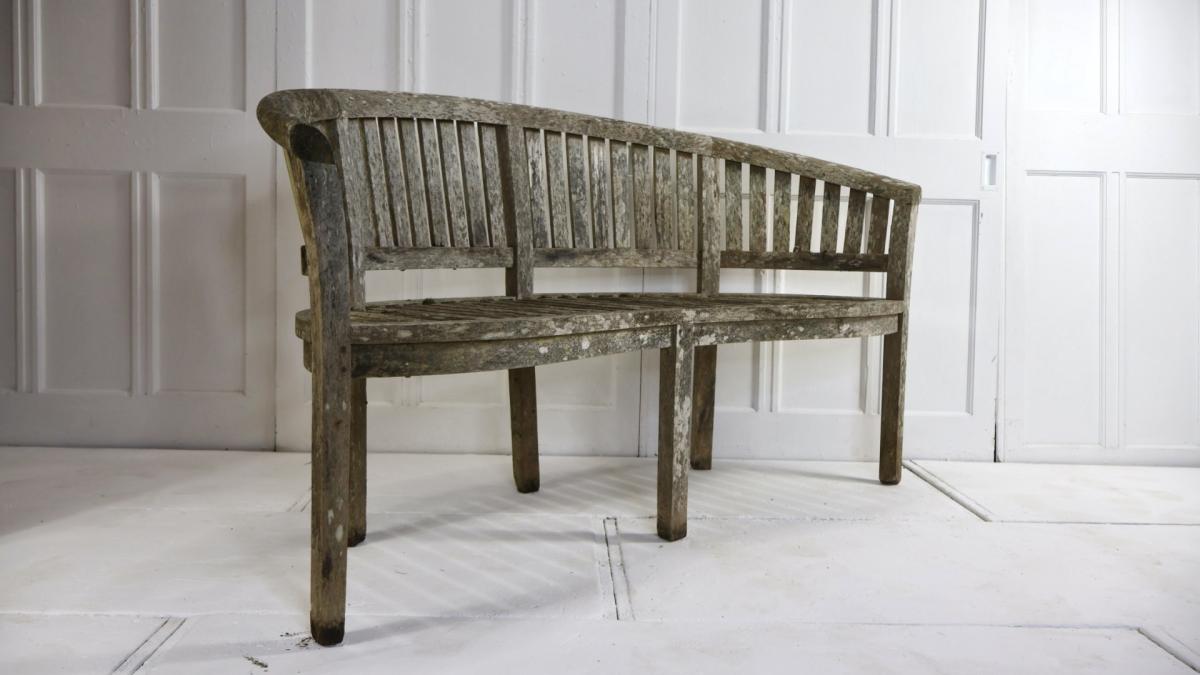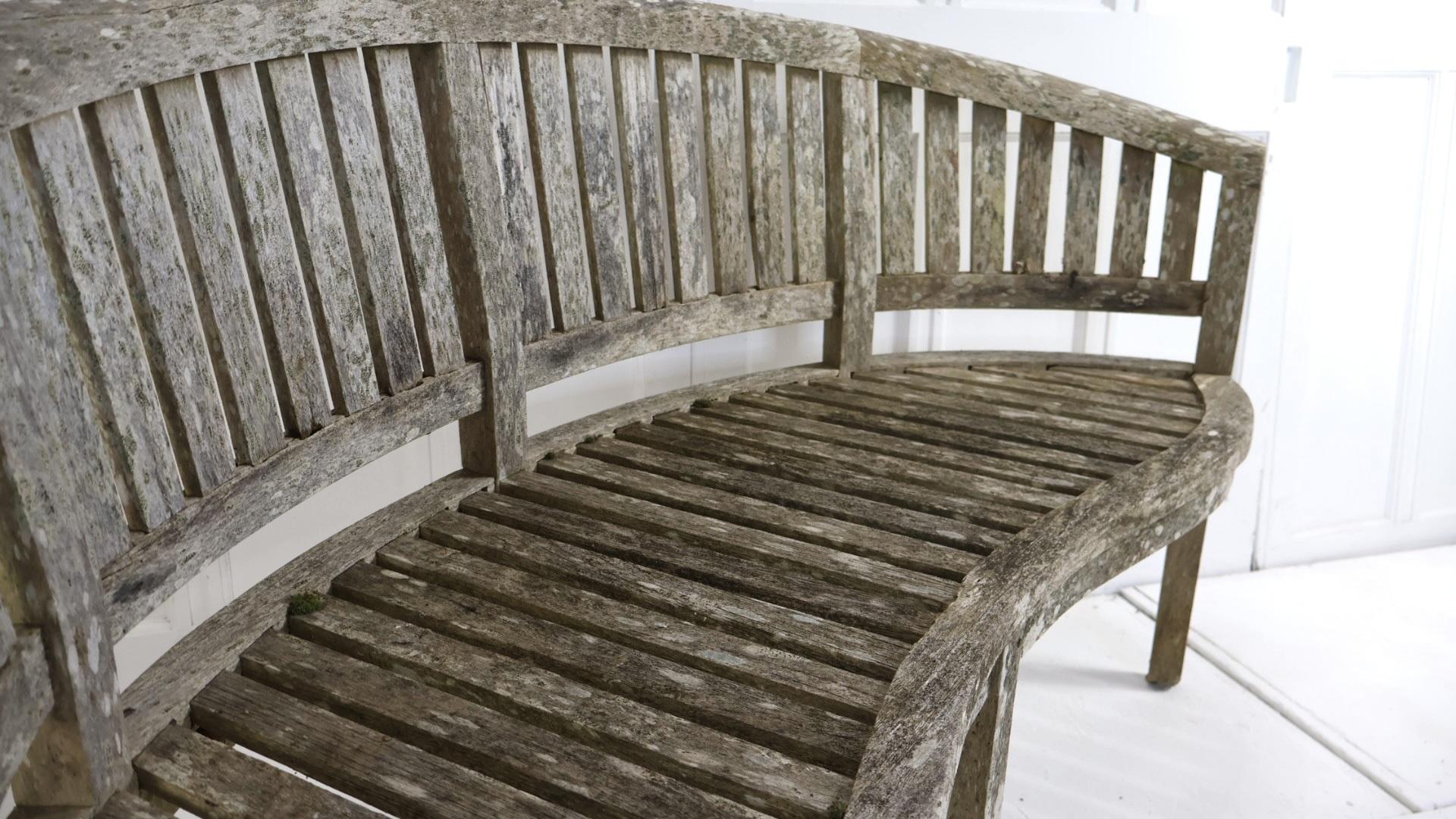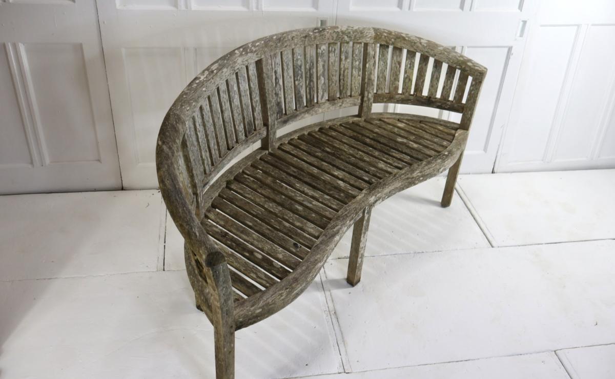 Nicely weathered, English, teak, mid century garden bench, with a curved back and swept front.