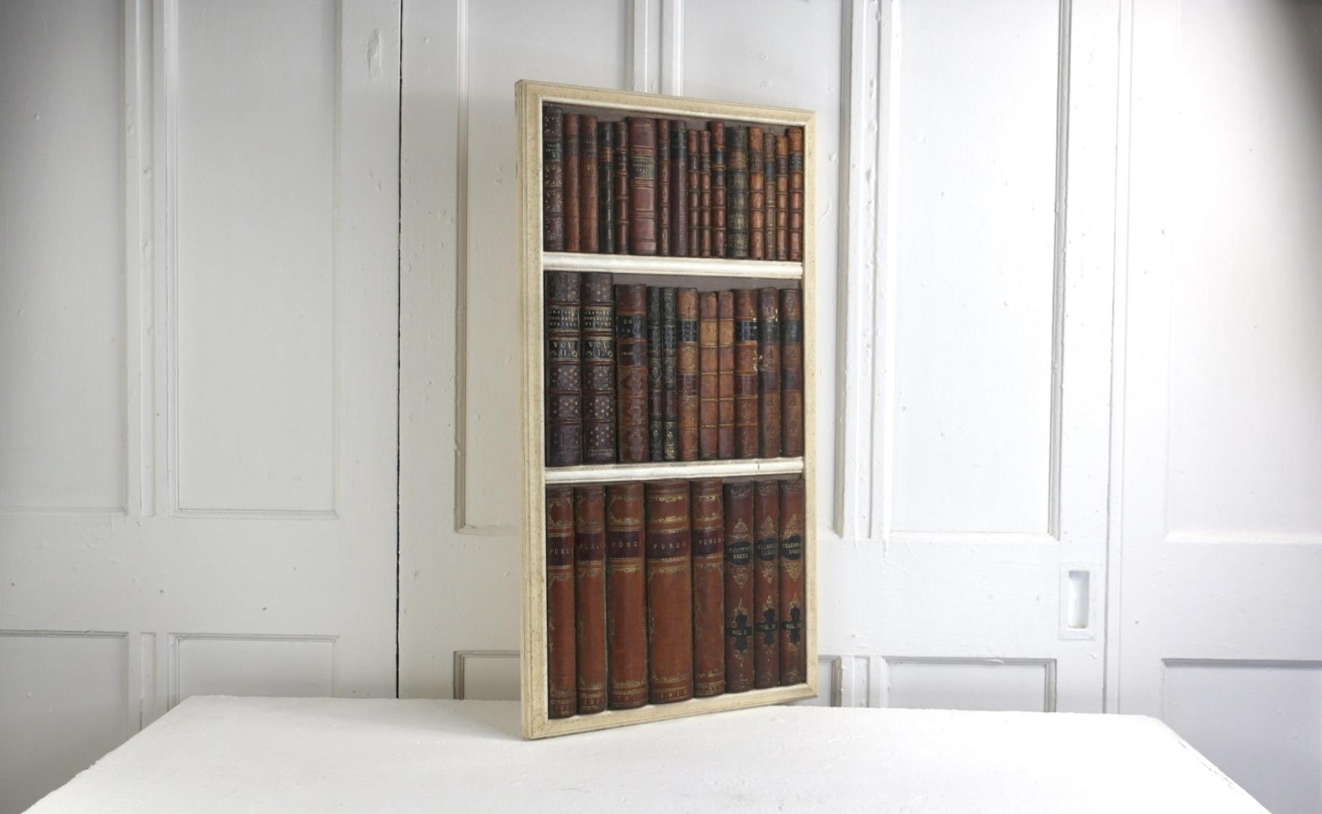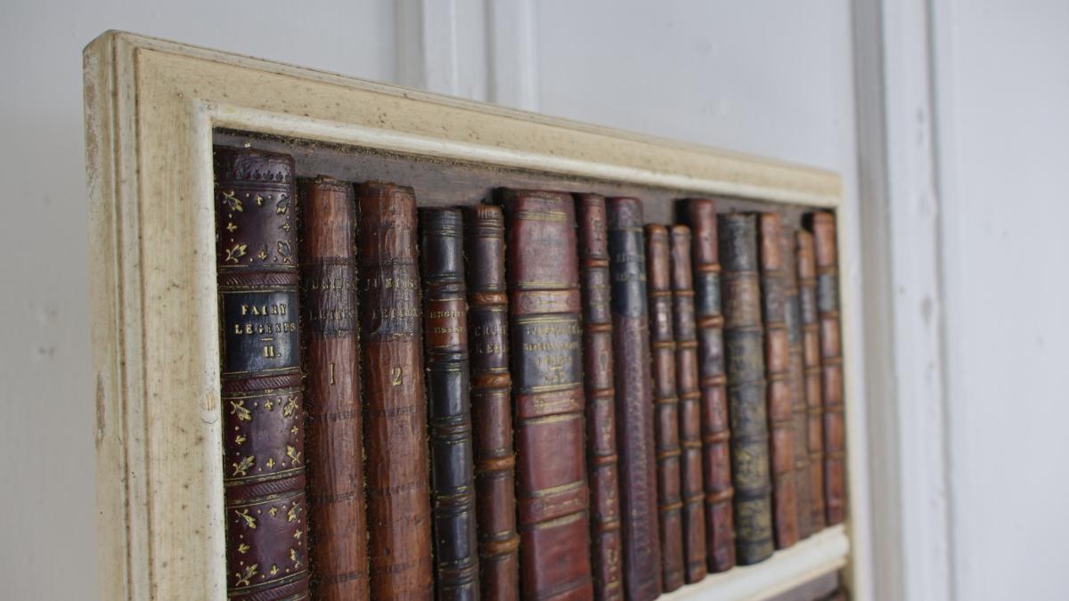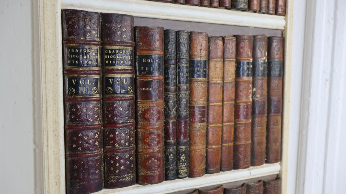 A period decorative faux library secret door, comprising of a wooden frame and a selection of leather bound period books.
