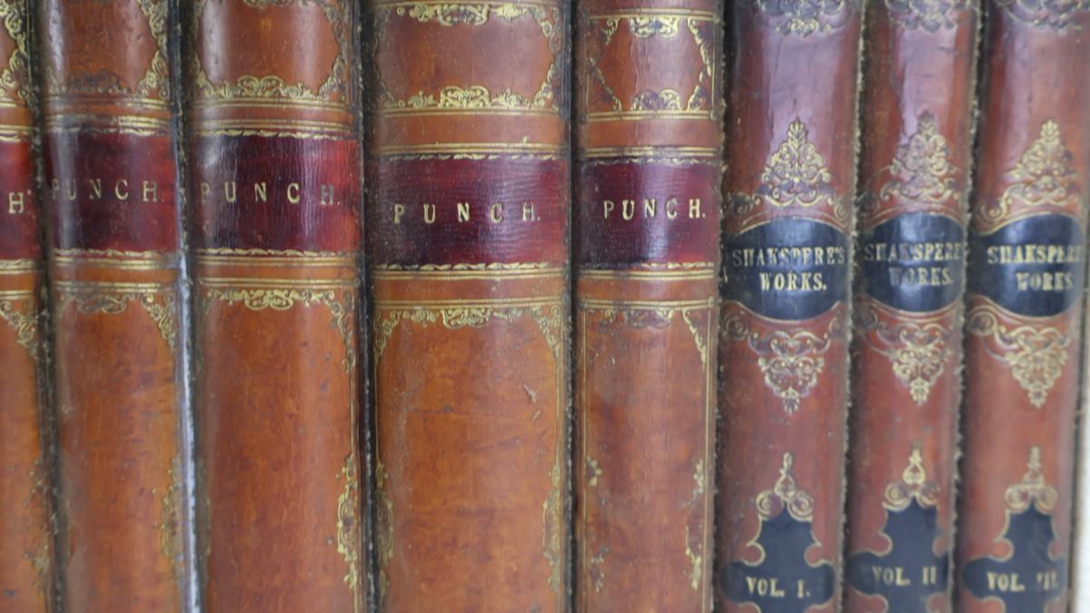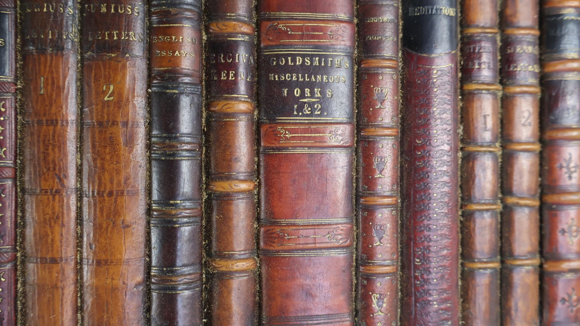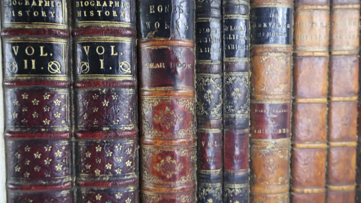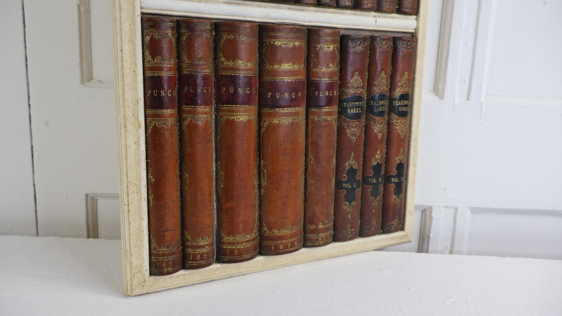 A period decorative faux library secret door, comprising of a wooden frame and a selection of leather bound period books.