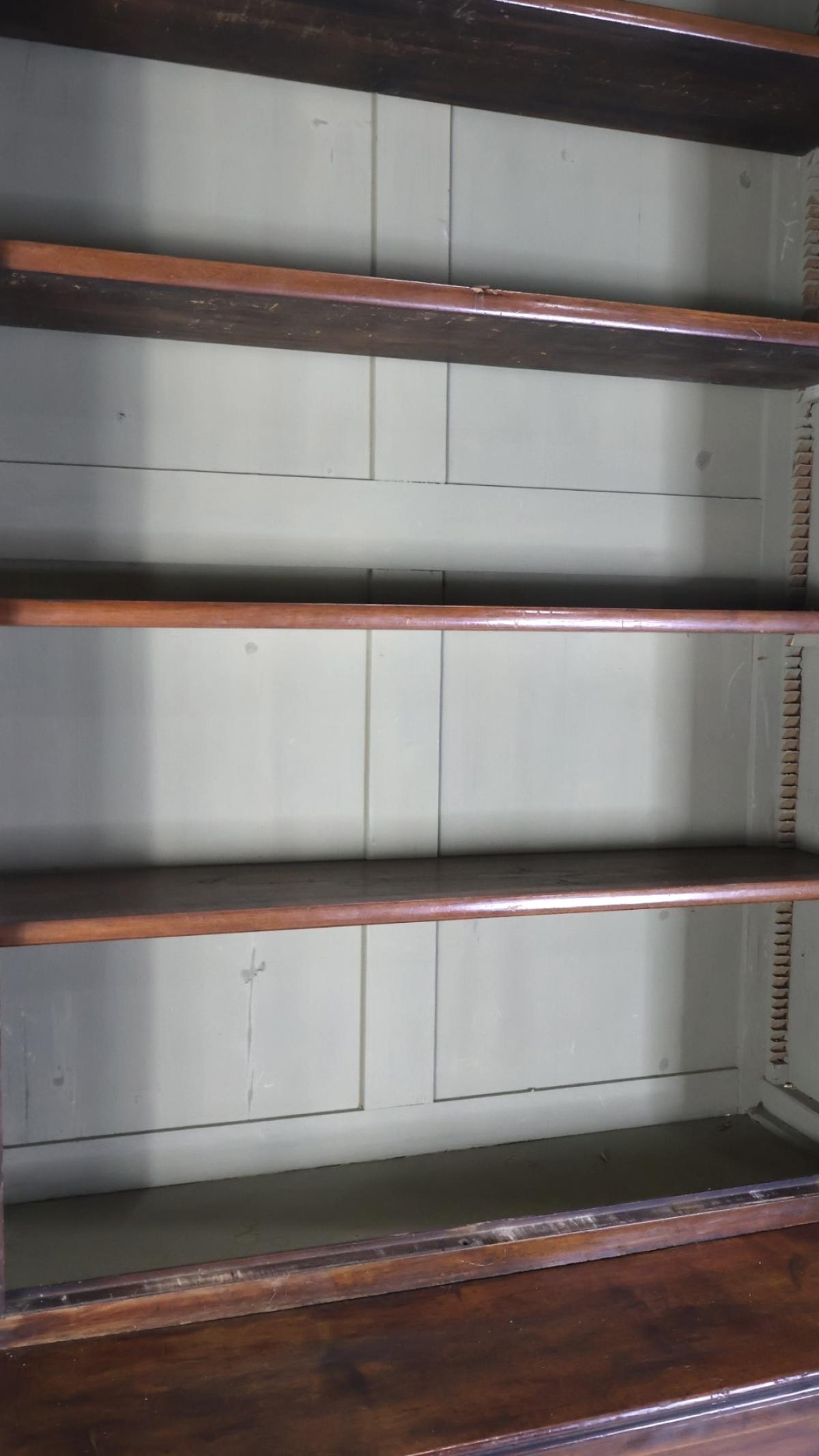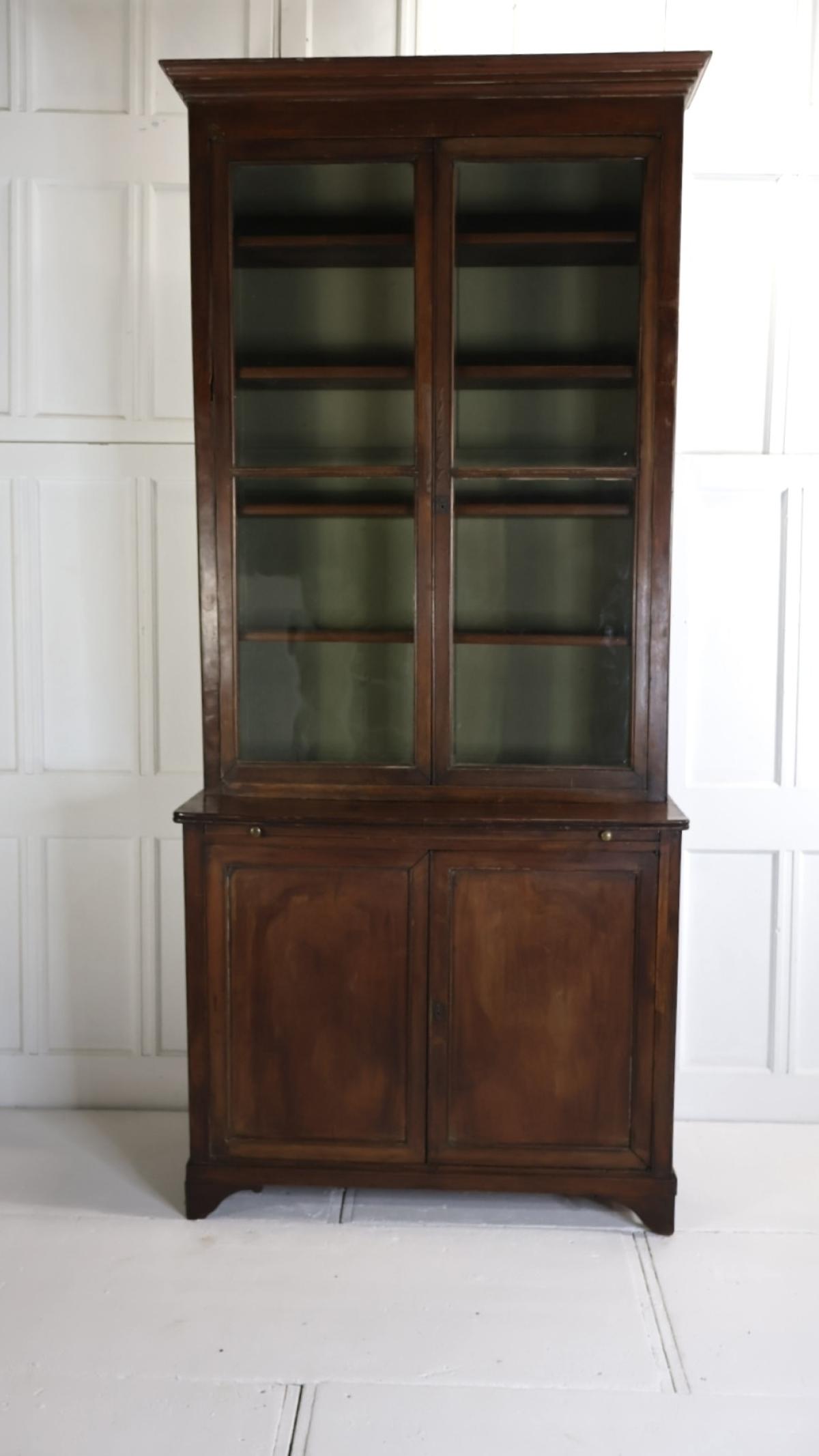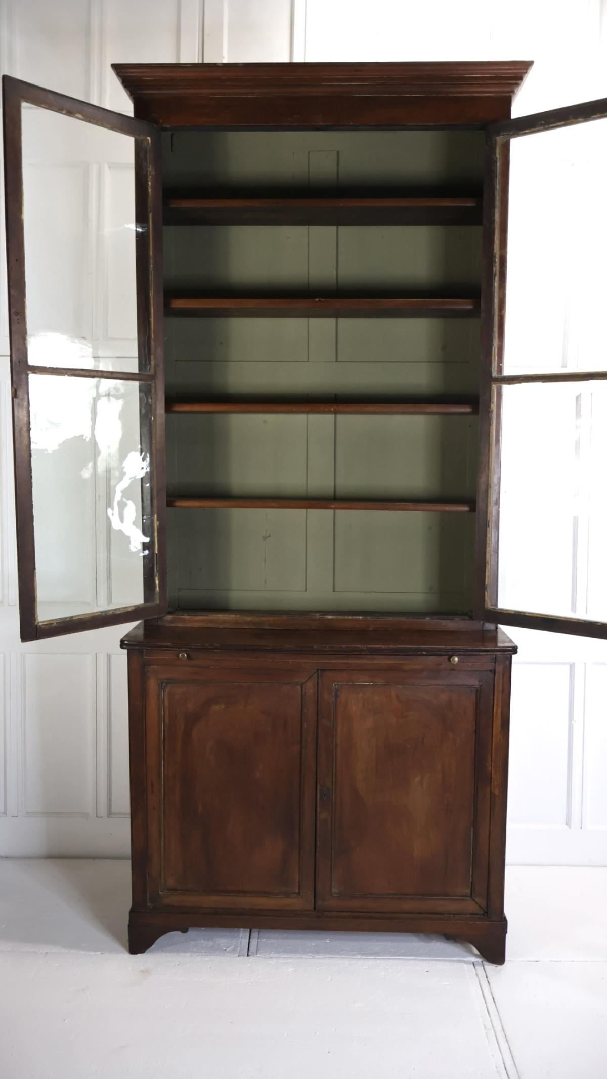 In 2 sections, the top comprising of a pair of large glazed doors with original decorative wavy glass, and 4 adjustable wooden shelves with a green painted interior.