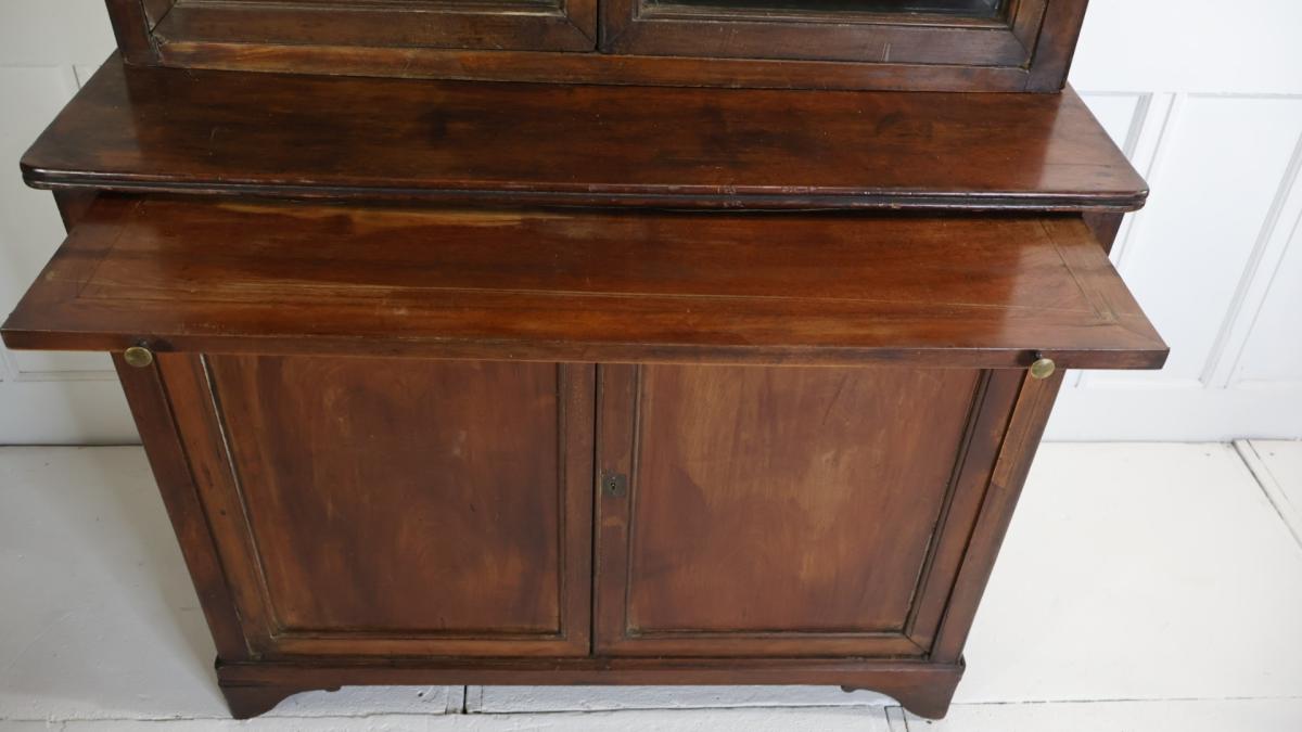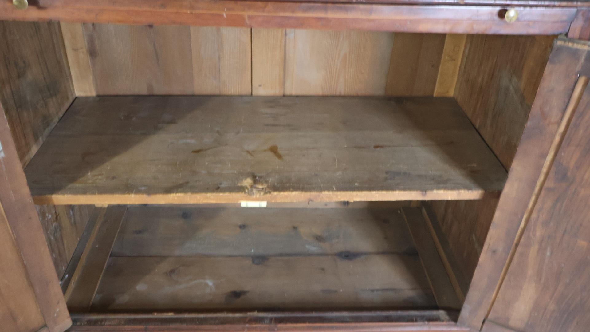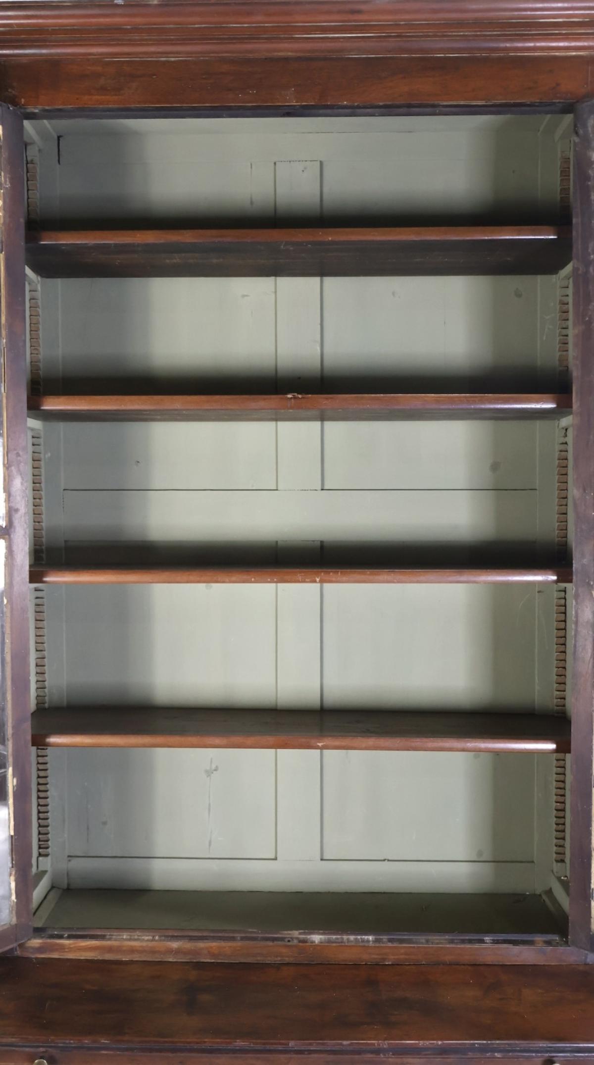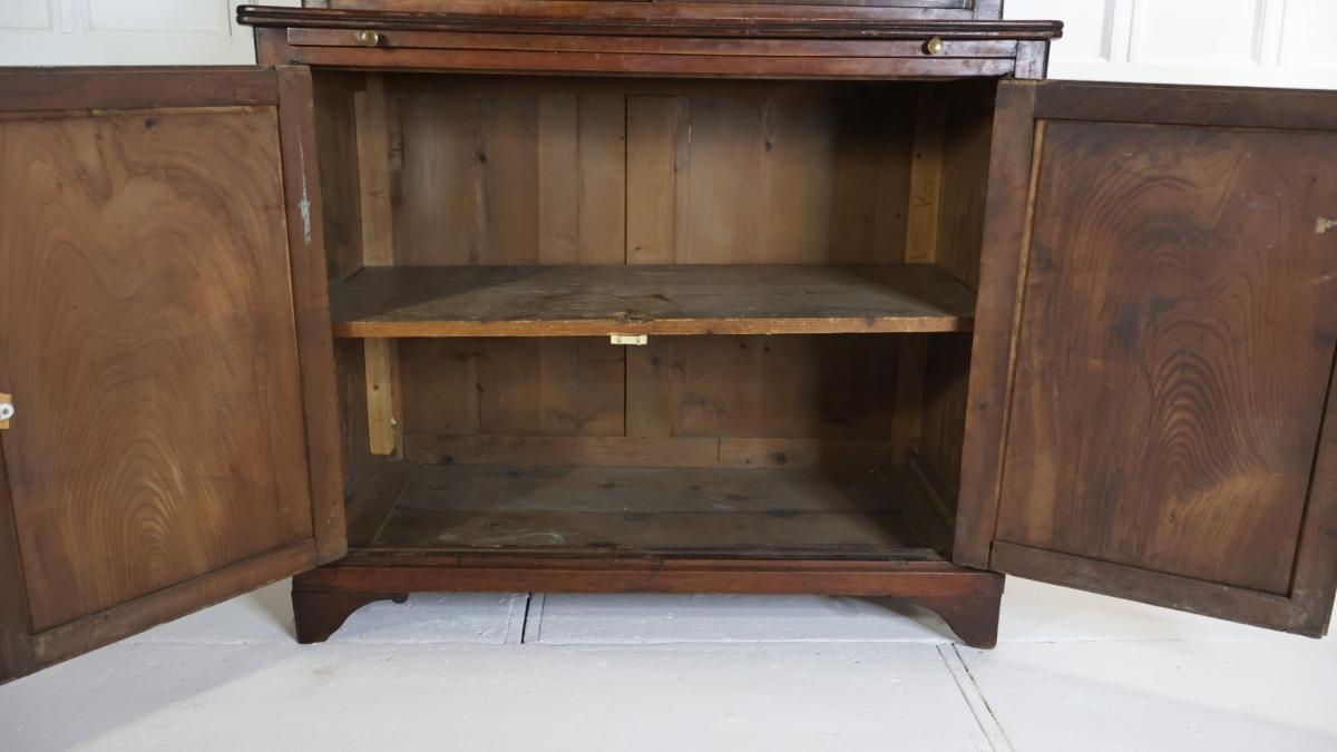In 2 sections, the top comprising of a pair of large glazed doors with original decorative wavy glass, and 4 adjustable wooden shelves with a green painted interior.