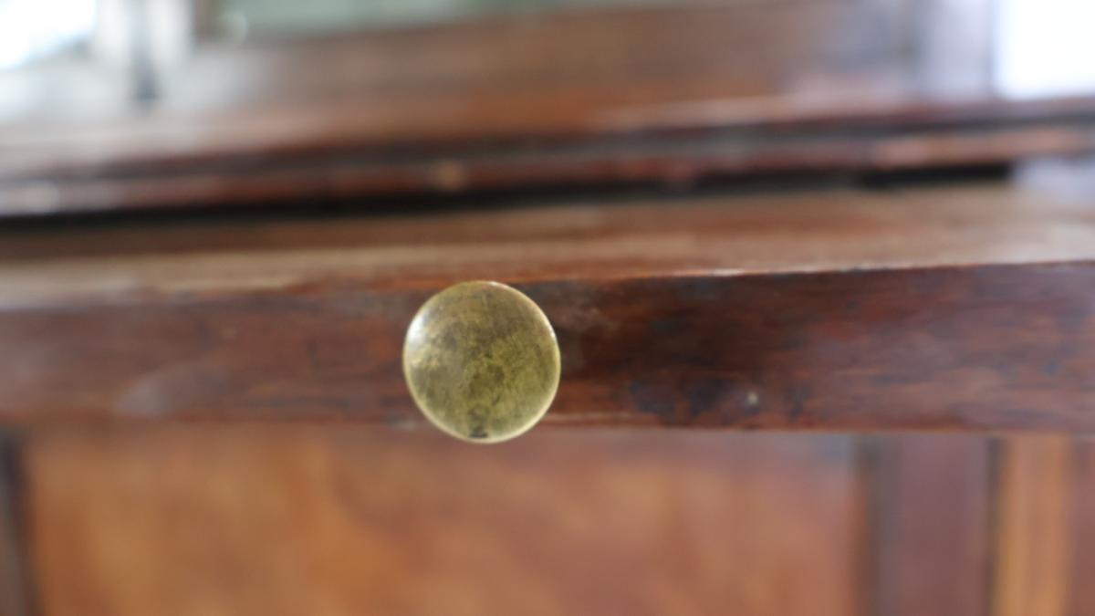 The base has a cupboard section with central shelf, and a pull out brush shelf with original brass knobs.