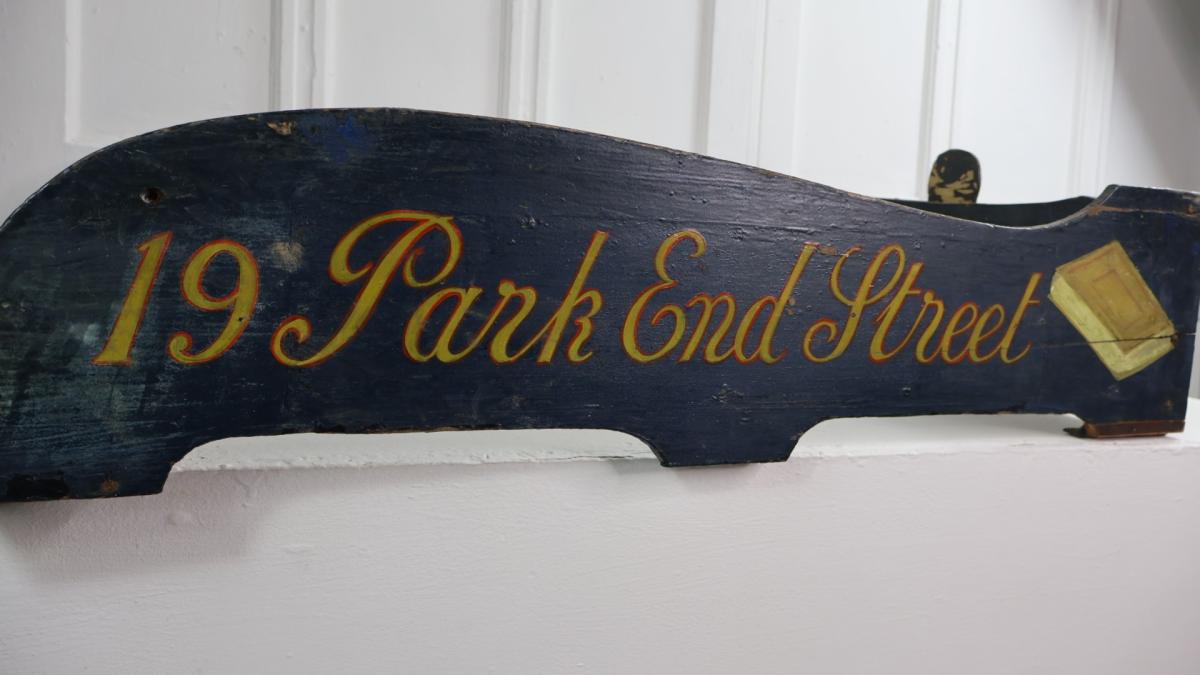 Retaining its original blue paint, and advertising the trading address on each side with opening hours.