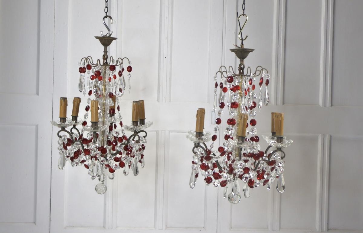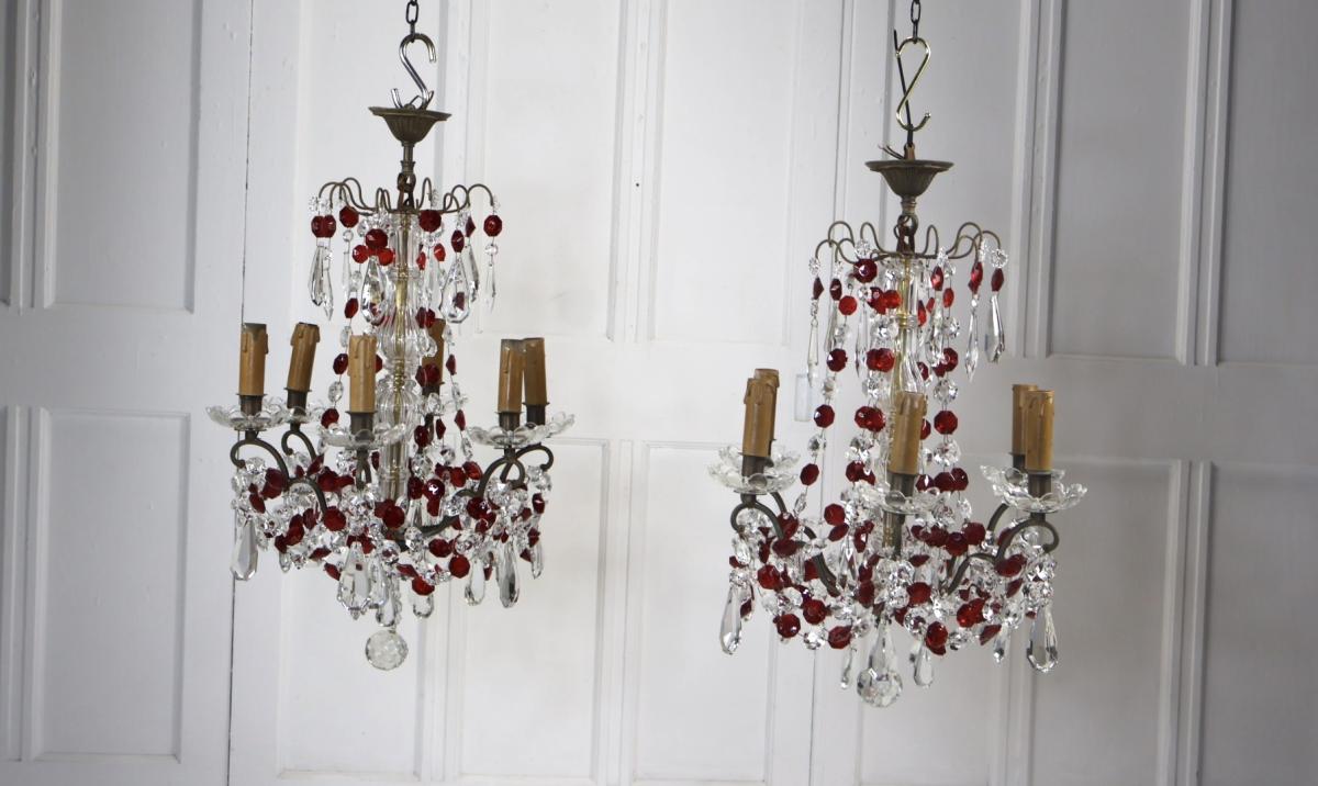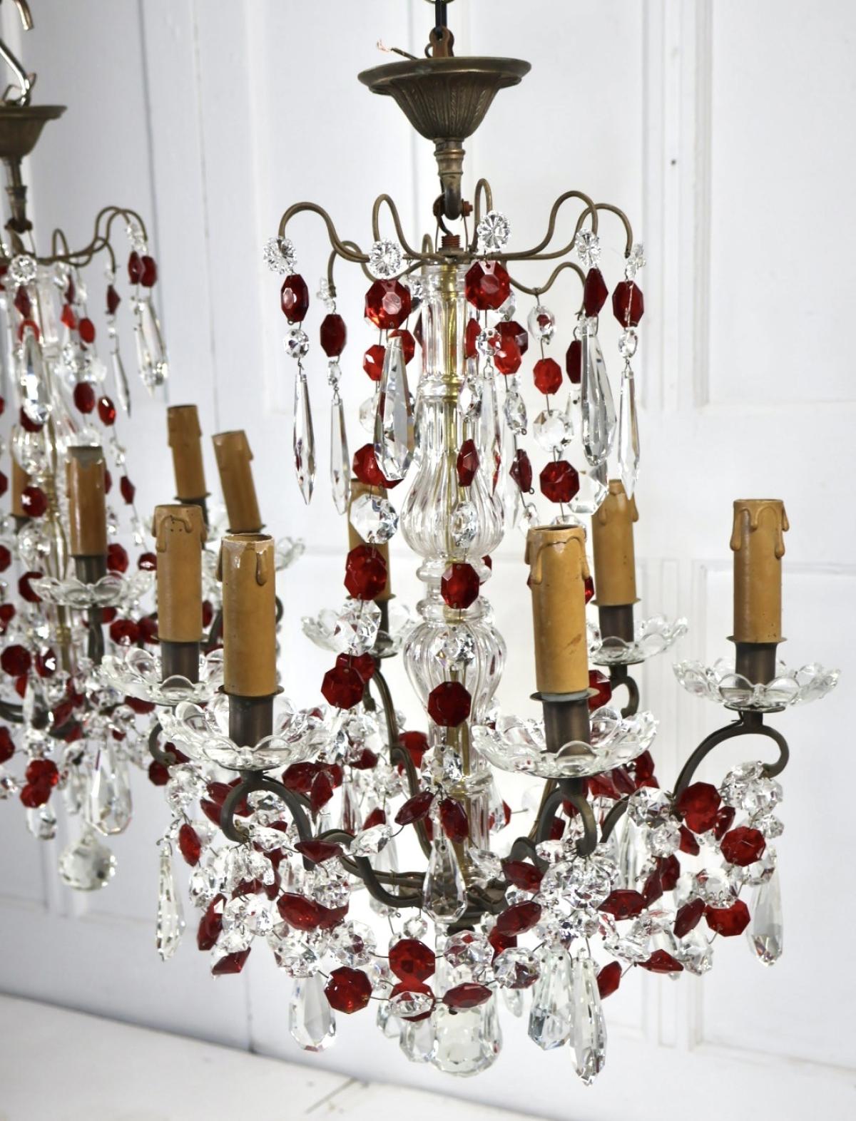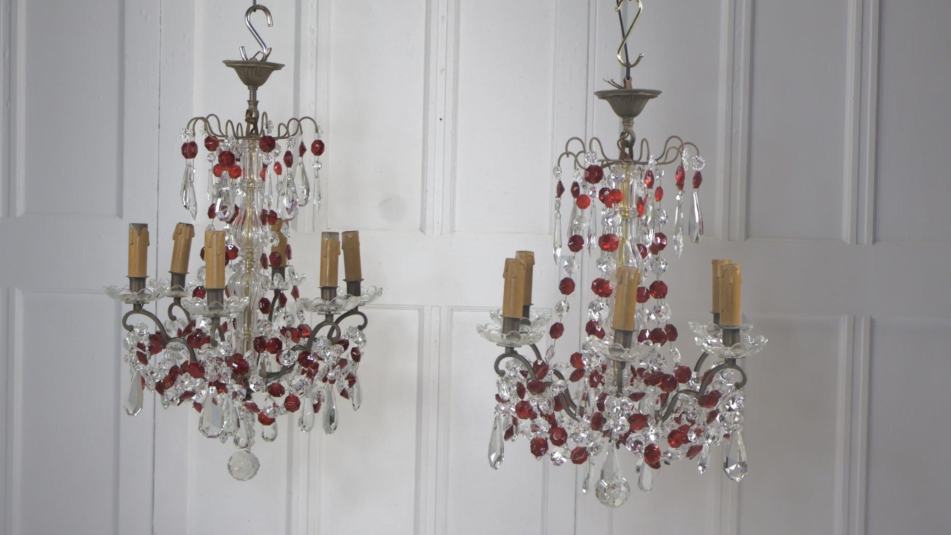 Both chandeliers are complete with no missing lustres, comprising of red and clear cut glass supported by a brass frame.