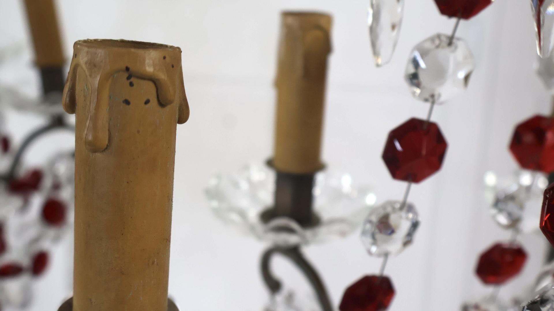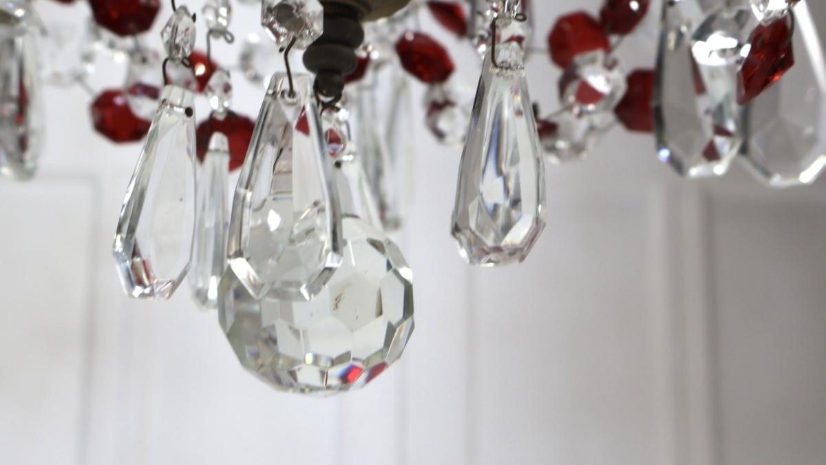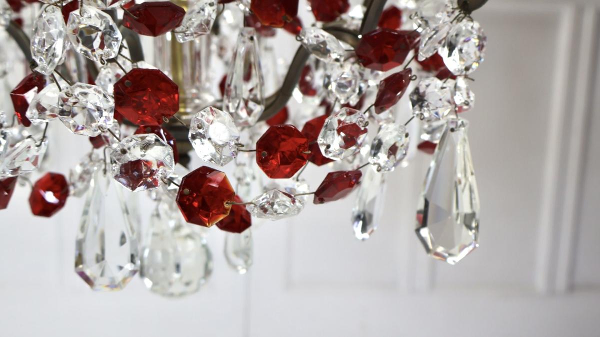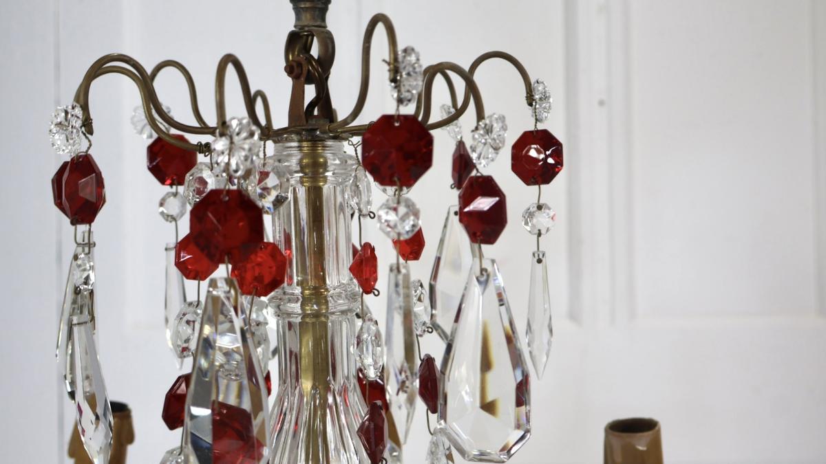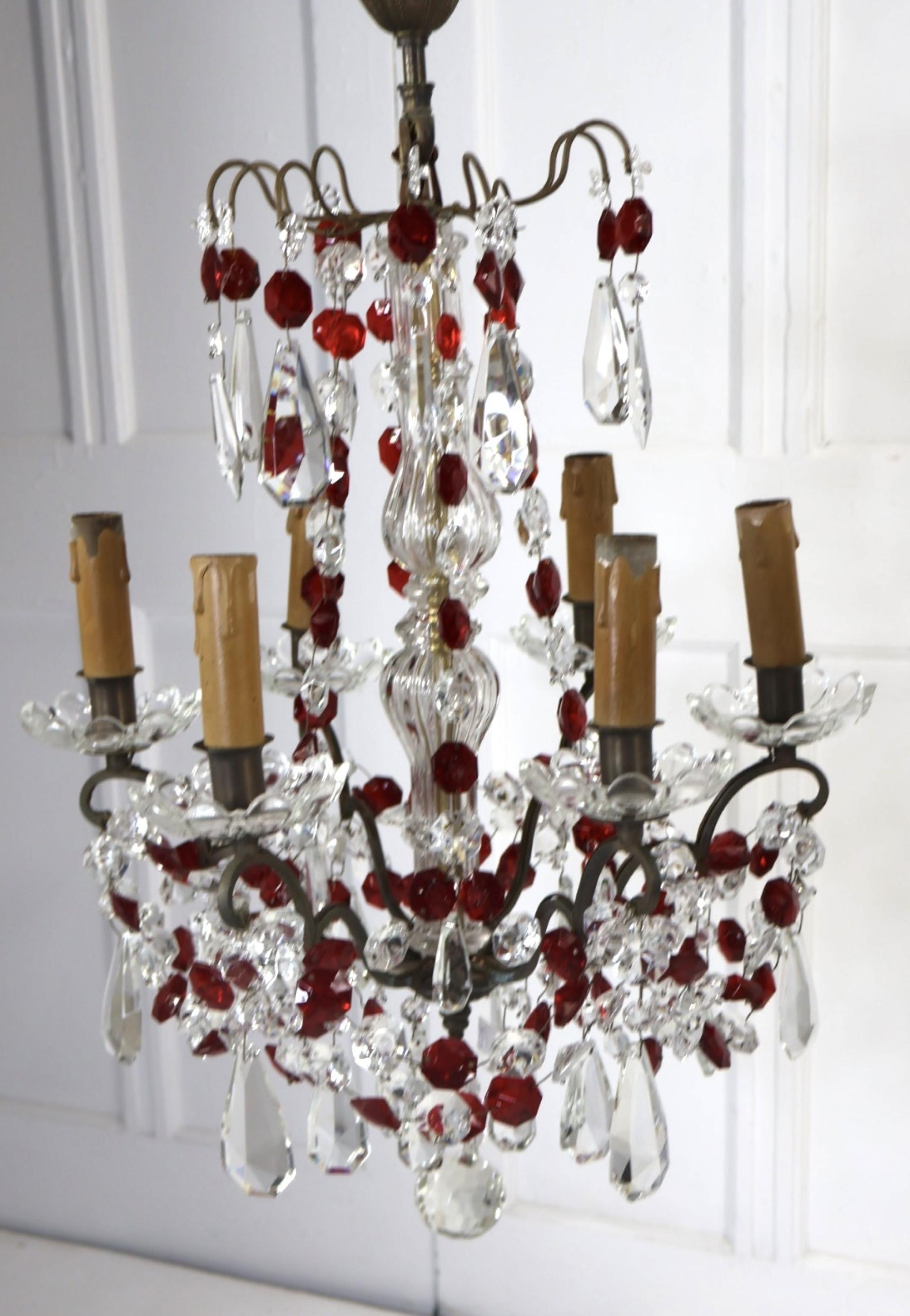Both chandeliers are complete with no missing lustres, comprising of red and clear cut glass supported by a brass frame.