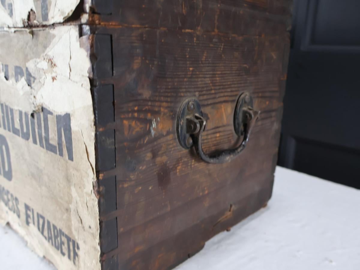 Constructed from pine with cast handles each end, retaining its original pasted poster to the front.
