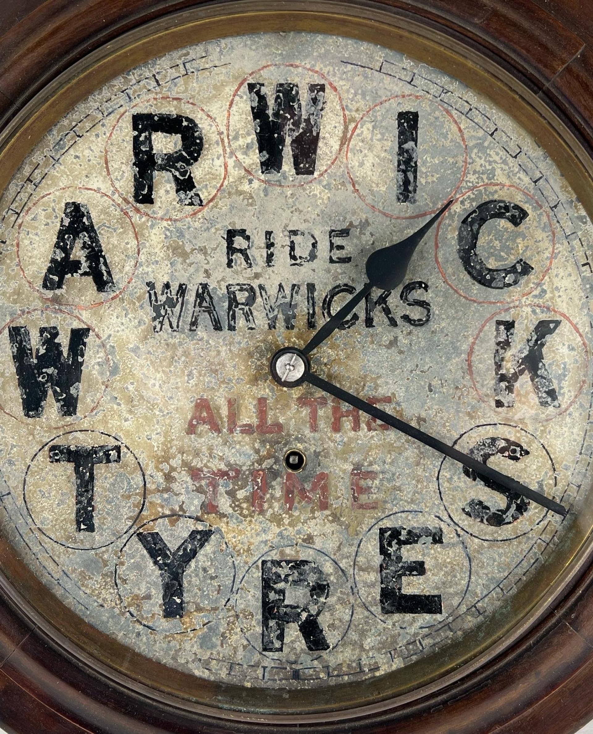An incredibly rare Warwick Cycles advertising wall clock, advertising their most recent tyres.