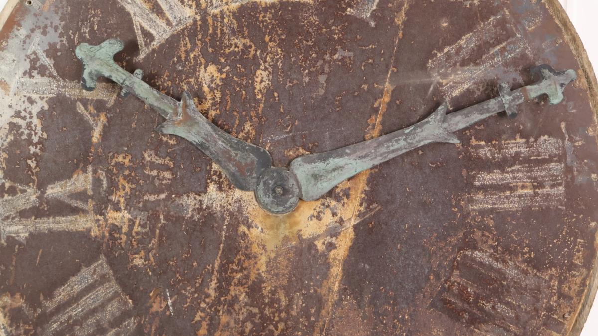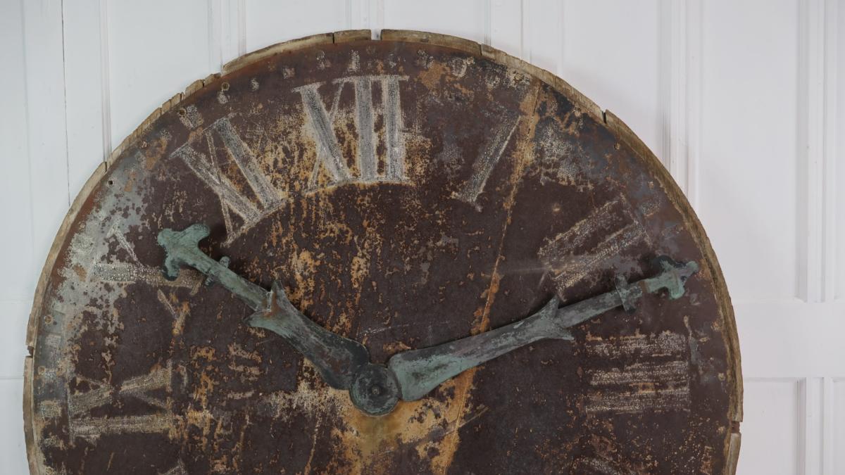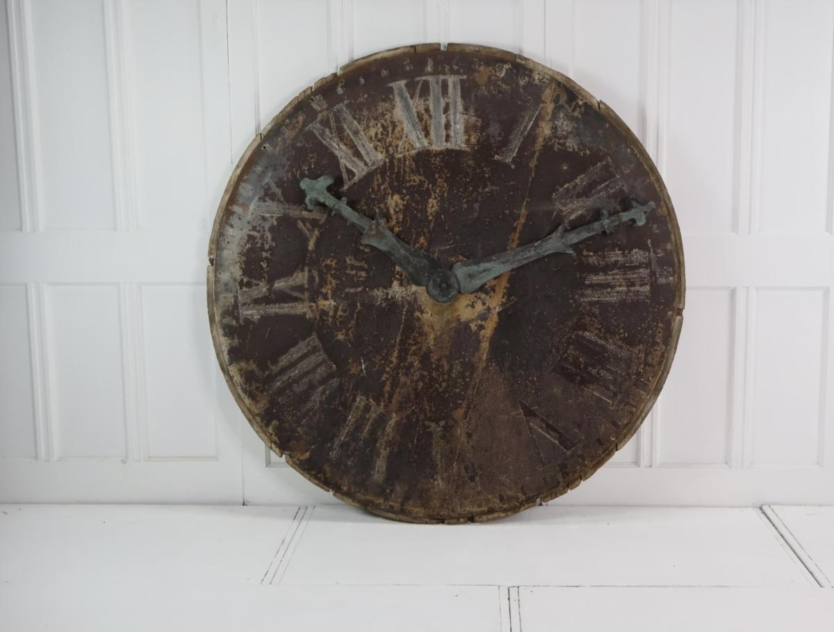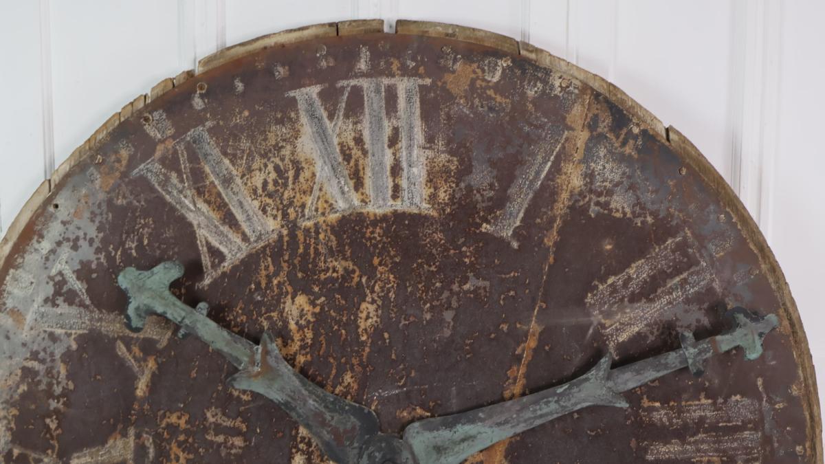 With its original painted face, decorative copper hands and wooden planks to the back.