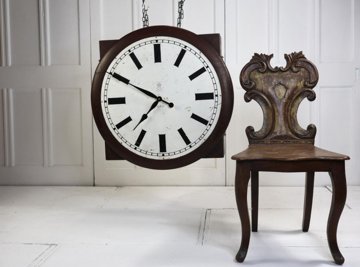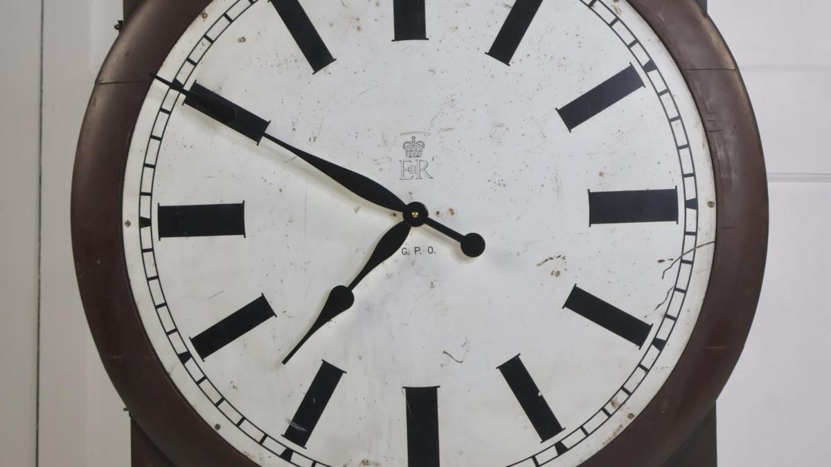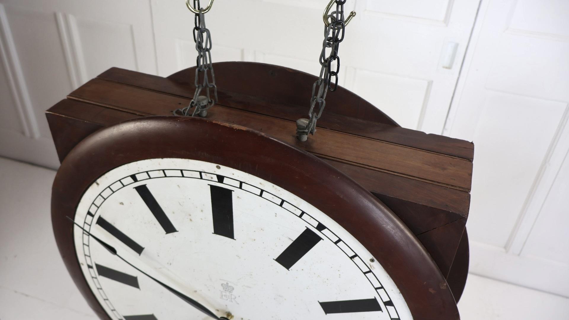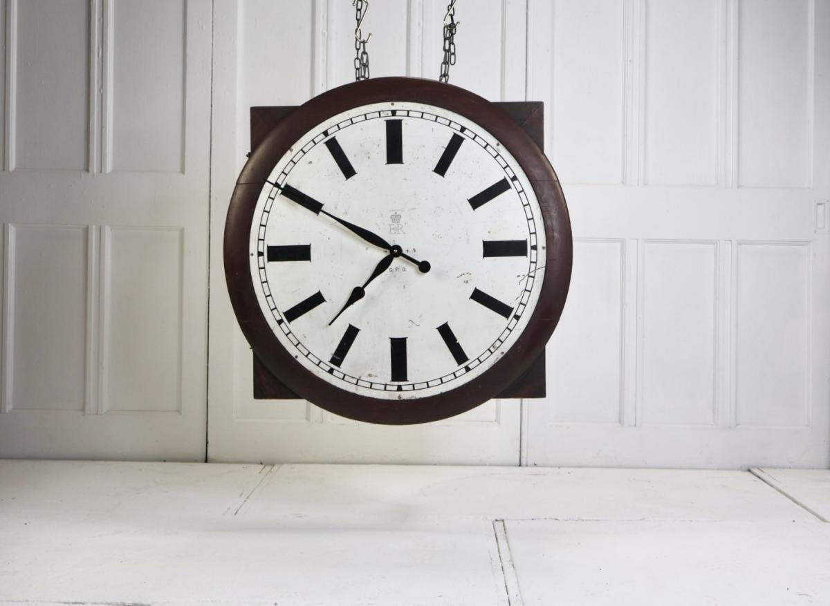 Huge, solid teak, double sided postal clock, with a GPO stamp and the Queen Elizabeth insignia dating from the mid 1950s.