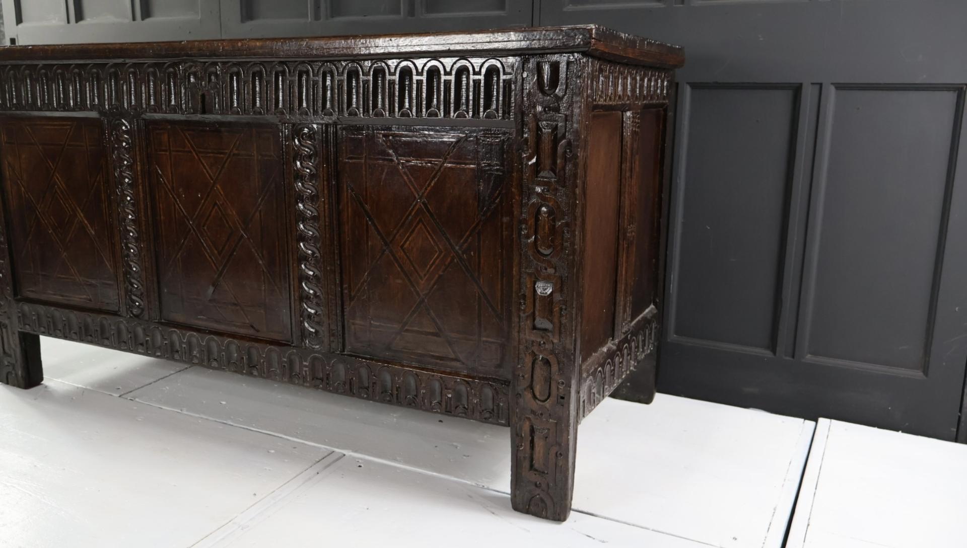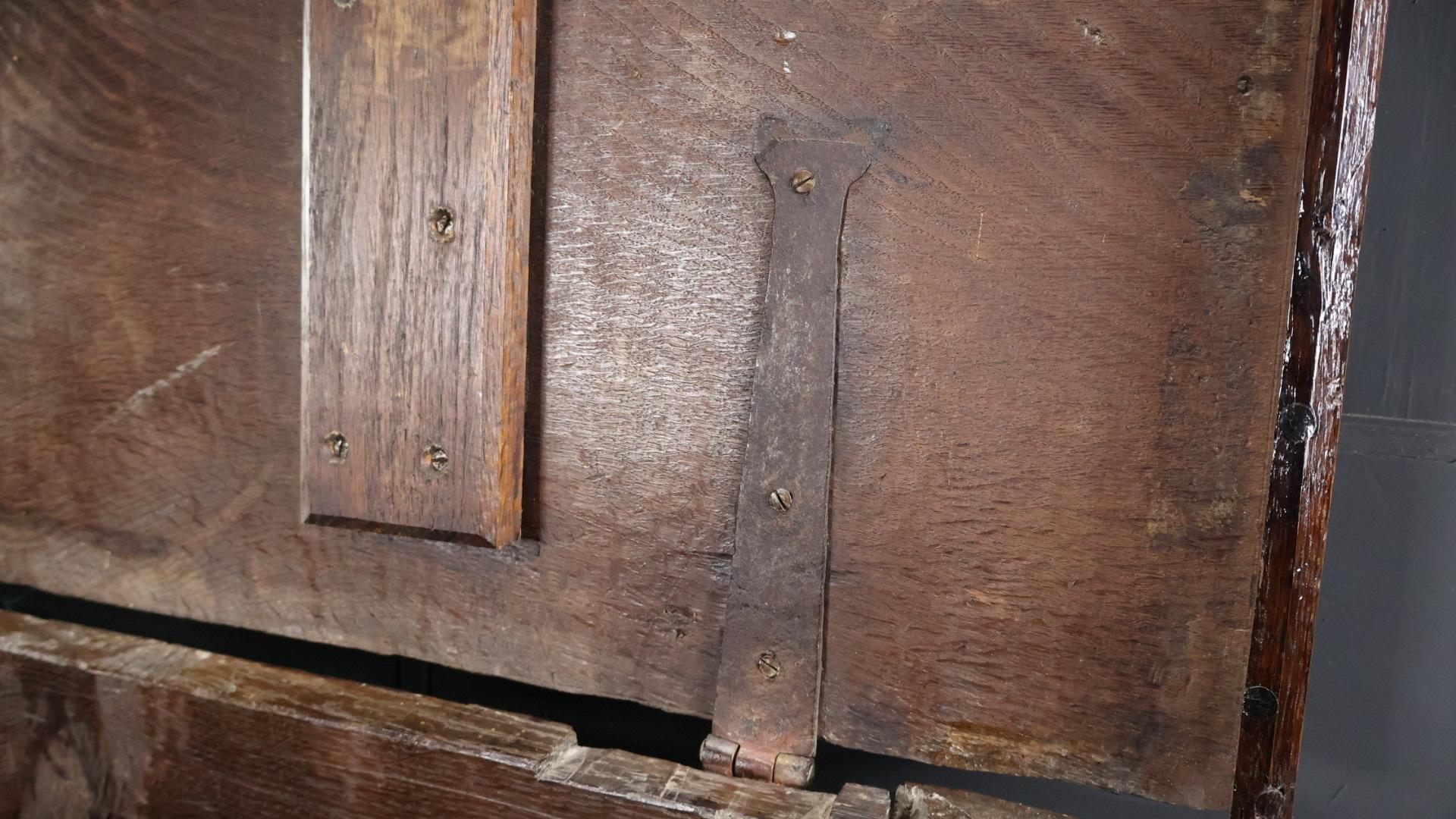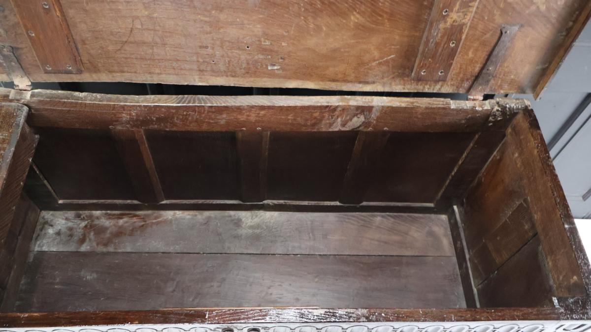 With decorative, detailed carving, retaining its original wrought iron hinges and candle box.