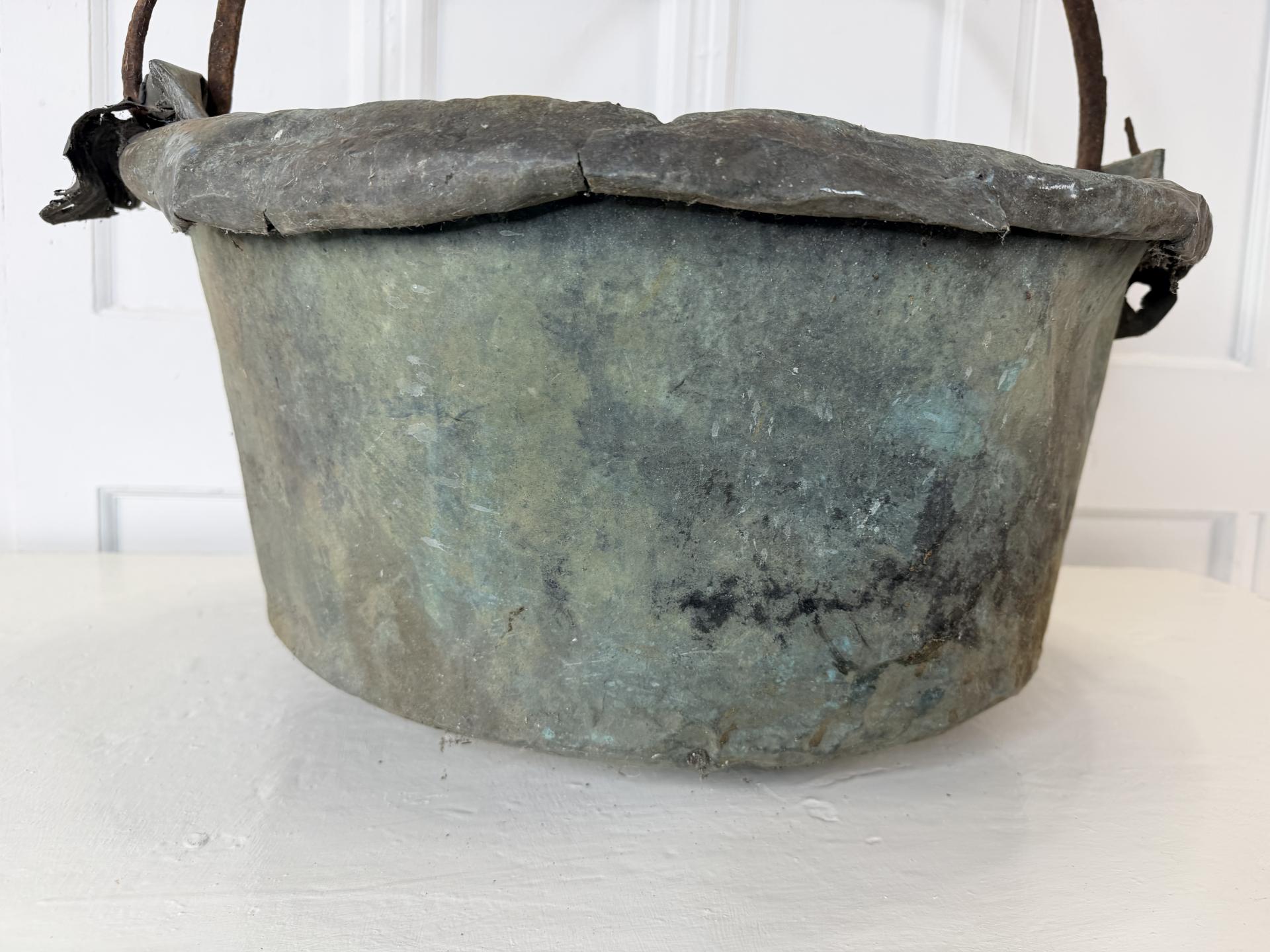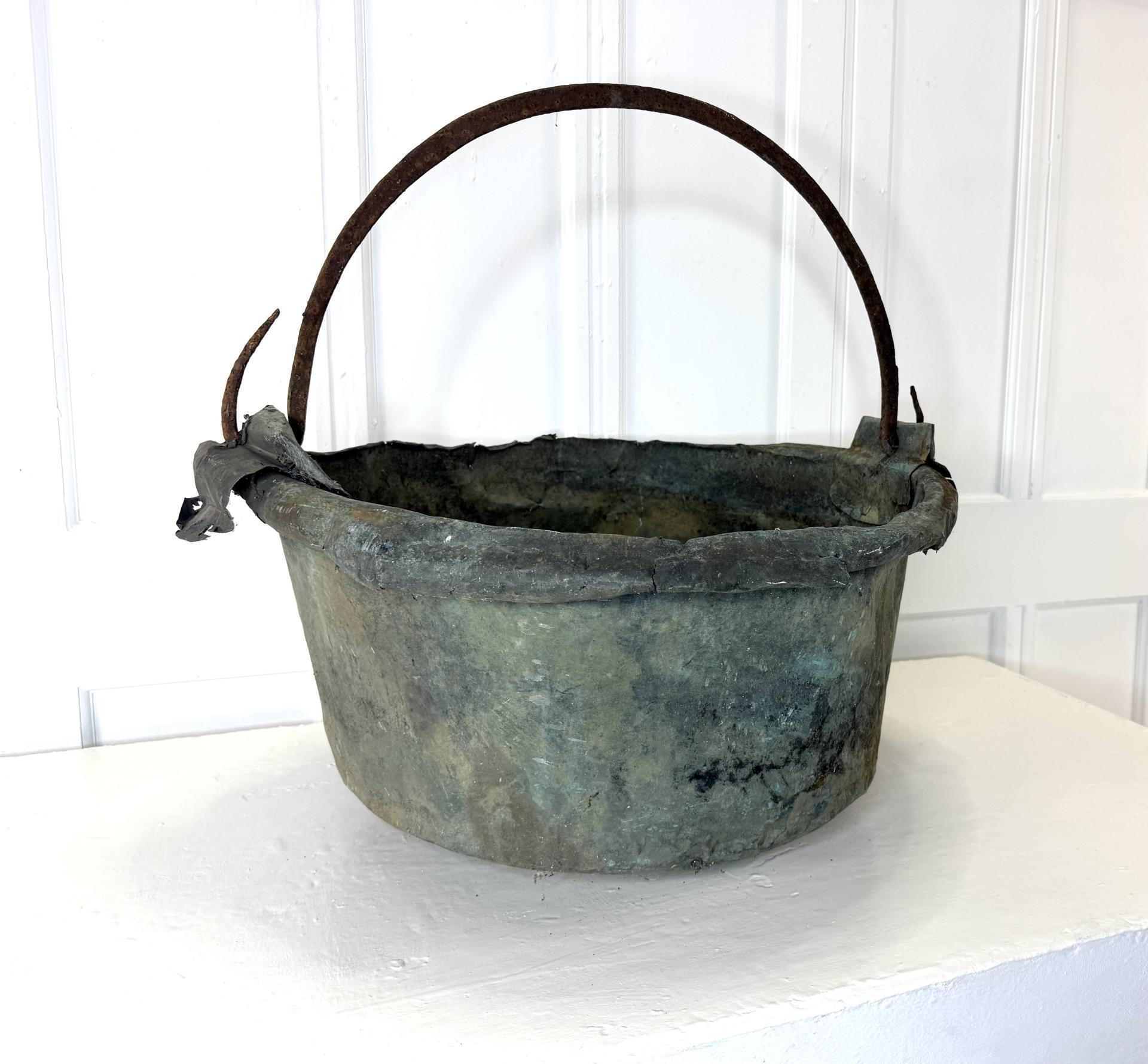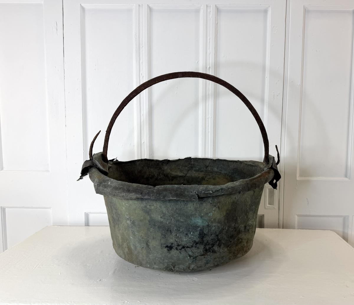 A large and well loved Victorian copper pot, with a handmade wrought iron handle.
