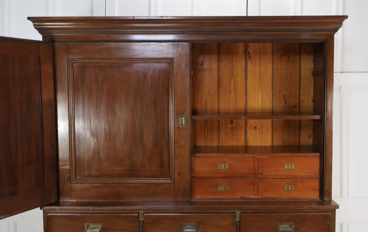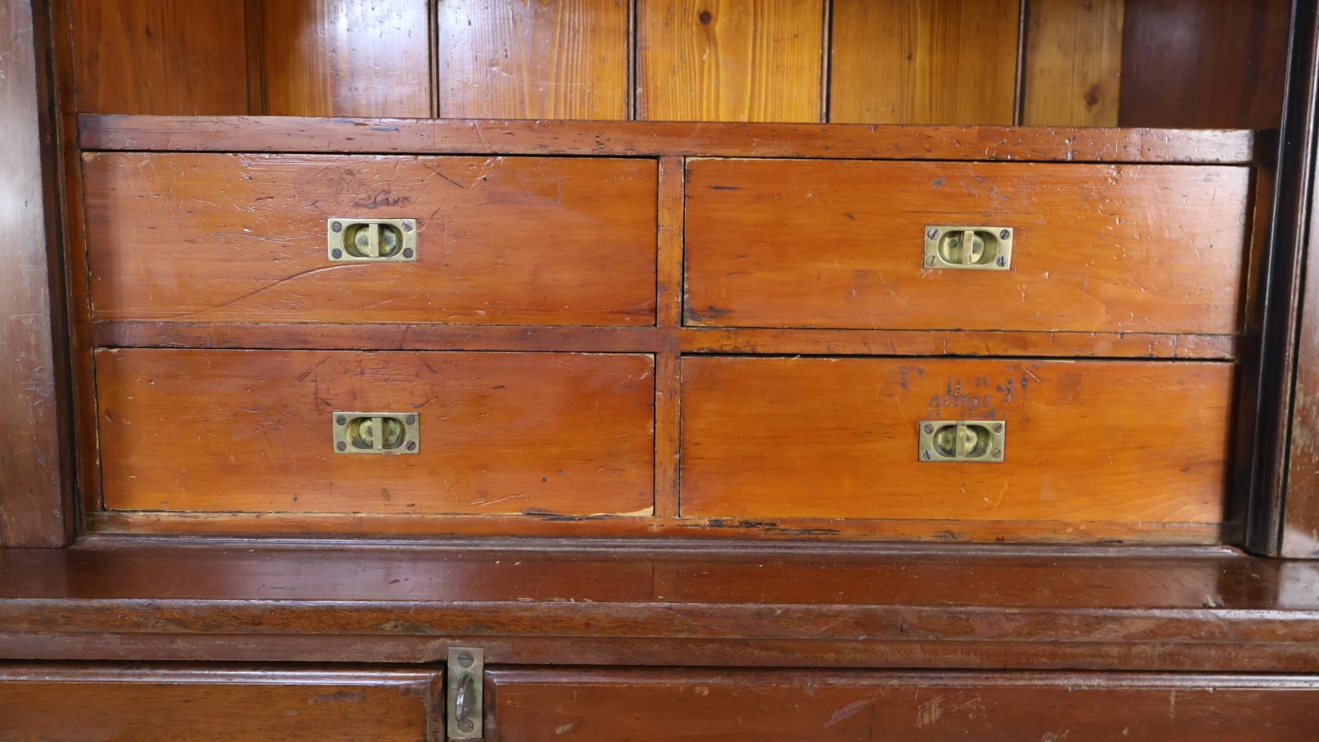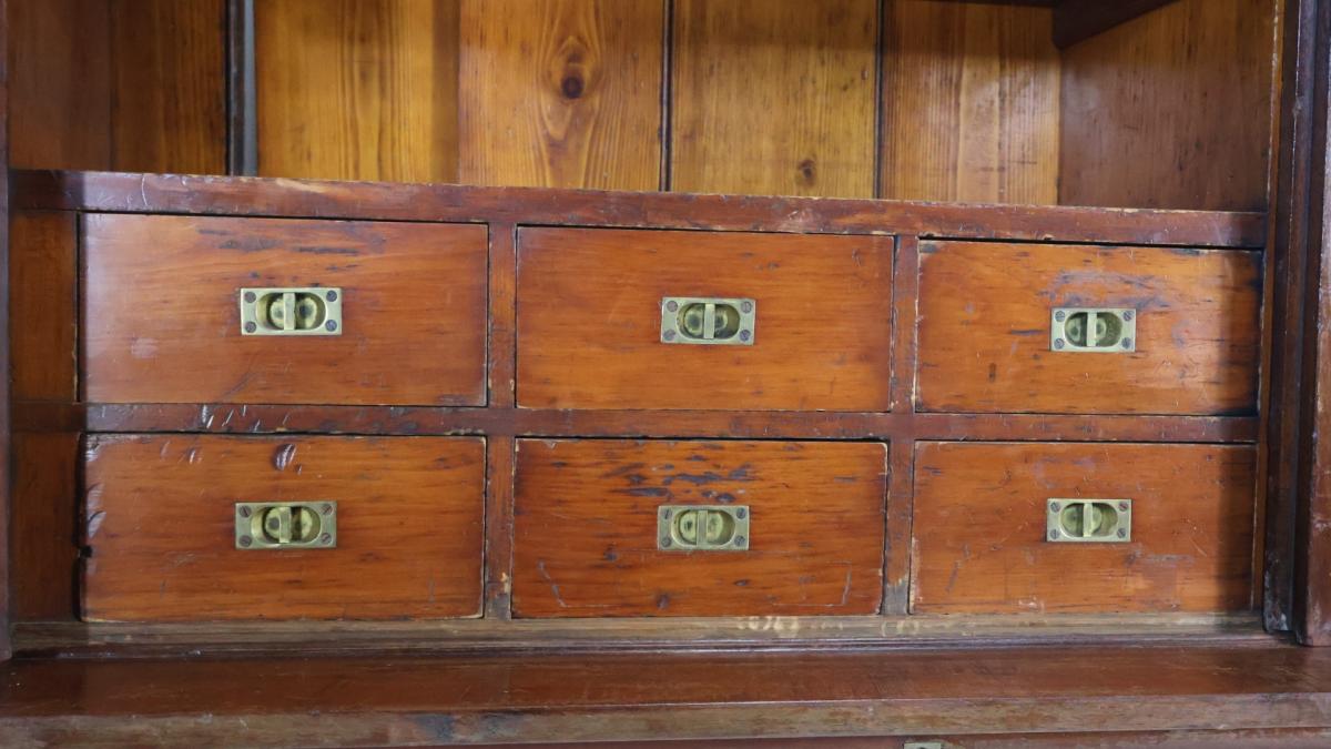 The top section comprises of one hinged door with 3 shelves behind and 6 small drawers, each with pinched brass handles and dovetail joints.