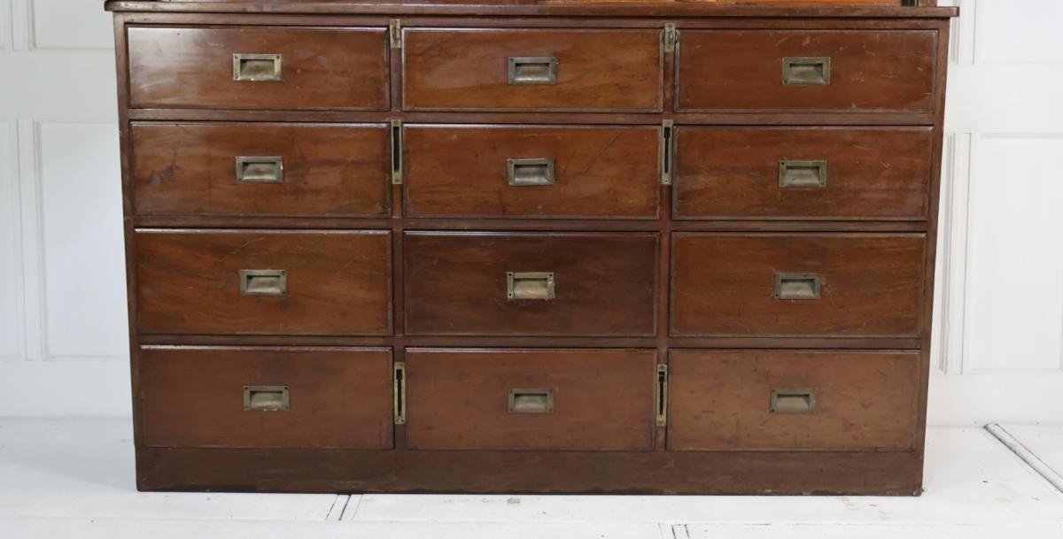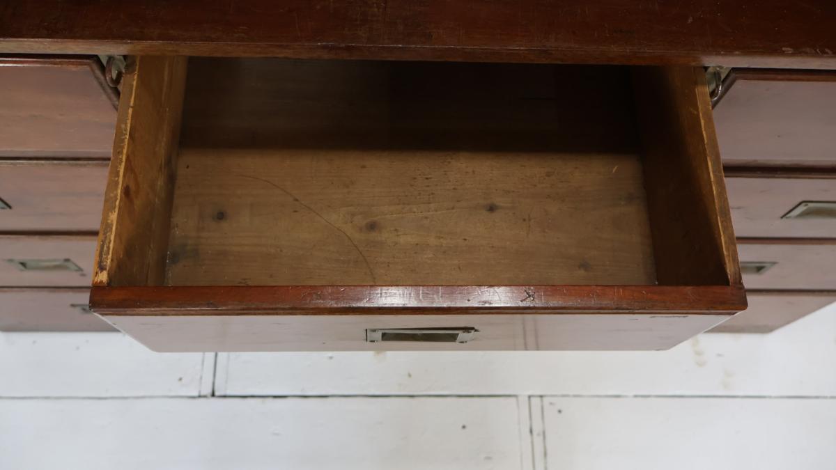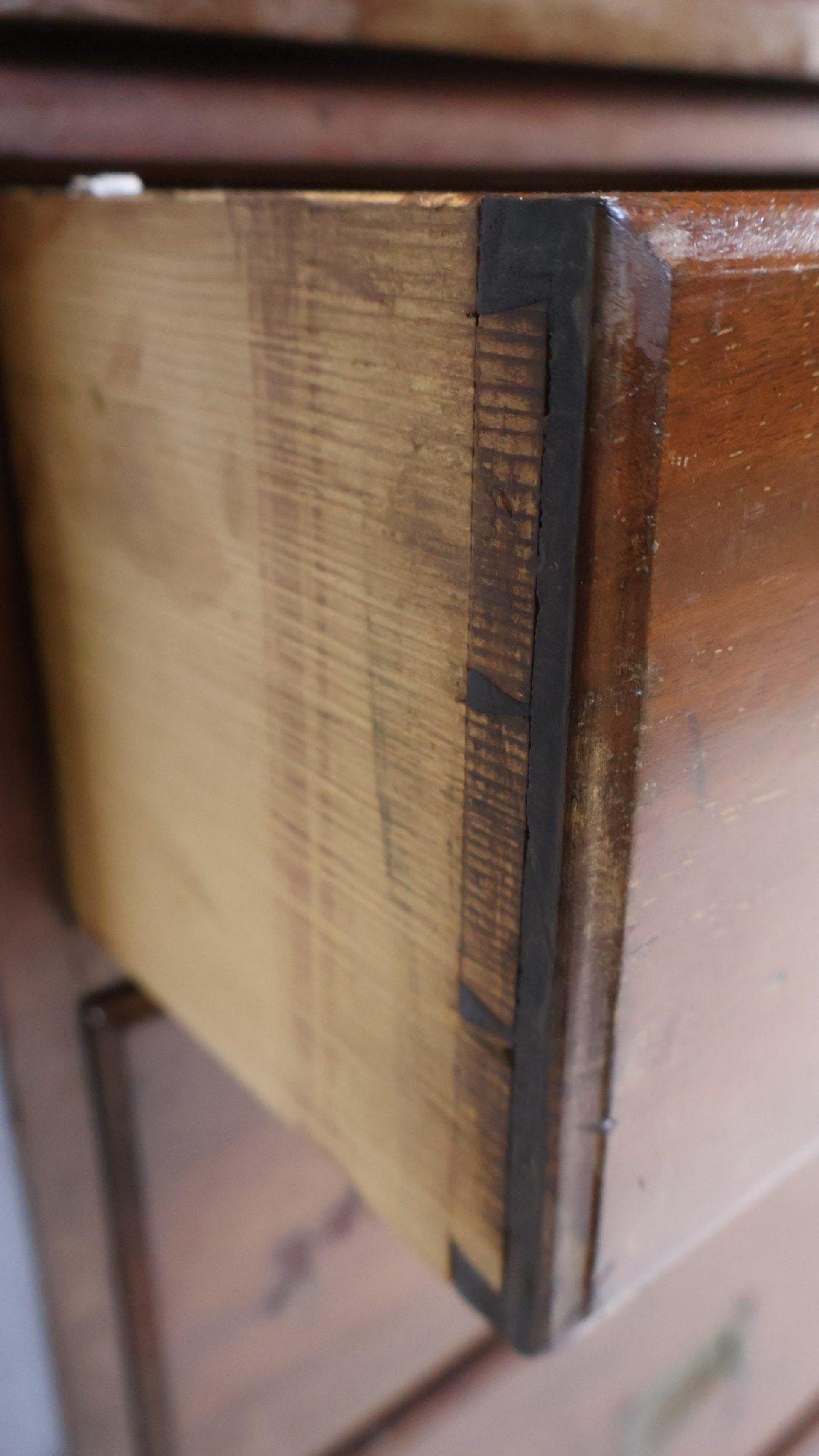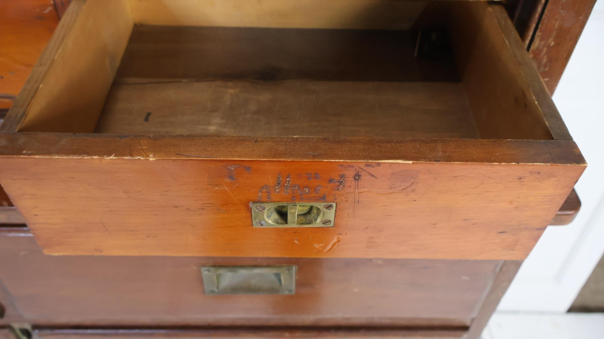 Comprising of 2 sections, a lower bank of drawers, with each drawer retaining the original brass inlaid cupped handles and dove tailed joints.
