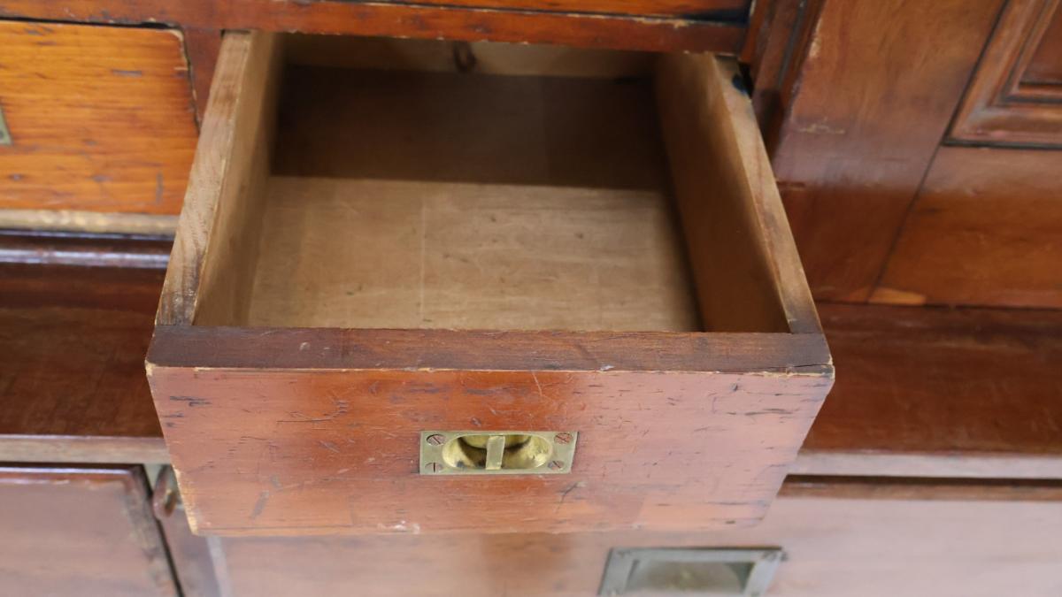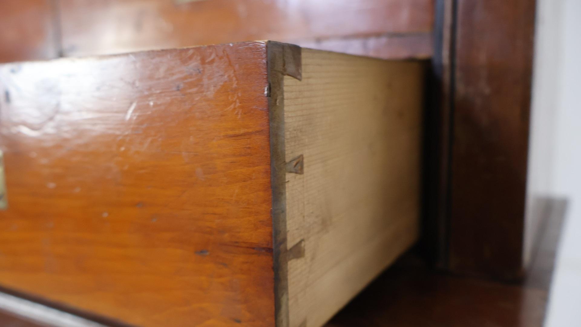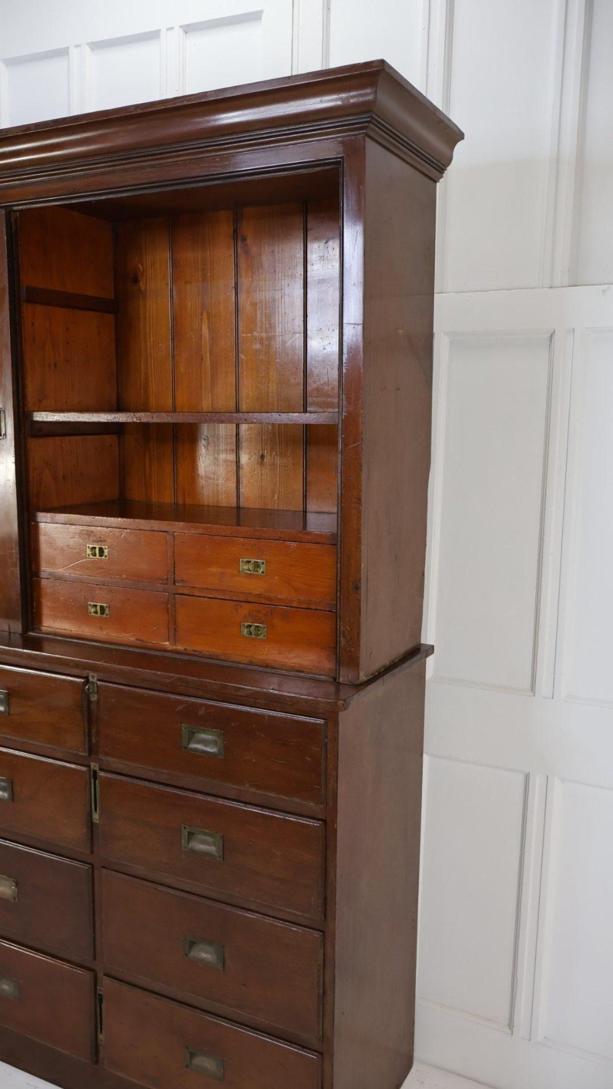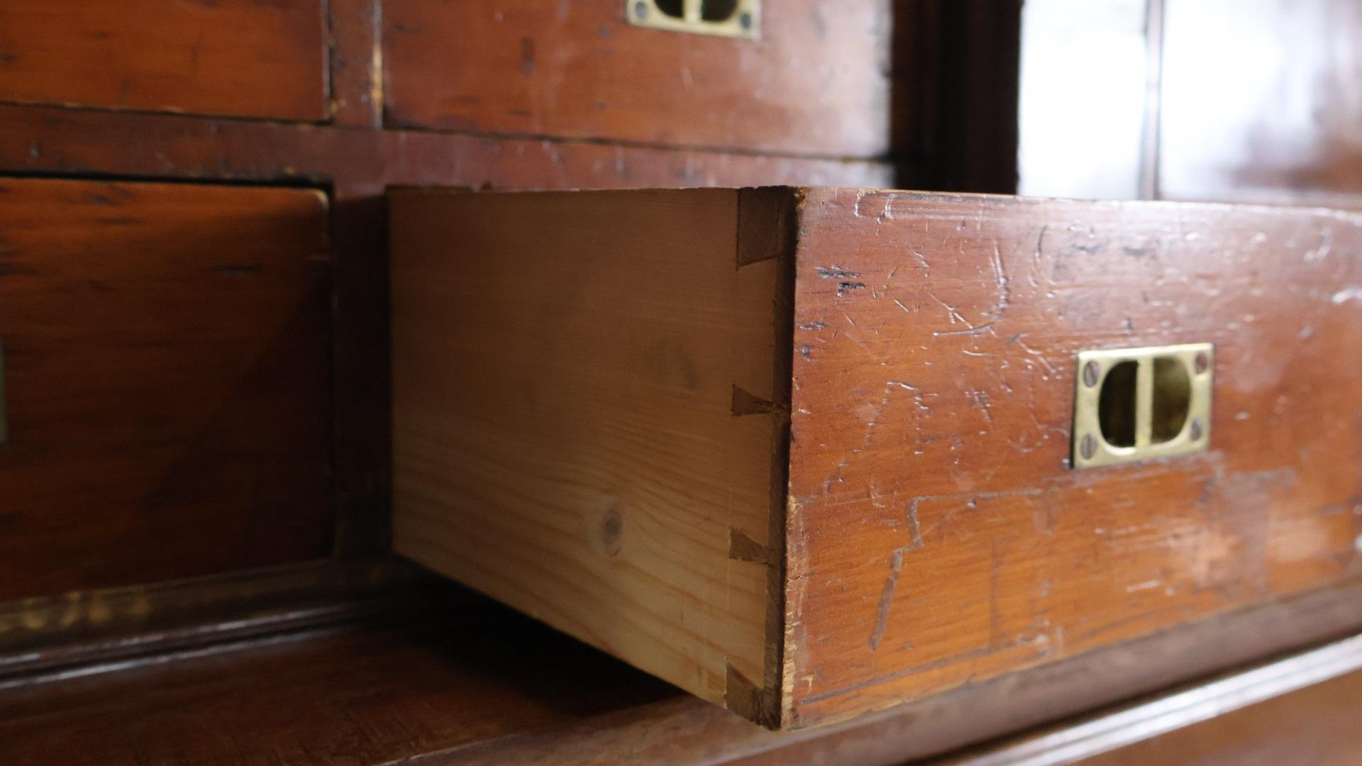 Comprising of 2 sections, a lower bank of drawers, with each drawer retaining the original brass inlaid cupped handles and dove tailed joints.