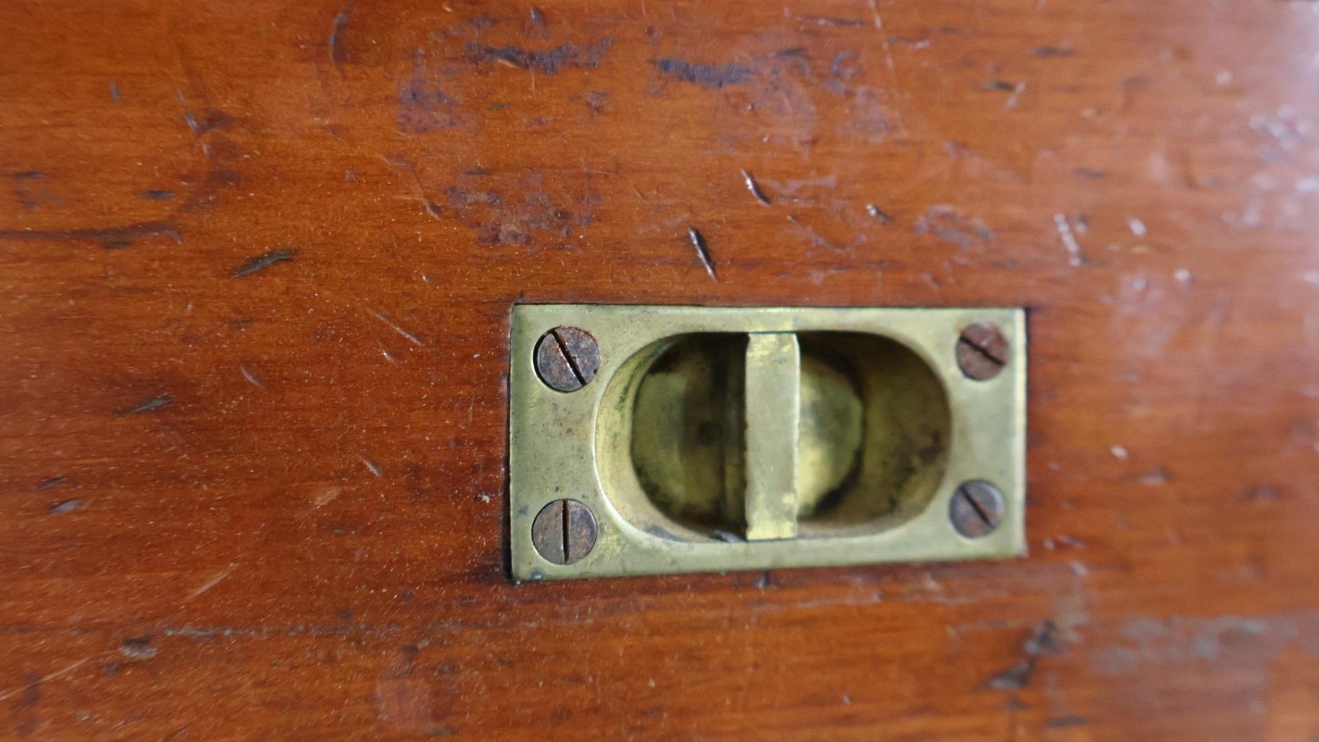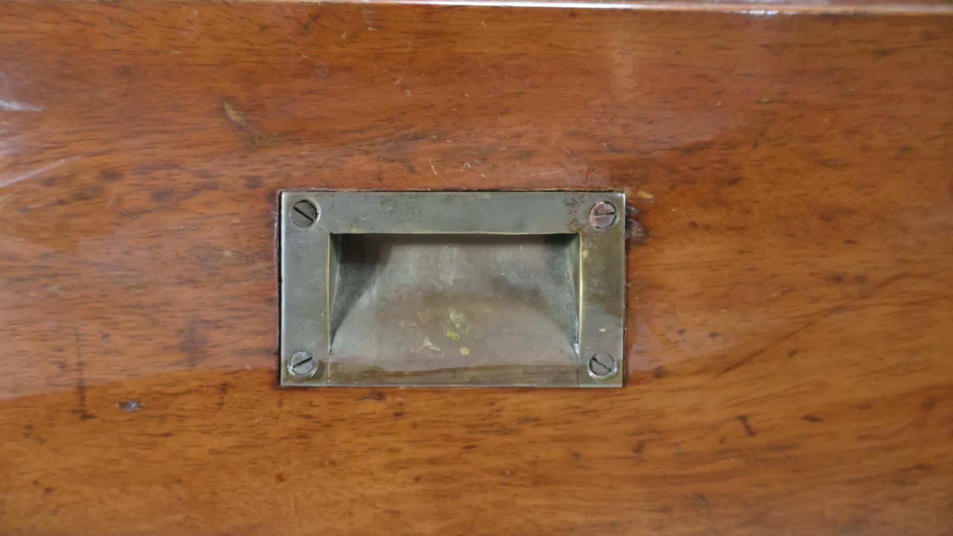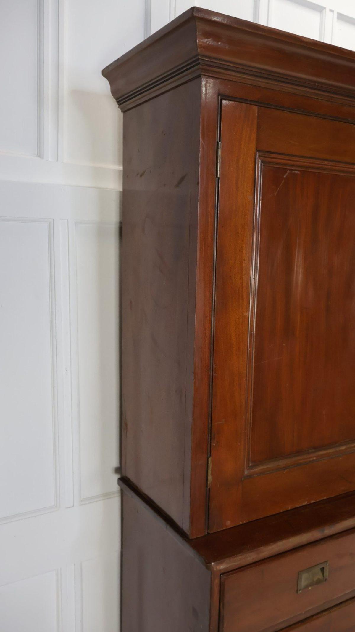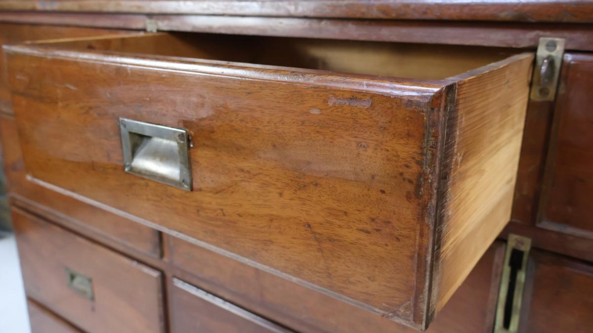Comprising of 2 sections, a lower bank of drawers, with each drawer retaining the original brass inlaid cupped handles and dove tailed joints.