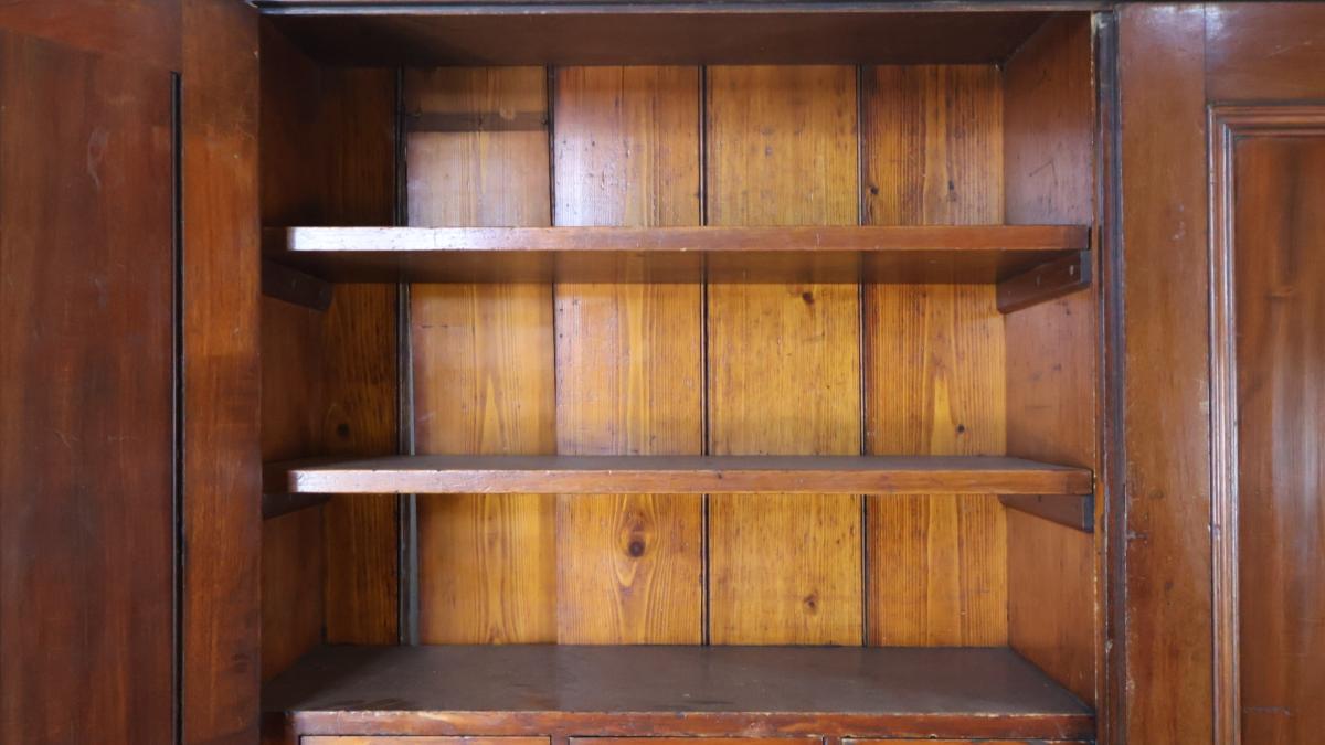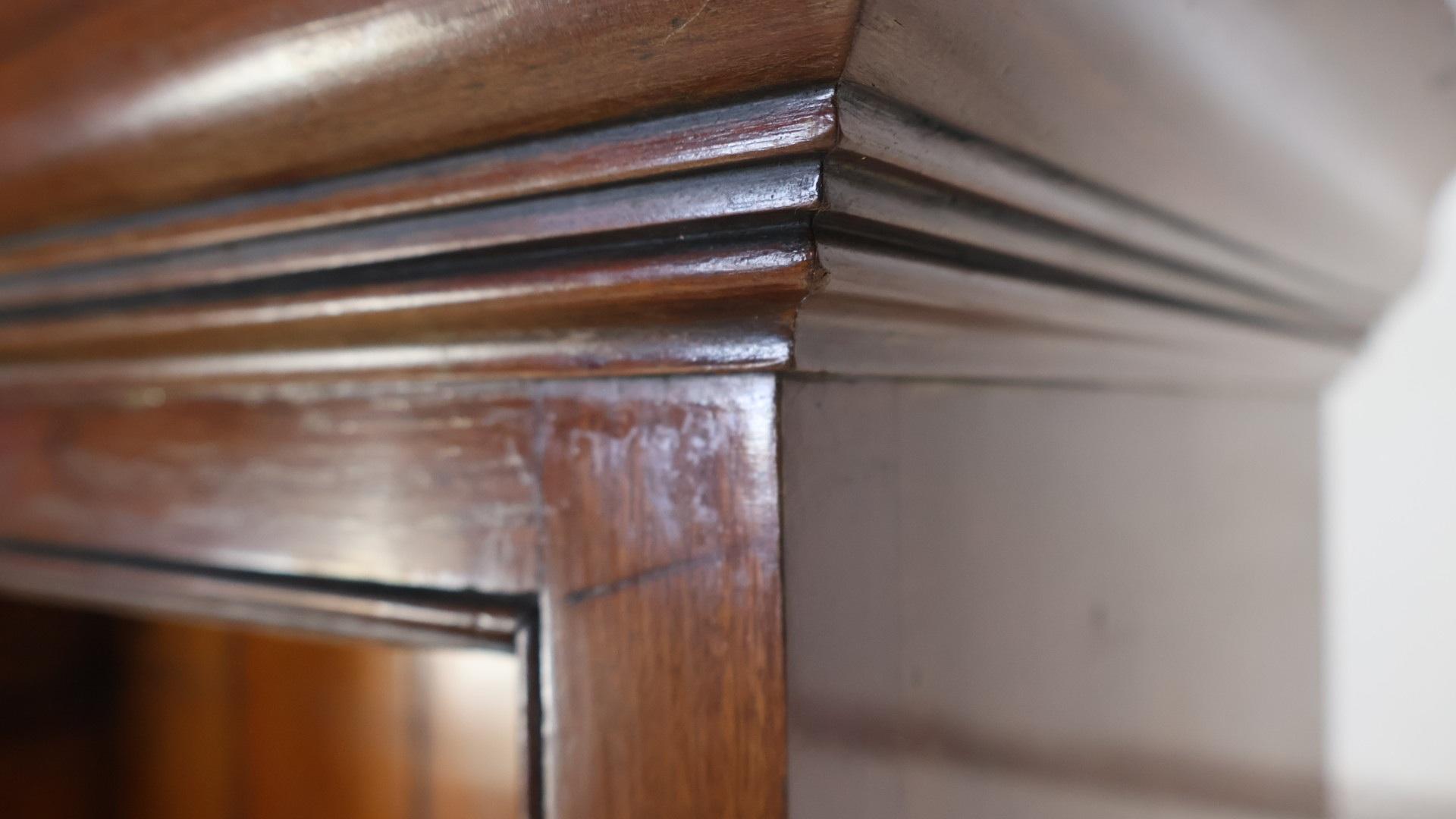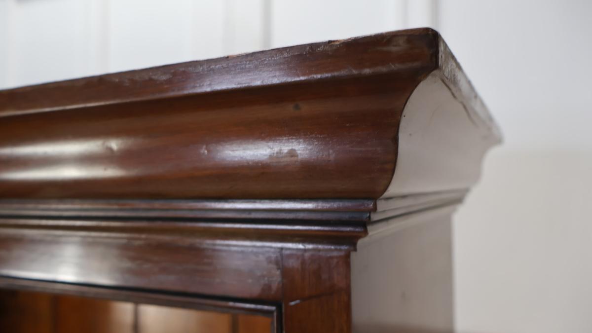 The cornice and sides are in good condition, and both sections of the cabinet have their original backboards.