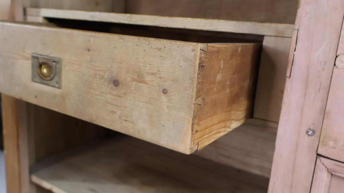 The inside comprises of 4 shelves and a single deep drawer, with dovetailed joints and original brass inlaid handle.