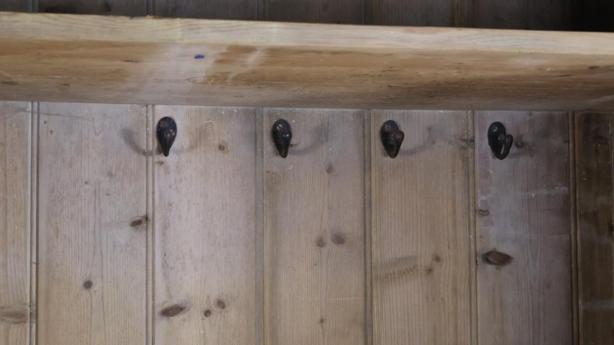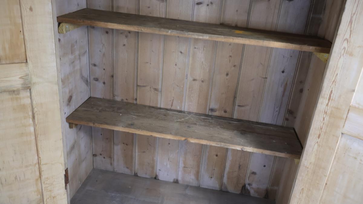 Comprising of 2 doors with wooden knobs and brass keep, 3 large, deep shelves and 4 cast hanging hooks.