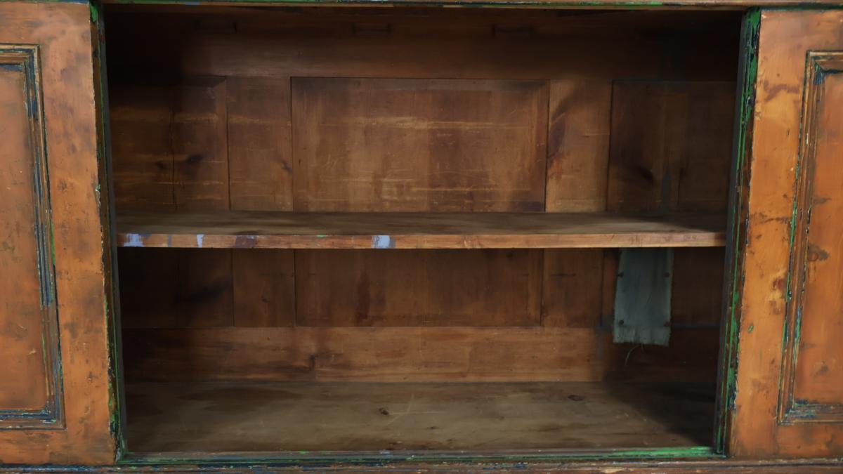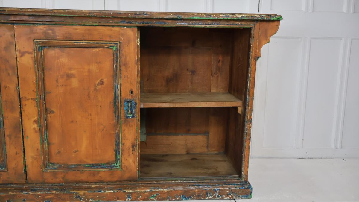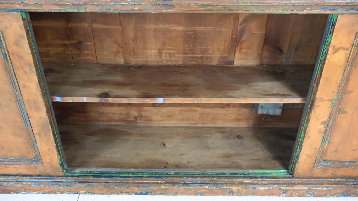 Comprising of 4 sliding doors, all running smoothly, exposing a large, shelved storage space, and a painted panelled back.