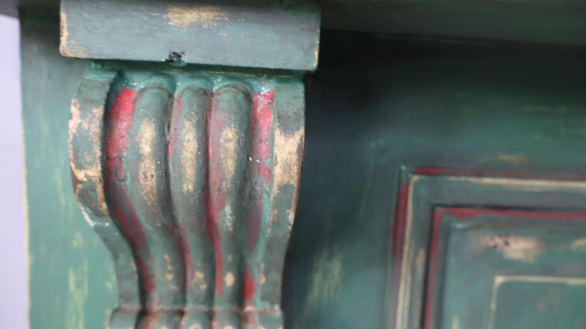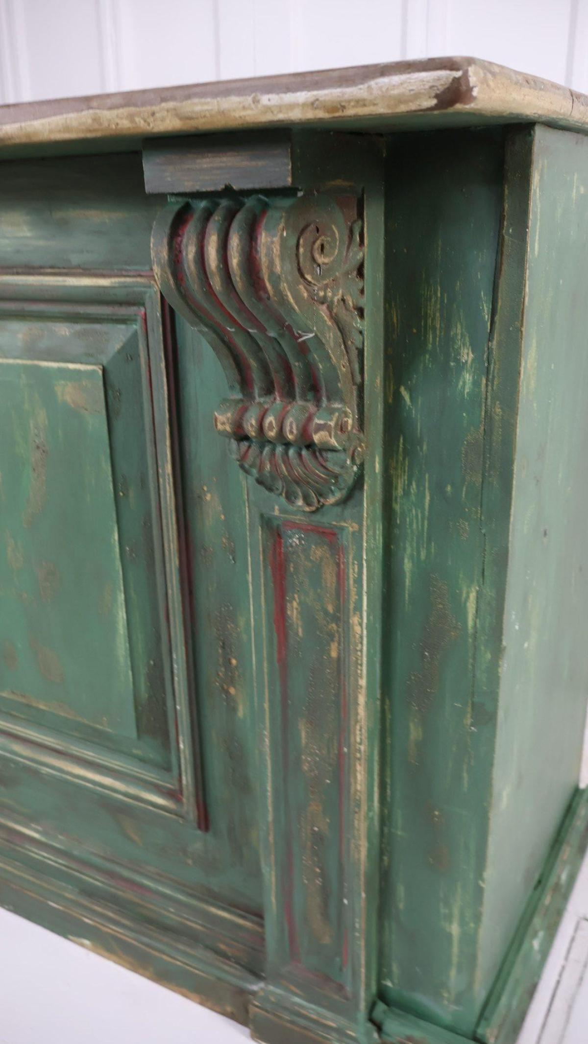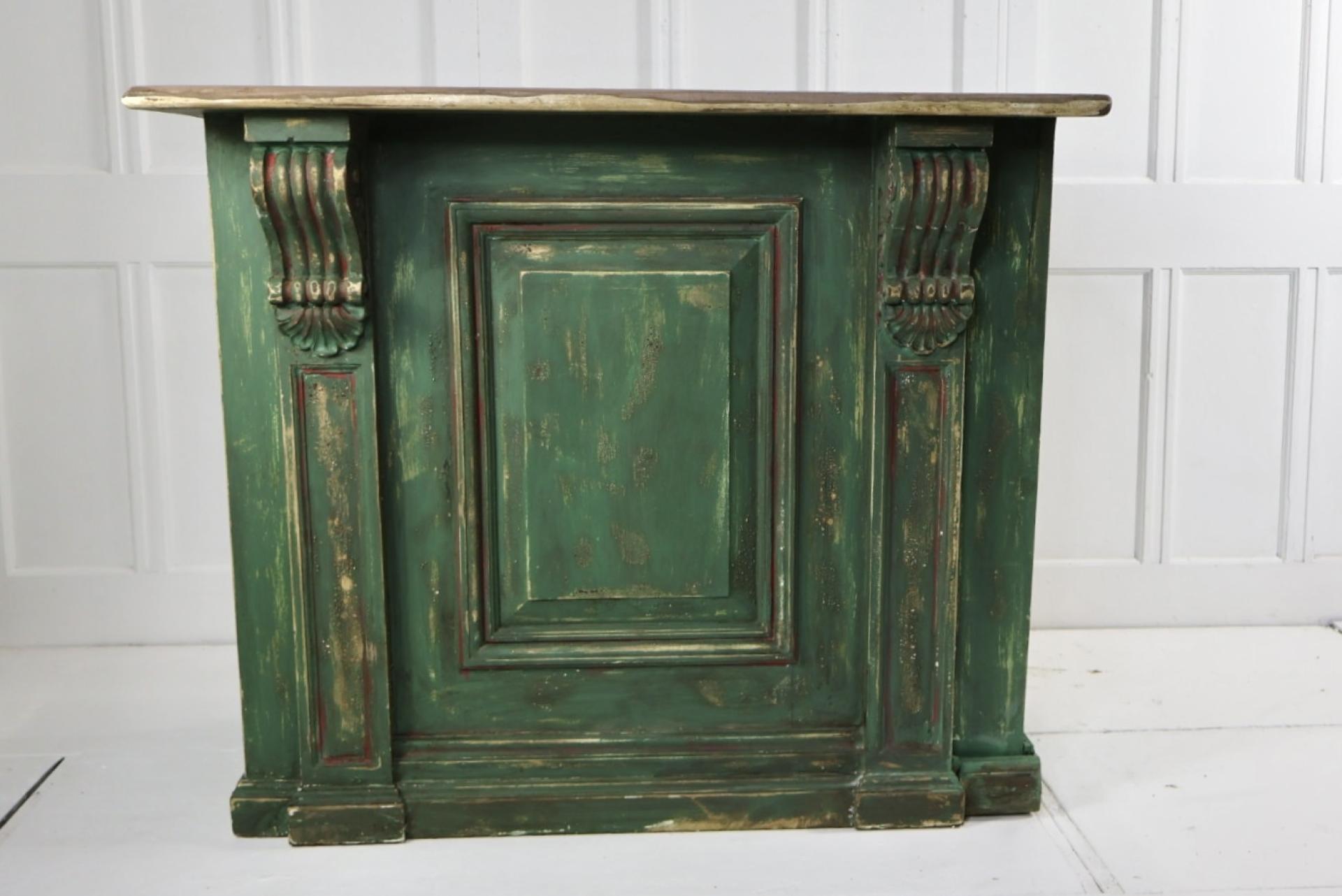 The base has a green paint finish, with hand carved wooden corbels supporting the clean pine top.