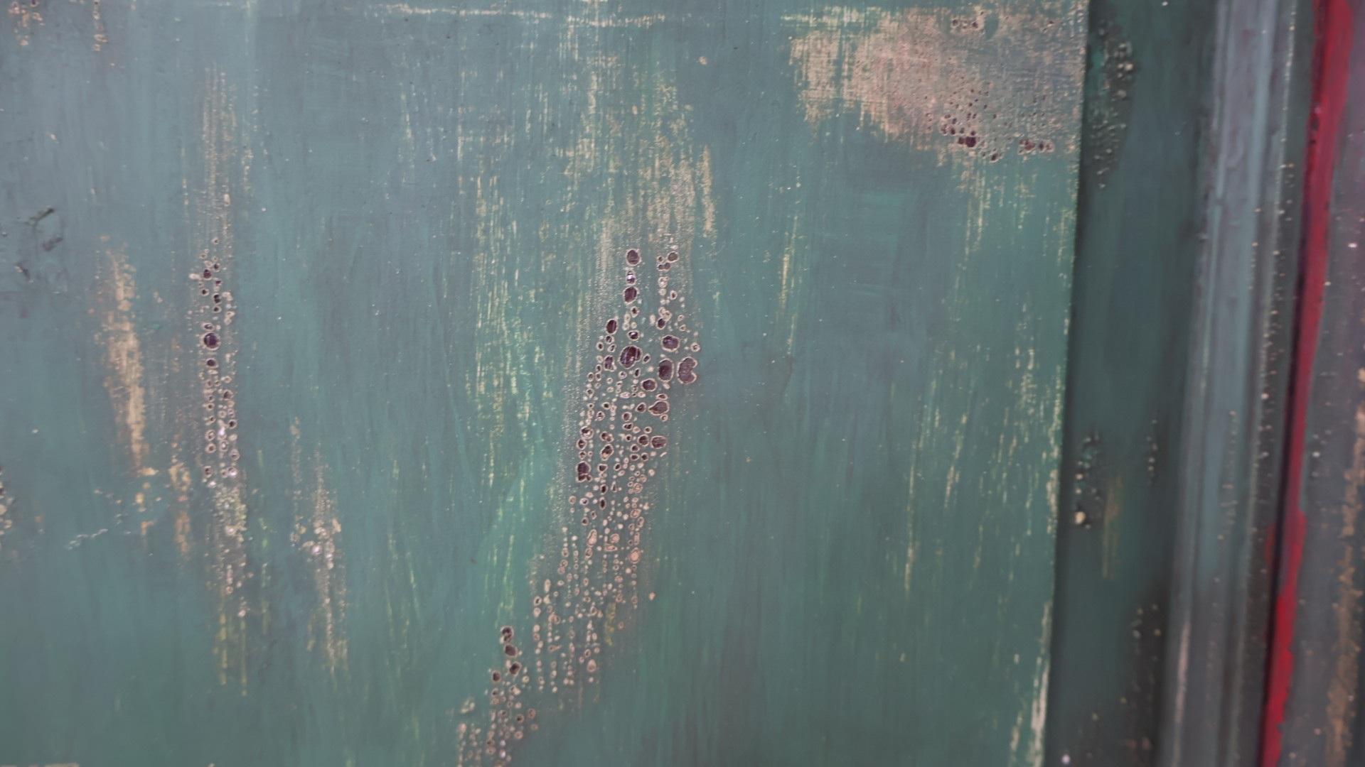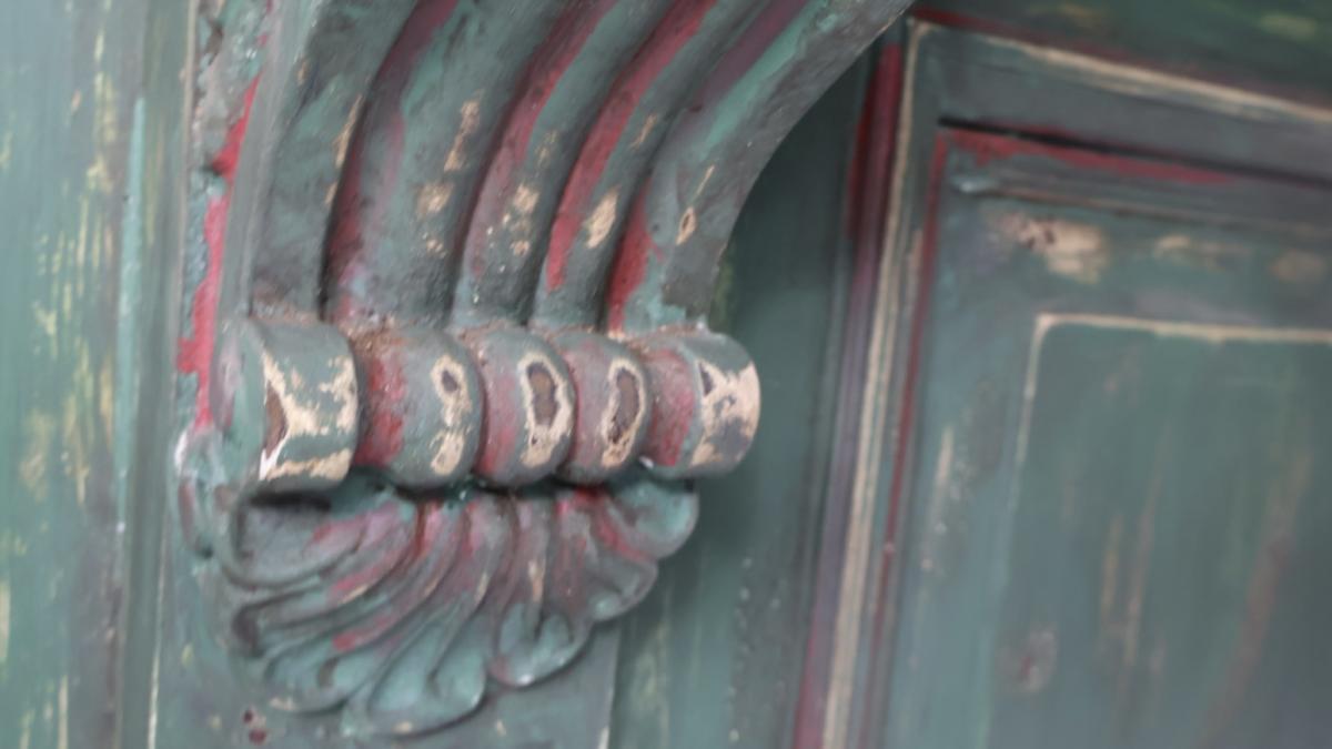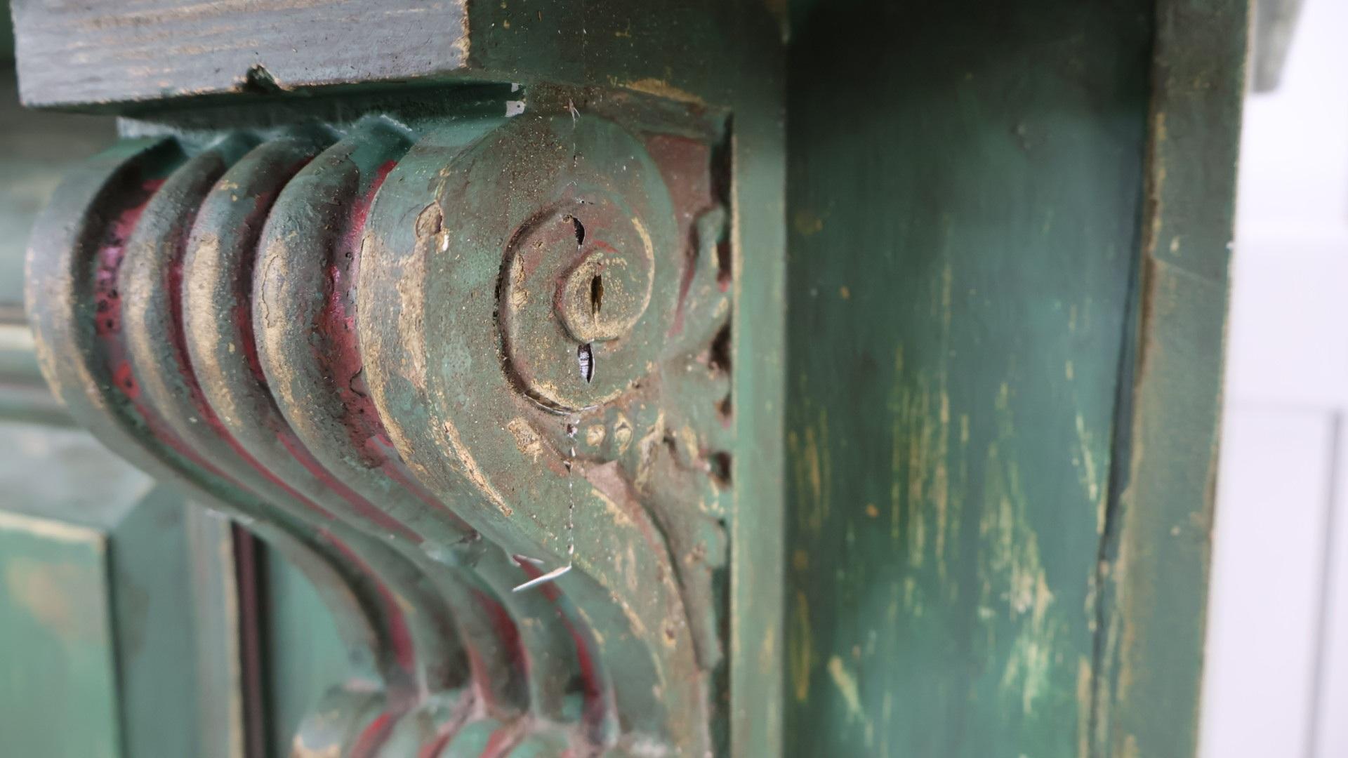 The base has a green paint finish, with hand carved wooden corbels supporting the clean pine top.
