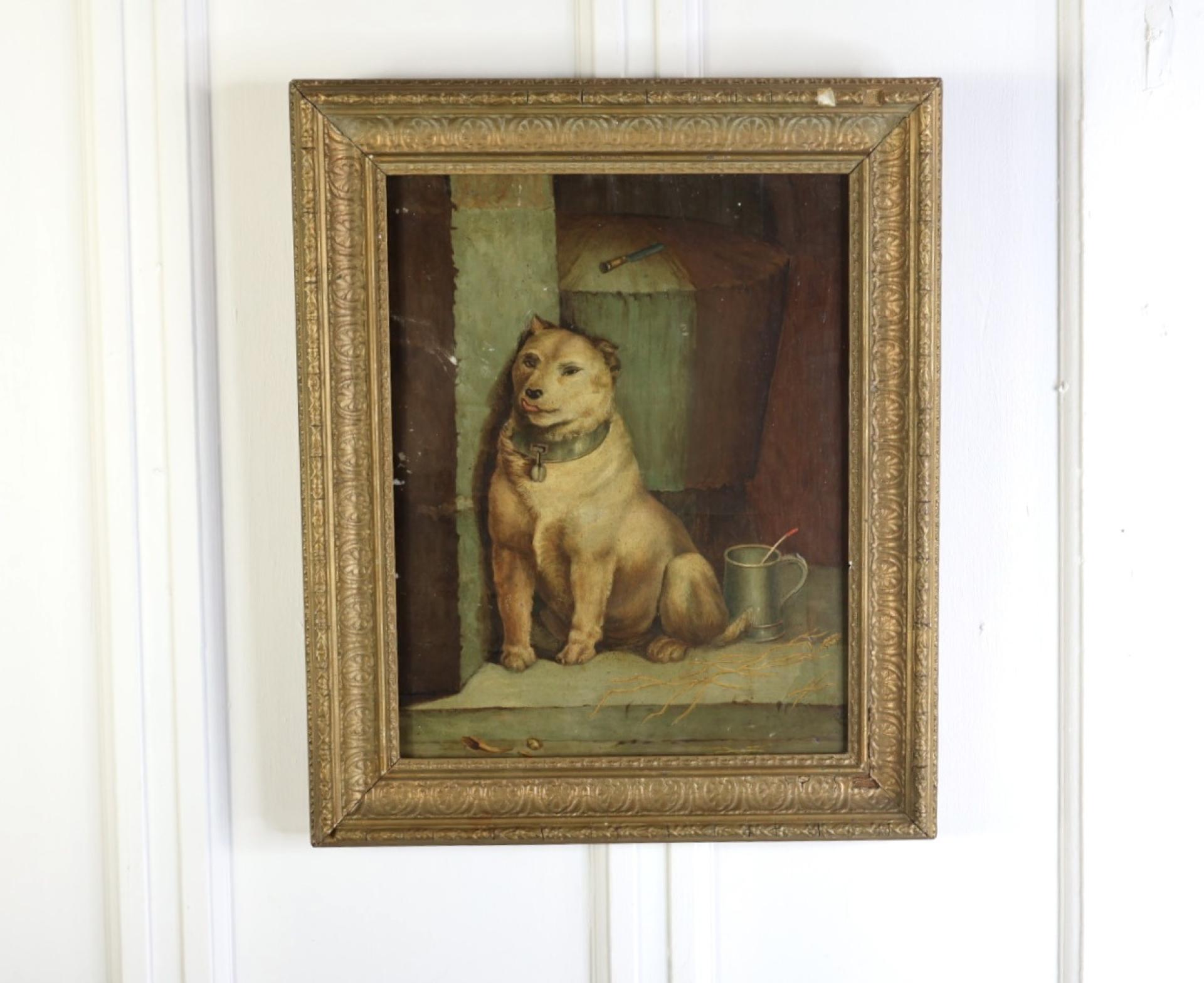 A wonderfully naive and primitive 19thc oil of a large dog, in its original period frame.