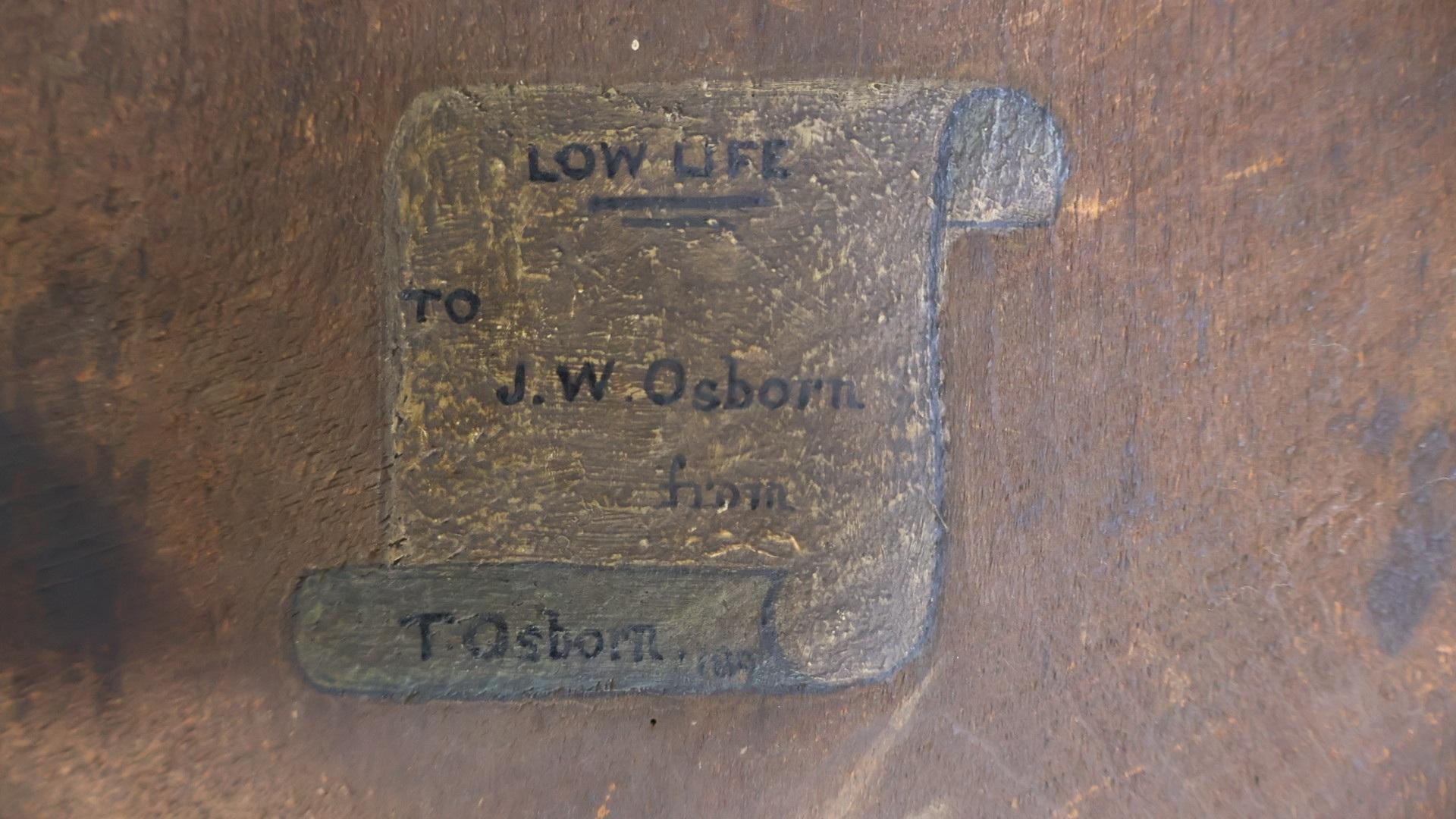 In remarkably good condition, titled “Low Life”, painted by a T Osbourne and given to a J W Osbourne in 1894.