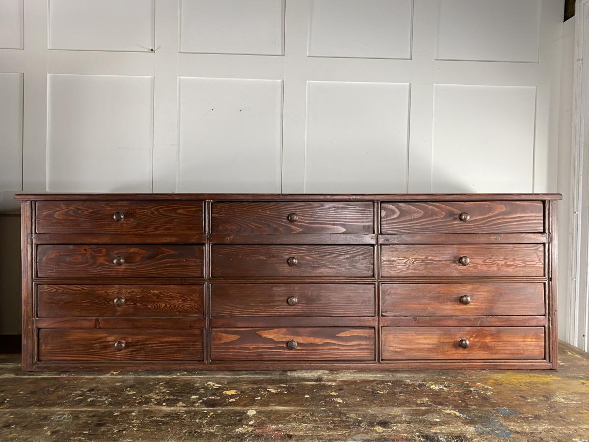 English, early 1900s large bank of drawers that were originally used in an upholsterers shop.
