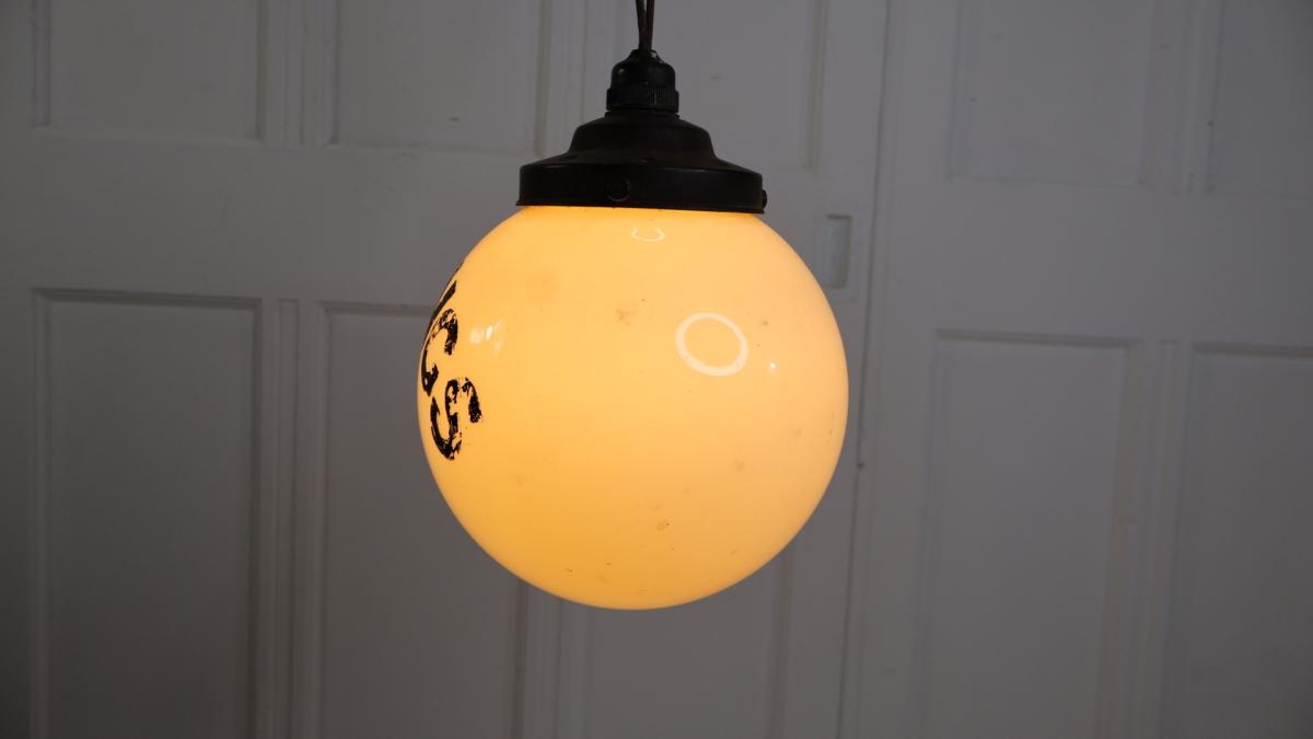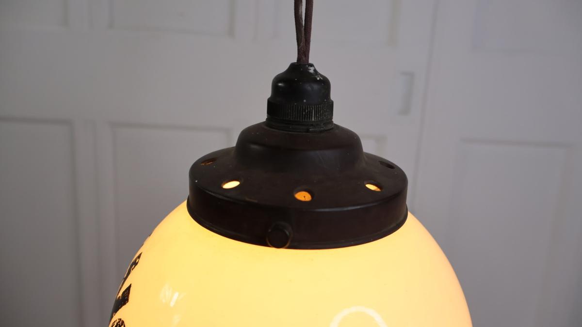 The light comprises of hand painted wording over the milk glass shade and retains its original copper gallery.