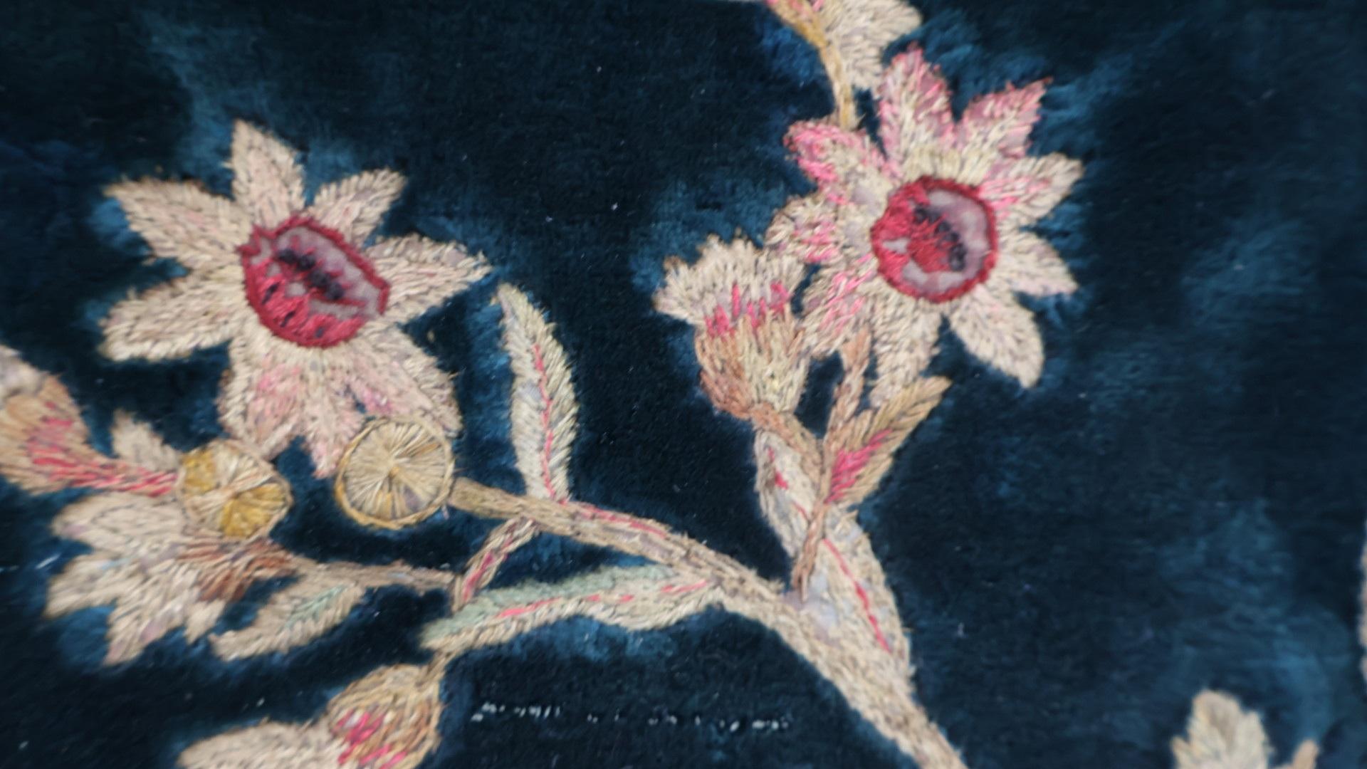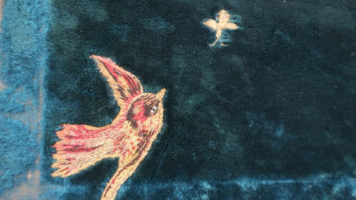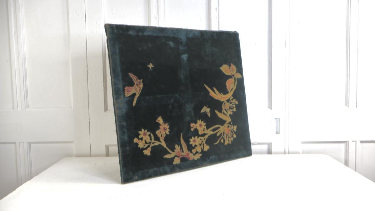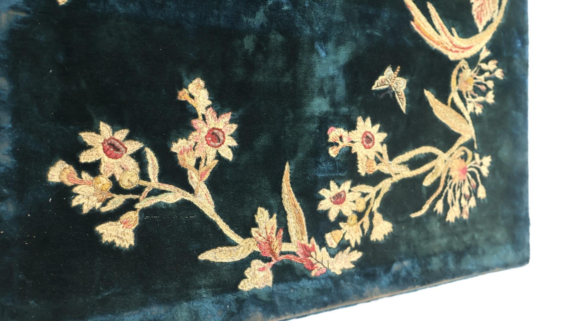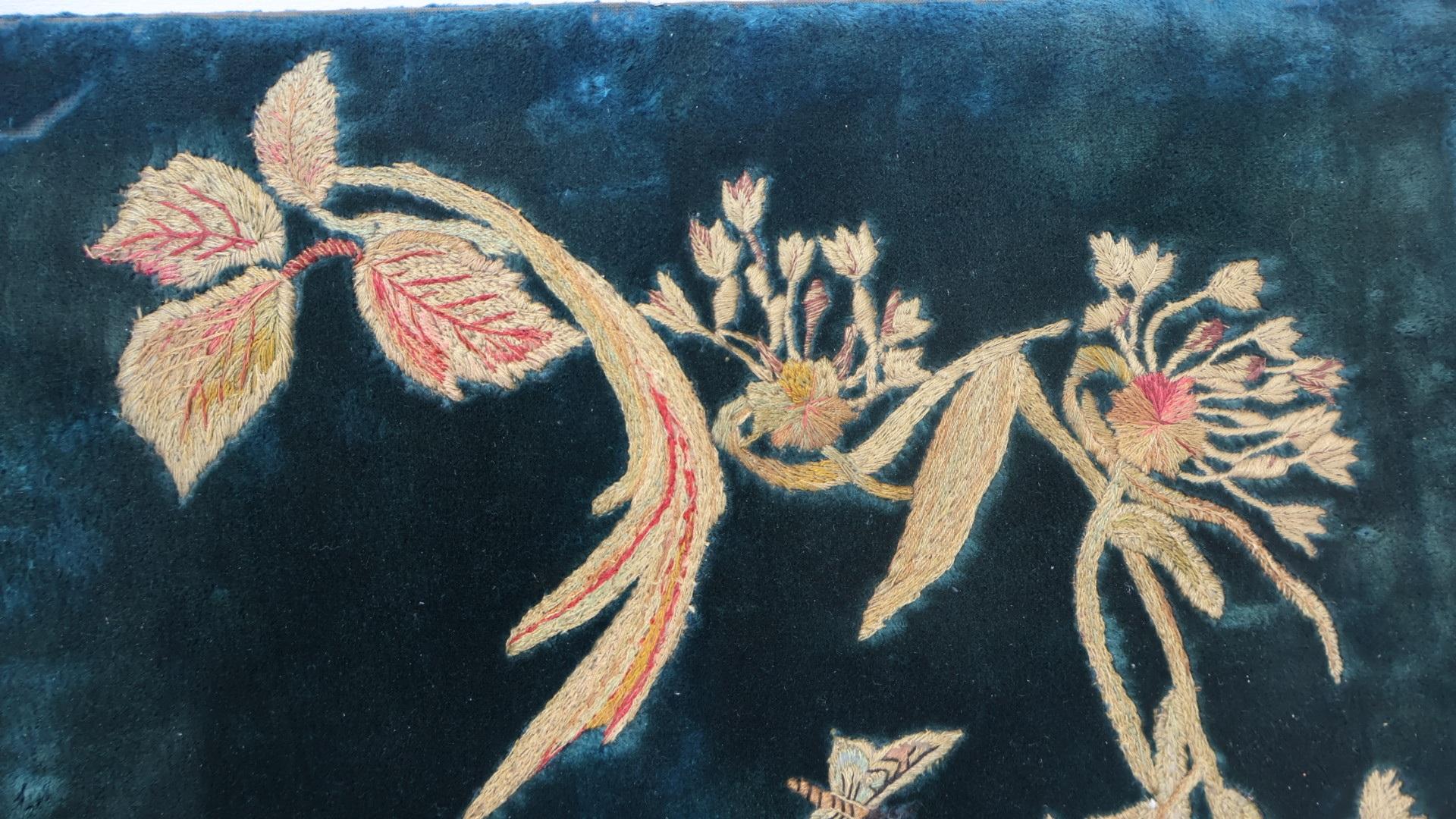 Very decorative, 19thc, hand stitched Chinoiserie panel depicting a bird flying above flowers.