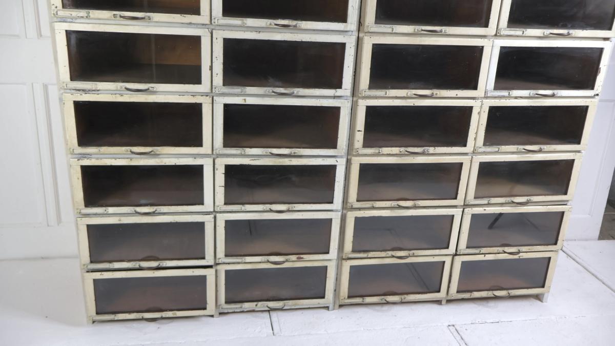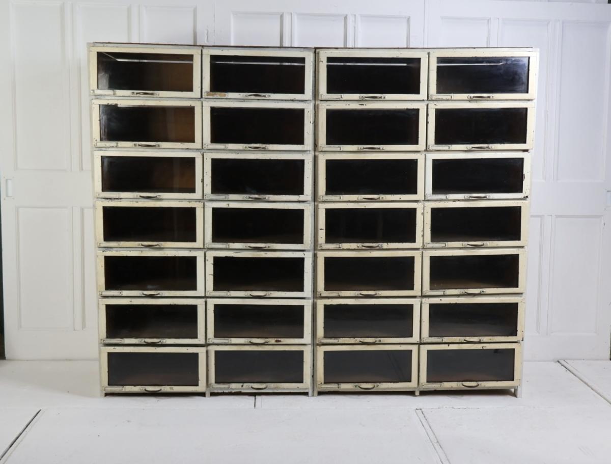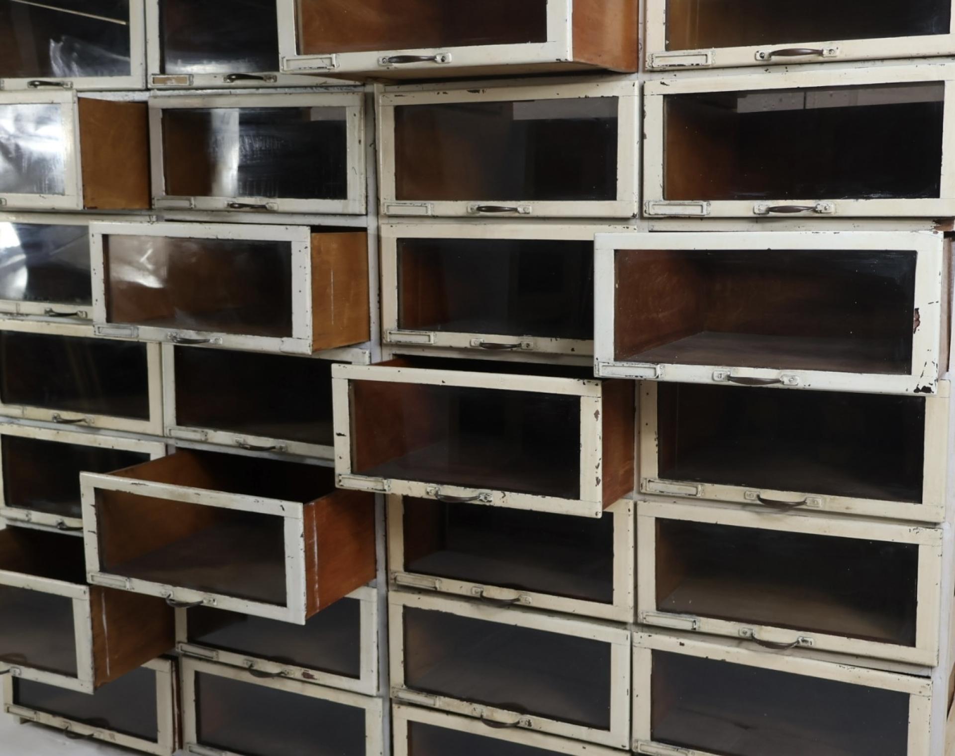 Comprising of 28 glazed oak drawers, with dovetailed joints, and retaining their metal high quality brass handles.