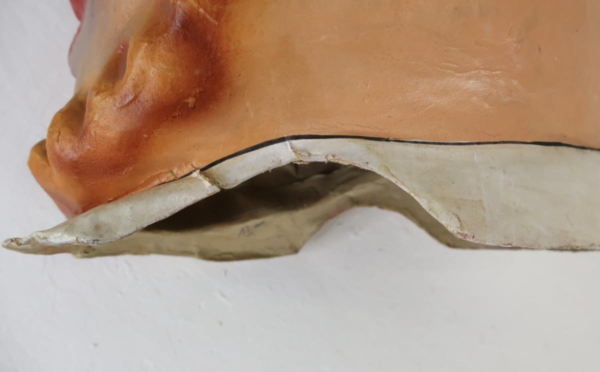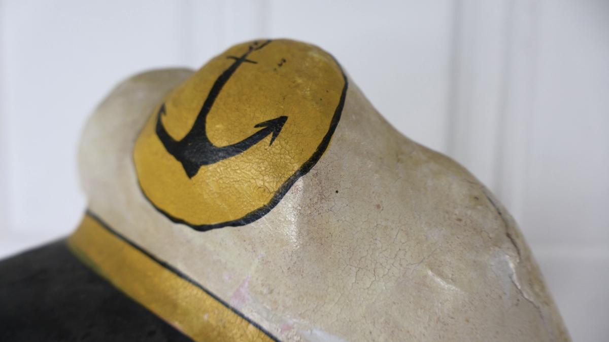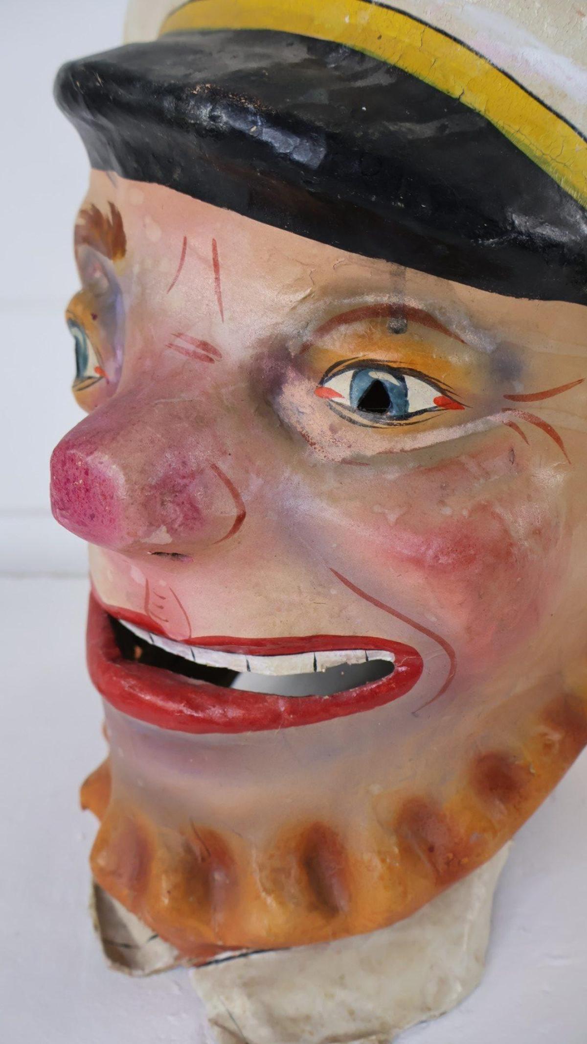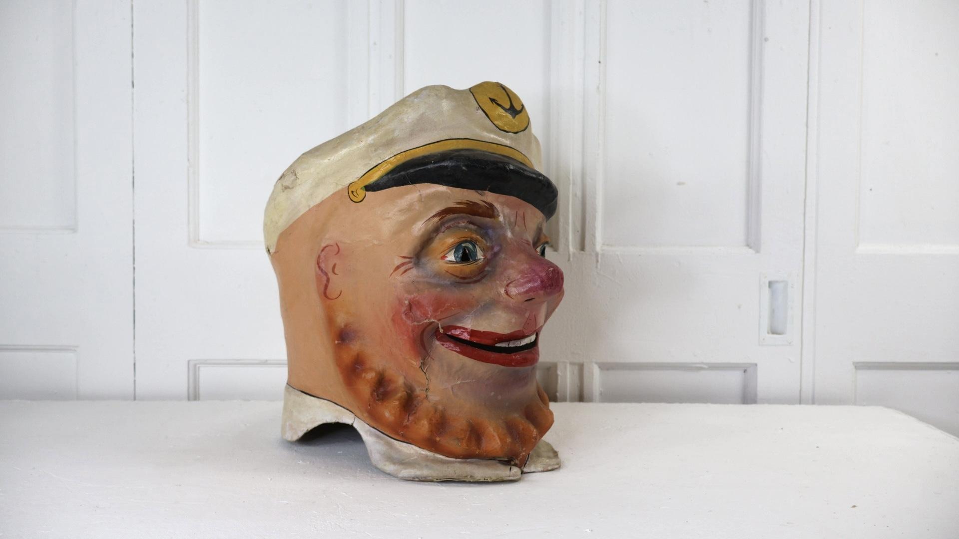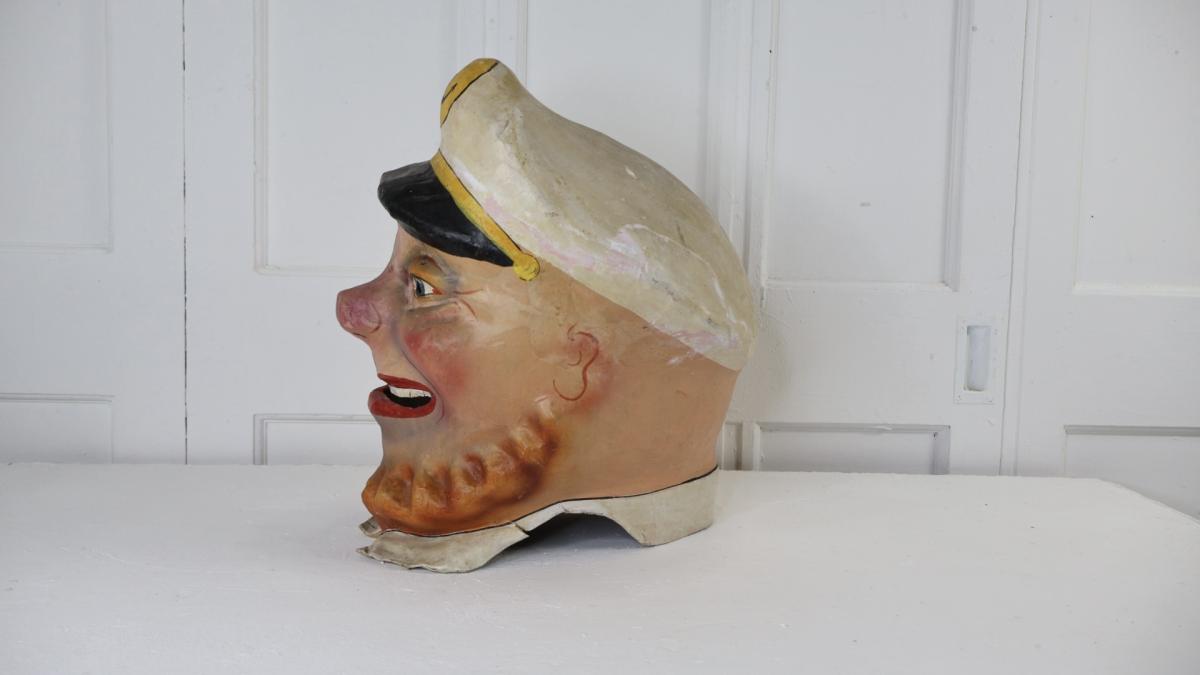 A 1940s, papier-mâché carnival mask of an old seaman, with a red nose and cheeks, ginger beard and a sailors hat.